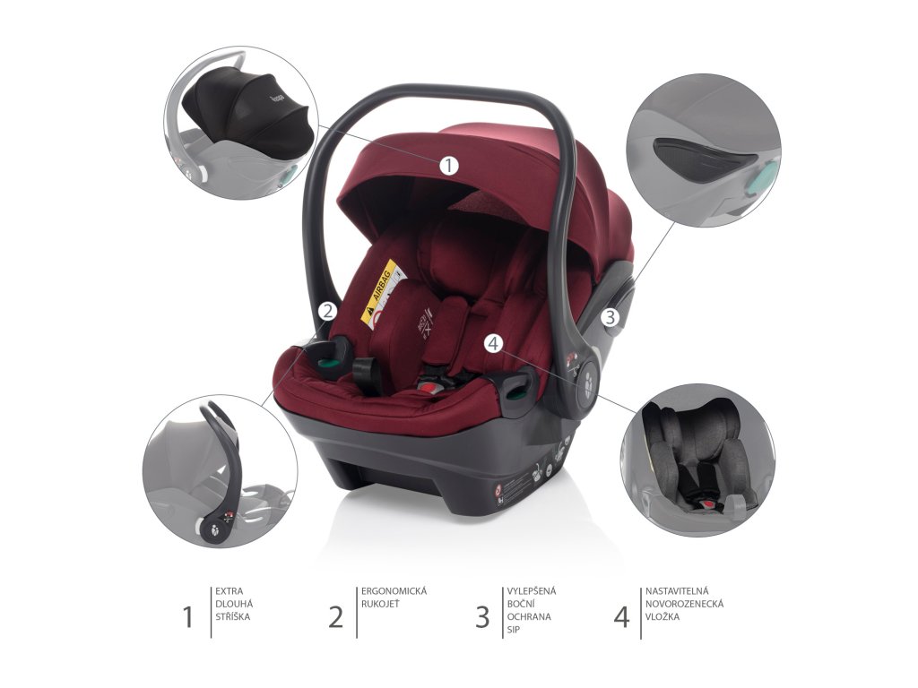 Autosedačka XS i-Size Perfektní boční ochrana, nastavitelná novorozenecká vložka z paměťové pěny, polypropylenový korpus, který ještě lépe pohlcuje náraz, testovaná v Evropě – to je autosedačka XS i-Size.Od narození do 80 cm. Maximálně bezpečná novorozenecká autosedačka U autosedaček je nejdůležitější bezpečí. Proto autosedačka XS i-Size prošla nejpřísnějšími bezpečnostními testy v Evropě a splňuje nejnovější bezpečnostní normu i-Size. Korpus je vyroben z polypropylenu, který dokáže perfektně pohltit případný náraz. Ochranu při bočním nárazu poskytuje nová technologie SIP. Autosedačka, která se přizpůsobí rostoucímu dítětiAutosedačka XS i-Size je určená od narození až do 80 cm. Po celou dobu používání bude pro děti maximálně pohodlná díky novorozenecké vložce, která se dá postupně, jak dítě roste, upravovat. Nastavitelná je také hlavová opěrka z paměťové pěny. Ve chvíli, kdy se nastavuje výška hlavové opěrky, automaticky se do správné polohy nastavují také bezpečnostní pásy. Nejmenší děti nemají vyvinutou termoregulaci. Aby se miminko nepotilo, je zadní strana korpusu odvětraná. Před slunečními paprsky ochrání extra dlouhá stříška. Poutání isofixem nebo pásem vozidlaXS i-Size lze do auta instalovat pomocí bezpečnostního pásu auto nebo na isofixovou základnu X1 Plus i-Size. Díky ergonomické rukojeti se autosedačka snadno přenáší. Pomocí adaptéru je možné ji nacvaknout na všechny kočárky. • Od narození do 80 cm• Vylepšená boční ochrana SIP• Polypropylenový korpus, který lépe pohlcuje náraz• Nastavitelná novorozenecká vložka • Odvětraná zadní strana korpusu• Extra dlouhá stříška• Poutání pomocí pásu vozidla nebo isofixové základny• Testovaná v Evropě• Ergonomická rukojeť pro přenášení• Váha autosedačky je 5 kgDoplňkové parametry