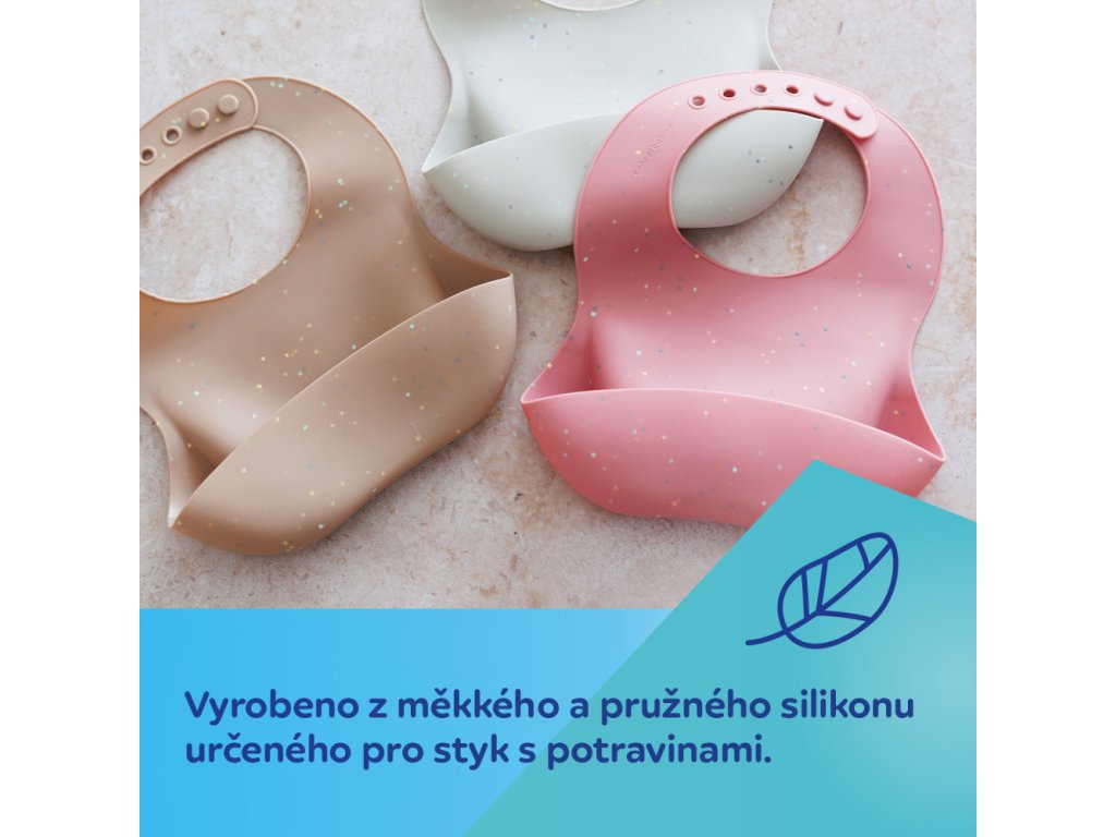 Tento výrobek není hračka. Uchovávejte mimo dosah dětí, když se nepoužívá. Nenechávejte bryndáček na přímém slunci, může vyblednout nebo prasknout. Možno mýt v myčce. Dostupné v několika barvách. Vhodné pro děti od 4m+.