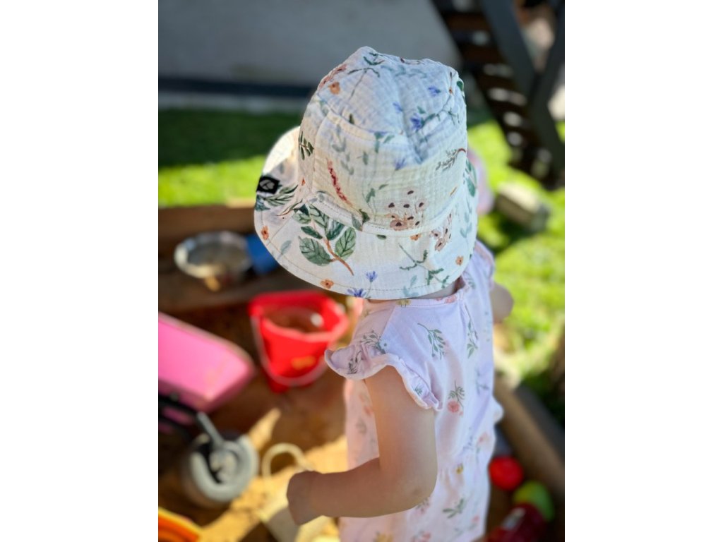 Krásný mušelínový klobouček s originálním vzorem, který bude dokonalým doplňkem letních outfitů ale také dobrým pomocníkem u vody. Klobouček ochrání hlavičku dítěte před slunečními paprsky.