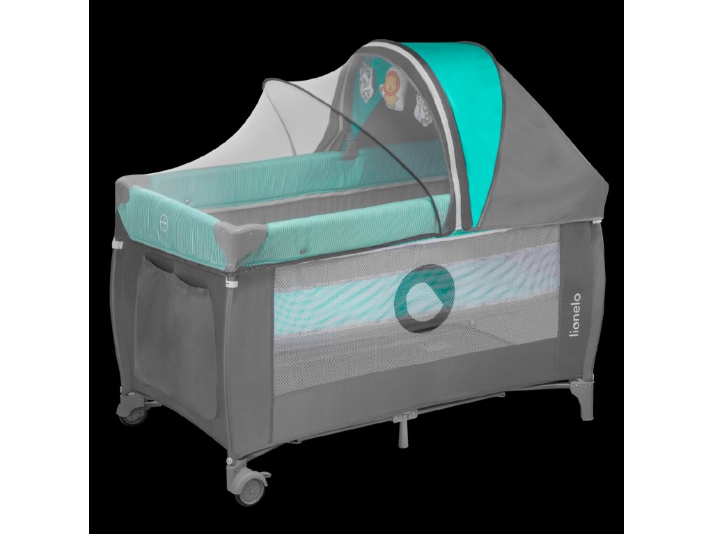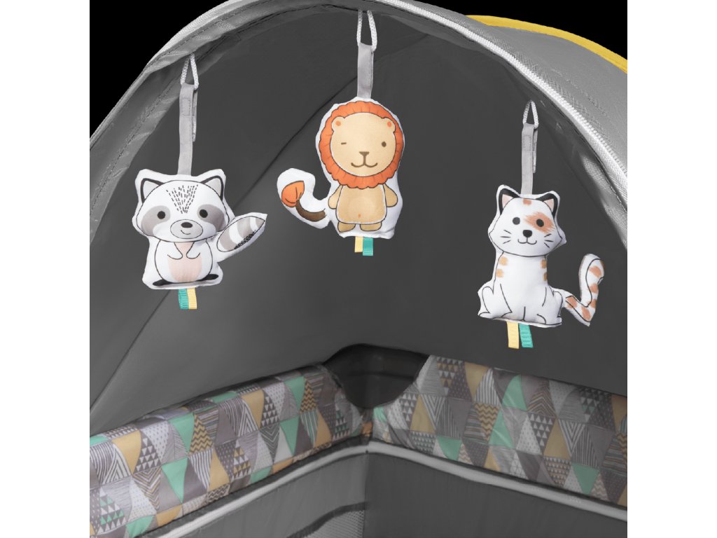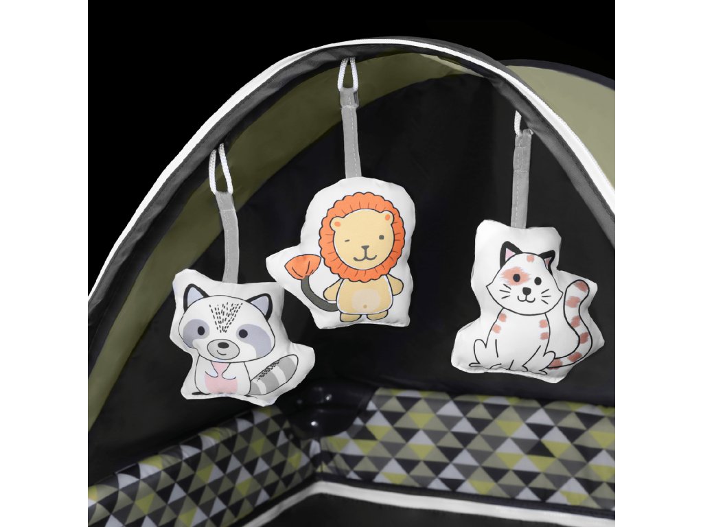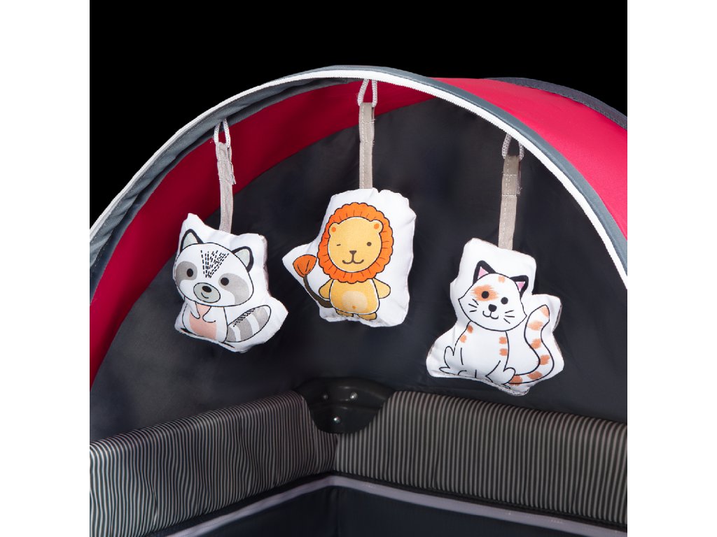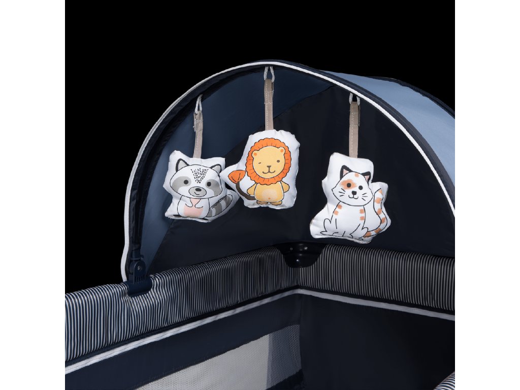Součástí je velká moskytiéra a hrazdička s plyšovými hračkami a stříška
