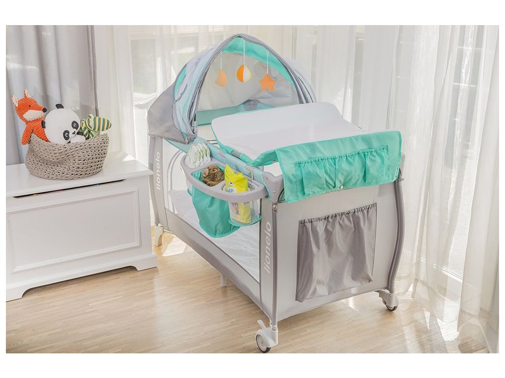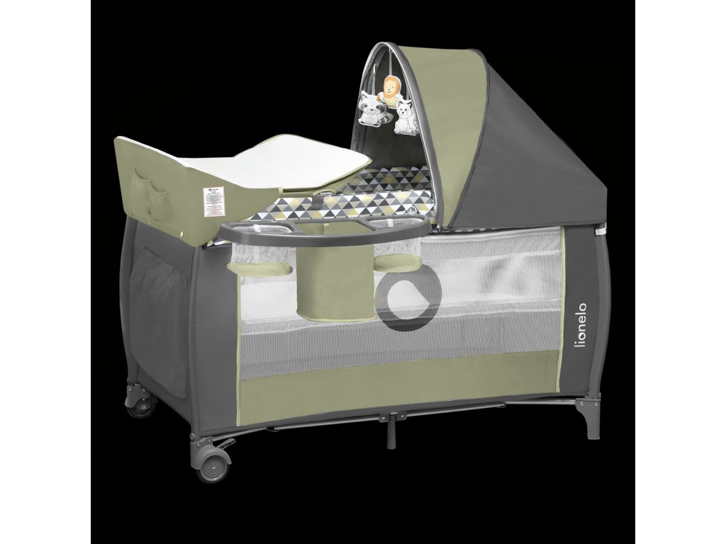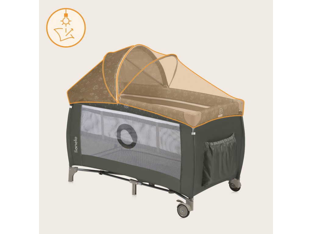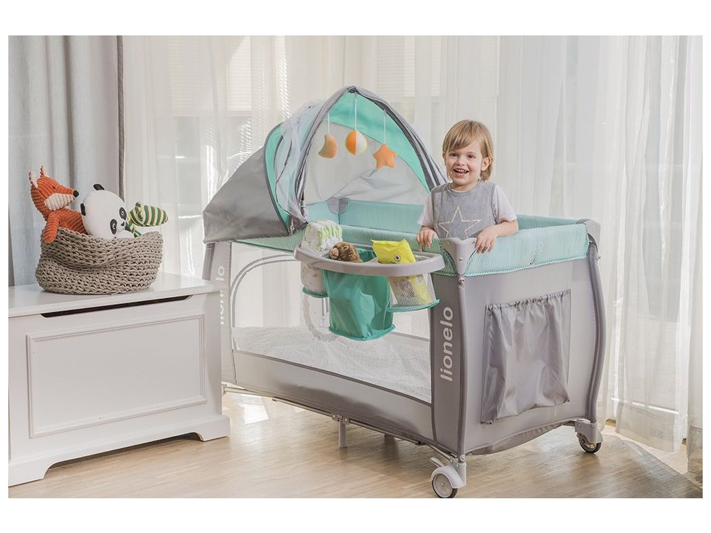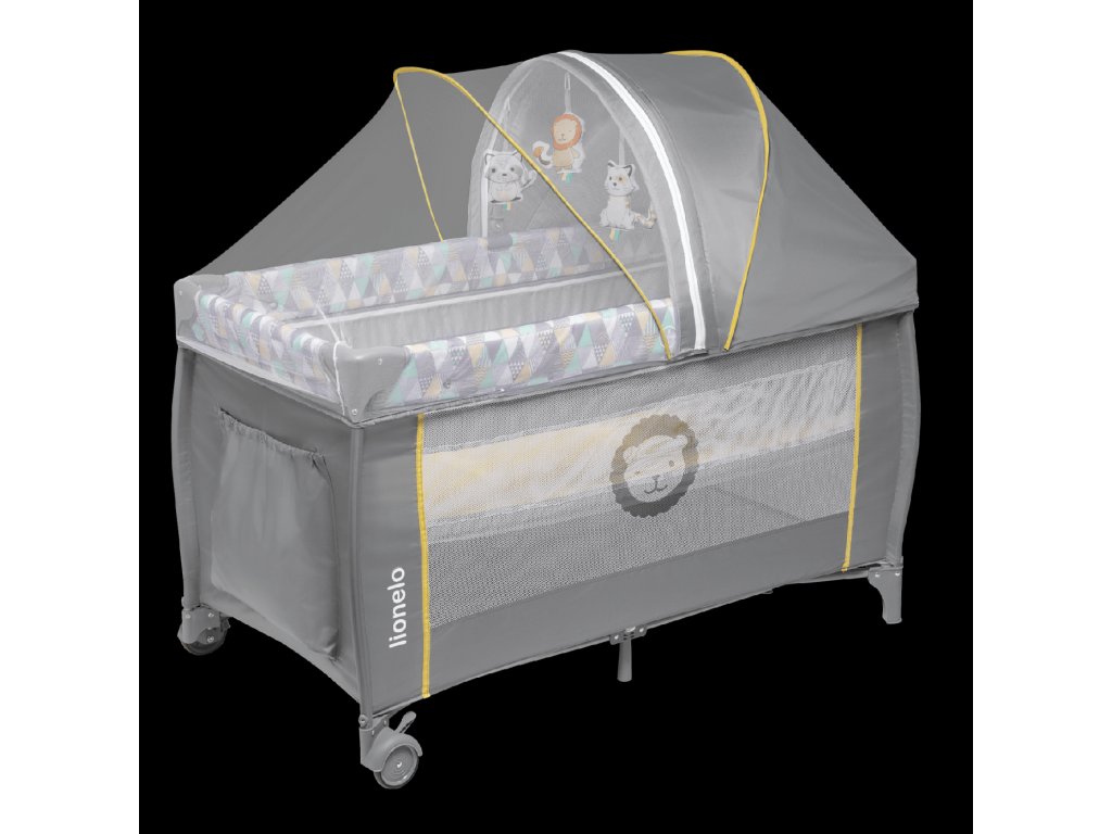 Součástí je velká moskytiéra a hrazdička s plyšovými hračkami a stříška