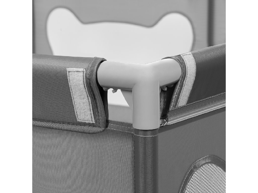 Vysoké bočnice ohrádky jsou vyrobeny ze síťoviny, která nejen zajišťuje cirkulaci vzduchu, ale také zaručuje dobrou viditelnost, díky čemuž může rodič sledovat, co se děje s dítětem. Měkké bočnice minimalizují riziko možných nárazů a vzor připomínající medvědí uši povzbuzuje děti k samostatnému hraní v ohrádce.