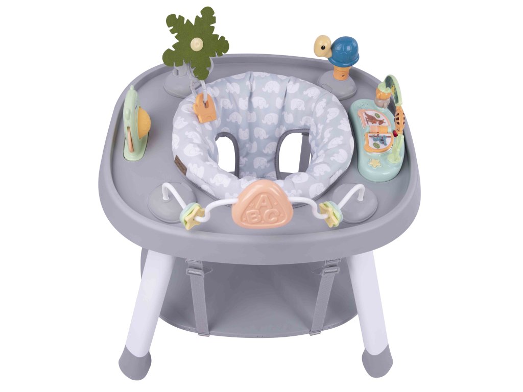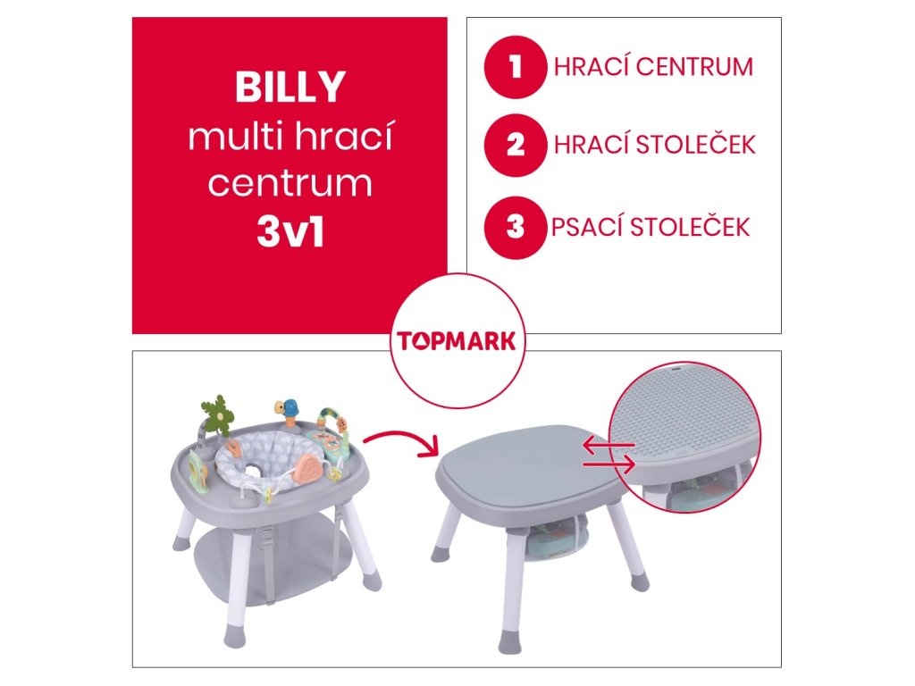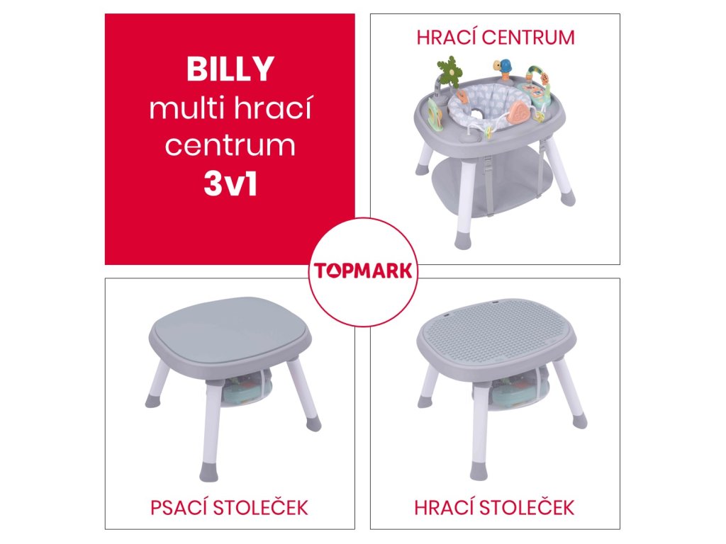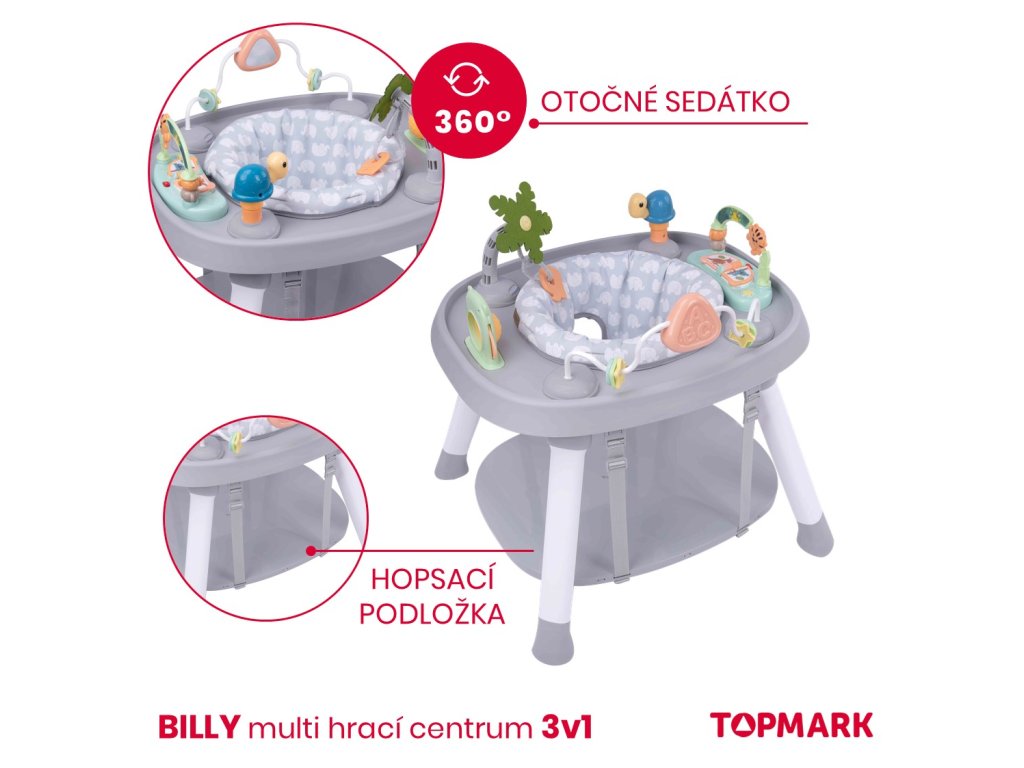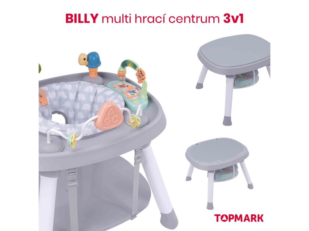 BILLYMulti hrací centrum.Vhodné pro děti od 6 měsíců do 7 let, max. nosnost 15 kg.Krásné hrací centrum, které nabízí hned několik využití podle toho, jak poroste vaše děťátko.HRACÍ CENTRUMSoučástí centra je pohodlné měkce polstrované otočné sedátko. Děťátko se tak snadno dostane na všechny hračky, které centrum nabízí. Díky tomu si užije váš maličký ještě více zábavy, může bezpečně „cestovat“ dokola, objevovat nové zvuky, světýlka, a přitom bude stále v bezpečí.HOPSADLOKdyž si bude váš maličký hudebník chtít „zatancovat“, může si zahopsat díky závěsné hopsací podložce. Tolik zábavy a vše nabízí jeden produkt…a to není stále všechno…HRACÍ STOLEČEKKdyž už děťátko povyroste, můžete centrum přeměnit v hrací stoleček s deskou ideální na kostičky a pokud povyroste ještě více a chce si kreslit stačí desku otočit a získáte krásný PSACÍ STOLEČEK, navíc pod deskou je schovaný malý úložný koš na pastelky, plastelínu či modelínu, jednoduše na vše, co váš malý malíř bude potřebovat.ROZMĚRY: 62 x 53 x 15 cm (po složení) VLASTNOSTI:1. Centrum je vhodné pro děti od 6m+ do 7 let.2. Podporuje vývoj děťátka pomocí hudby*, světel a rytmu.3. 360° otočné sedátko umožní děťátku dosáhnout na všechny aktivity hračky. Potah sedátka lze sejmout a prát.4. Centrum je nastavitelné do 3 výškových pozic pro přizpůsobení výšky děťátku.5. Centrum může být použito i jako malé hopsadlo.6. Centrum 3v1 lze použít jako: hrací centrum, herní nebo pracovní stoleček Přeměna hracího centra v praktický herní nebo pracovní stolečekHrací centrum lze po vyjmutí hraček přeměnit v praktický hrací nebo pracovní stoleček, stačí si jen zvolit vybranou stranu pracovní desky (hladkou nebo herní).* UPOZORNĚNÍ: Hračka hracího centra vyžaduje 3 x “AA” 1,5 V alkalické baterie (nejsou součástí balení).Doplňkové parametry