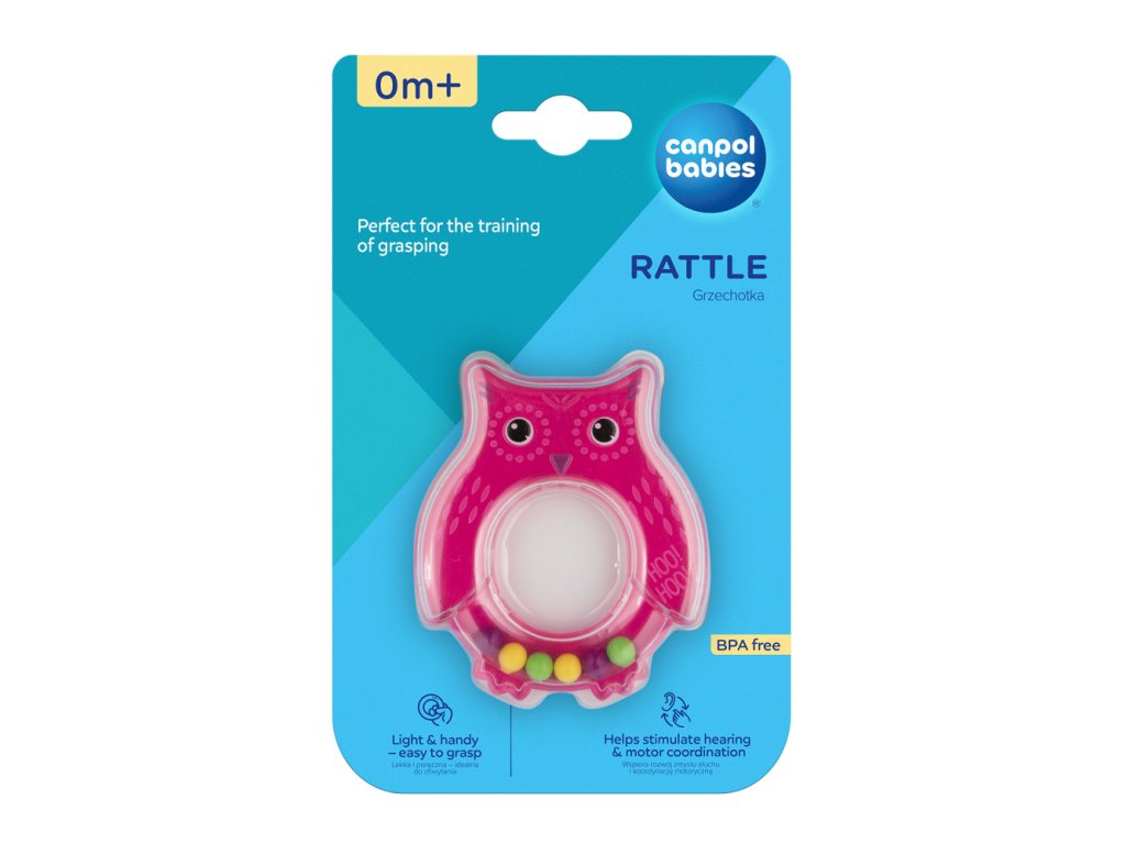 Chrastítko Sova je ideální volbou pro první hračku dítěte, protože je lehké a praktické. Pro dítě je snadné ho chytit a držet v jeho malých ručkách. Hračka má jemně zaoblené tvary. Průhledné části hračky obsahují malé barevné prvky, které se během hraní pohybují a dělají příjemný chrastivý zvuk. Hračka podporuje cvičení a zábavu a také stimuluje psychomotorický rozvoj. Vhodné pro děti od 0 m+.