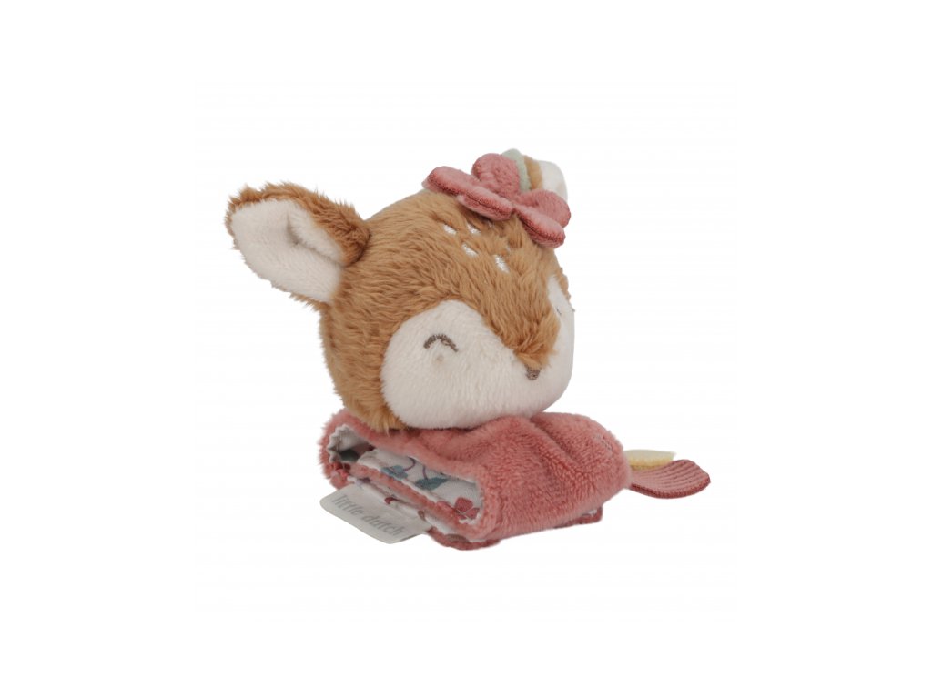 Měkké chrastítko s roztomilou srnkou snadno připevníte na ruku dítěte s pomocí úchytu na suchý zip. Hračka z jemného plyšového materiálu chrastí, šustí a láká dítě ke zkoumání. Hračka je součástí designové kolekce hraček Little Dutch Fairy Garden inspirované životem na zahradě. Rozměry: 17 x 8 x 4 cm Vhodné pro děti od narození.Doplňkové parametry