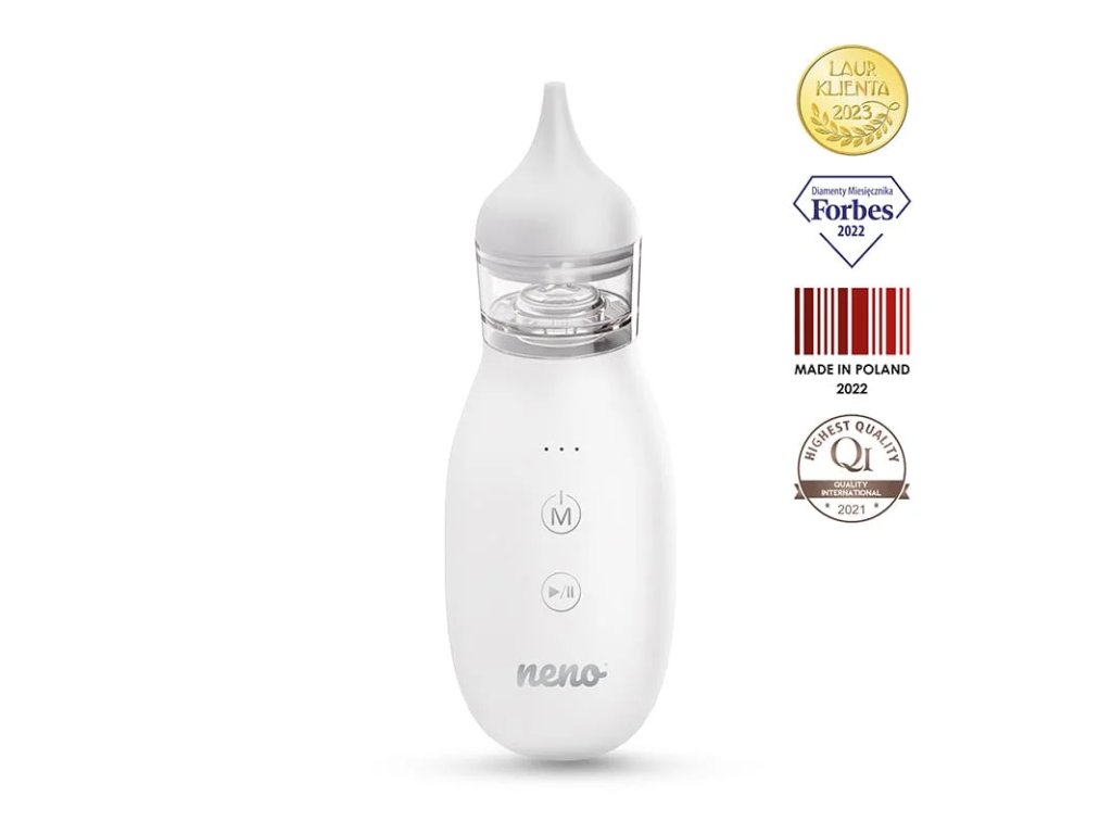 Neno Aria je moderní bezdrátová nosní odsávačka. Je lehká a snadno se používá, poskytuje jemné a zároveň přesné čištění dětského nosíku. Nastavitelný sací výkon a přiložené koncovky umožňují přizpůsobit sací výkon hustotě sekretů a věku děťátka. USB Nabíjení - Odsávačka je ideální pro vnitřní i venkovní použití. Díky tomu, že má univerzální port USB-C a kabel, který je součástí balení, ji můžete snadno nabíjet kdekoli na cestách. Stačí zařízení připojit ke stacionárnímu zdroji napájení nebo powerbance. Kompletní výbava - Chcete svému děťátku jemně, ale účinně vyčistit nos? Nic nemůže být jednodušší. Zapněte odsávačku, vyberte si jeden ze dvou nástavců vhodných pro věk dítěte a pusťte se do práce. Vyčištění dýchacích cest přinese vašemu děťátku okamžitou úlevu. - Odsávačka obsahuje všechny potřebné součásti. Kromě odsávačky se 2 vyměnitelnými hlavicemi dostanete také speciální nabíjecí kabel a praktické pouzdro na uskladnění. Dlouhotrvající použití - Odsávačka je navržena tak, aby vám sloužila dlouhá léta i díky nástavcům 2 velikostí. Jednoduché čištění - Udržování správné hygieny odsávačky je mimořádně snadné díky jejímu důmyslnému designu. Nádoba na sekret nemá zbytečné prohlubně ani výstupky, takže se snadno zbavíte zbytků rýmy. Nástavce vyrobené z měkkého silikonu můžete také snadno čistit a sterilizovat. Bezdrátová - Díky bezdrátovému provozu je používání odsávačky mimořádně pohodlné. Absence kabelů a dlouhá doba provozu (až 2 hodiny v nejintenzivnějším režimu) zaručují pohodlné vyprazdňování během infekcí i jako součást každodenní hygieny. Jednoduché ovládání - Ovládání je intuitivní, protože její ovládací prvky jsou omezeny pouze na přehledný panel s dotykovými tlačítky. Ke spuštění odsávačky stačí jen 2 doteky. Sáček na přenášení - Přiložený sáček je nejen estetický, ale i velmi užitečný při přenášení. Objemný sáček umožňuje vzít odsávačku na procházku, na cestu autem, vlakem, tramvají nebo dokonce letadlem. Vlastnosti - Materiál nástavců: silikon - Úroveň hluku: ≤ 59 dB - Doba nabíjení: cca 2,5 hodiny - Pracovní doba: do 2 hod. - Hmotnost: 133 g - Rozměry: 103 x 51 x 42 mm - Balení obsahuje: odsávačku, adaptér 2mm, adaptér 3mm, uzávěr, USB nabíjecí kabel, sáček na přenášení. 1. Výrobek není hračka - nedovolte dětem, aby si s ním hrály. Produkt je pro použití pro dospělé. 2. Výrobek má malé části, které mohou způsobit udušení. 3. Před použitím vyzkoušejte sací výkon na hřbetu ruky dospělého. 4. Pomocí dodaného kabelu USB zkontrolujte, zda je nabíjecí napětí v mezích parametry zařízení. Nepřipojujte zařízení k vyššímu napětí než specifikované - může to poškodit zařízení a způsobit požár nebo výbuch. 5. Během používání nenabíjejte. 6. Nenechávejte tento výrobek v dosahu dětí, když se nepoužívá. 7. Pokud se jednotka nebude delší dobu používat (minimálně 3 měsíce), plně před uložením nabijte baterii. 8. Když je baterie nabitá, odpojte odsávačku od nabíječky, jinak může odsávačka explodovat. 9. Stroj sami nerozebírejte ani neopravujte. V případě poruchy, kontaktujte servisní středisko. 10. Nepoužívejte zařízení, pokud jsou v nose rány nebo známky mukositidy. 11. V případě horečky, infekce, podráždění nebo krvácení z nosu přestaňte používat zařízení a kontaktujte svého lékaře. 12. Nepoužívejte tento výrobek k jinému účelu, než ke kterému je určen 13. Nepoužívejte tento výrobek v uších, ústech nebo očích. 14. Odsávačka je hygienický výrobek pro domácí použití. Pokud má vaše dítě nos stavu, před použitím se poraďte se svým lékařem. Kontraindikace k použití aspirátorem jsou poranění nosu, krku nebo hlavy, krvácení z nosu a krev problémy se srážlivostí. 15. Pokud se kojenci a malé děti cítí nepříjemně Adresa výrobce: KGK Trend sp. z o.o., ul. Ujastek 5b, 31-752 Kraków, Poland. info@kgktrend.pl, NIP 678 315 51 46Doplňkové parametry