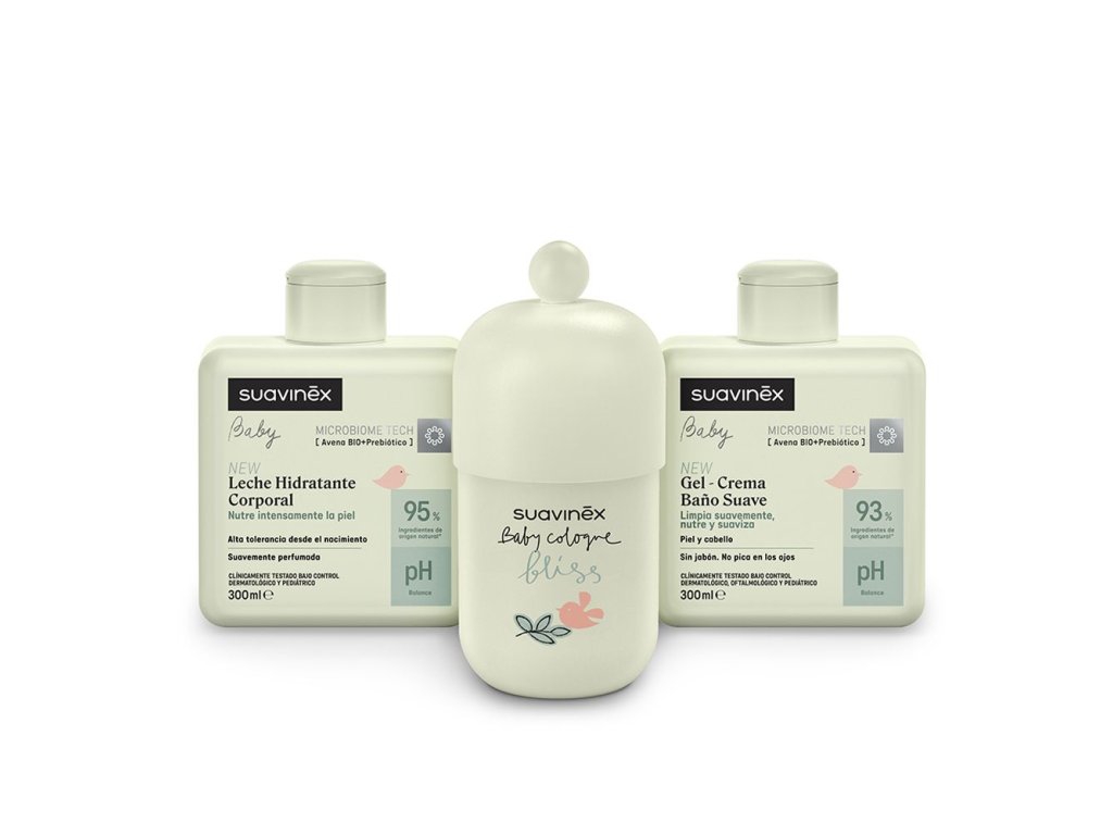 Baby Cologne Bliss má květinový, svěží a jemně obalující charakter. Otevírá se jiskřivými tóny citronu, anýzu a ananasu, které postupně přecházejí do delikátního srdce z konvalinky, pomerančového květu a růže. Vůně spočívá na teplém a dlouhotrvajícím základu bílého pižma, který pokožku hebce obaluje. Její složení s nízkým obsahem alkoholu bylo vyvinuto tak, aby respektovalo i ty nejcitlivější typy pokožky a splňuje naše přísné dermatologické standardy. Bliss není jen kolínská voda - je to každodenní zážitek. Provází celou naši kosmetickou řadu - mléka, gely i krémy - a doplňuje péči vůní, která zanechává nezapomenutelný dojem. Co sada obsahuje? Baby Cologne Bliss 100 ml - vůně z nové kosmetické řady. Hydratační tělové mléko 300 ml - intenzivně hydratuje, chrání pokožku před vysušením a zanechává ji uklidněnou, hebkou, jemnou a jemně provoněnou. Jemný koupelový gel-krém 300 ml - jeho bezmýdlová receptura jemně čistí pokožku i vlasy miminka. Hydratační tělové mléko Suavinex intenzivně vyživuje, chrání pokožku před vysušením a zanechává ji uklidněnou, hebkou, jemnou a jemně provoněnou. Obsahuje 95 % složek přírodního původu včetně vody. Jeho lehká a hedvábná textura je ideální pro dětské masáže a velmi snadno se vstřebává. Jemný koupelový gel-krém Suavinex jemně čistí pokožku i vlasy miminka. Obohacen o pantenol (provitamin B5) pro ochranu proti vysušování a zajištění hebkosti vlasů. Nevyvolává slzení očí! Oba produkty obsahují náš exkluzivní komplex MIBROBIOME TECH, bambucké máslo, mandlový olej a glycerin. Návod k použití a upozornění Hydratační tělové mléko: Naneste jemnou masáží na čistou a suchou pokožku. Pouze k vnějšímu použití. Jemný koupelový gel-krém: Používejte denně. Vysoká snášenlivost od narození. Omyjte tělo a vlasy a poté opláchněte. U novorozenců je ideální i do koupele - přidejte malé množství do vody a neoplachujte. Pouze k vnějšímu použití. Dětská kolínská voda: Naneste na oblečení. Pouze k vnějšímu použití.Doplňkové parametry