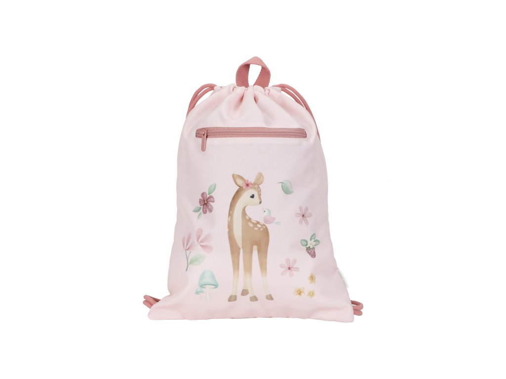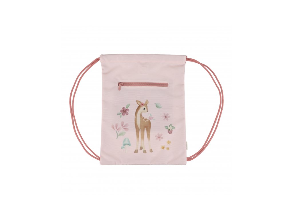 Sportovní pytel potištěný něžnými přírodními motivy je ideálním doplňkem do školy na tělocvik či na sportovní kroužek. Dvojité stahovací šňůrky umožňují nošení jako batoh, díky poutku jej snadno např. zavěsíte na věšák v šatně. Vnější kapsa na zip nabízí prostor pro bezpečné uložení drobností. Uvnitř najdete popisovatelnou jmenovku. Sportovní pytel je součástí designové kolekce hraček a doplňků Little Dutch Fairy Garden, inspirované životem na zahradě. Rozměry: 38 x 29 cmDoplňkové parametry
