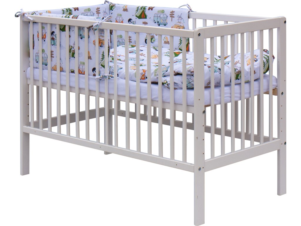 Dětská postýlka s kompletní soupravou povlečení a doplňků Scarlett Fany Komplet obsahuje1. Dětská dřevěná postýlka 120 x 60 cm - bílá, masiv borovice, 3 vyndavací příčky, 5 poloh roštu, nohy postýlky jsou předvrtané pro nasazení koleček2. Matrace 120 x 60 x 6 cm, PUR pěna, potah - 100% bavlna3. Potah na peřinku 120 x 90 cm - 100% bavlna4. Potah na polštářek 60 x 40 cm - 100% bavlna5. Výplň peřinky 120 x 90 cm - polyester, potahmikrofibra6. Výplň polštářku 60 x 40 cm - polyester, potahmikrofibra7. Mantinel do postýlky 180 x 30 cm - potah 100% bavlna, výplň polyester8. Prostěradlo 120 x 60 cm - bavlnaDoplňkové parametry