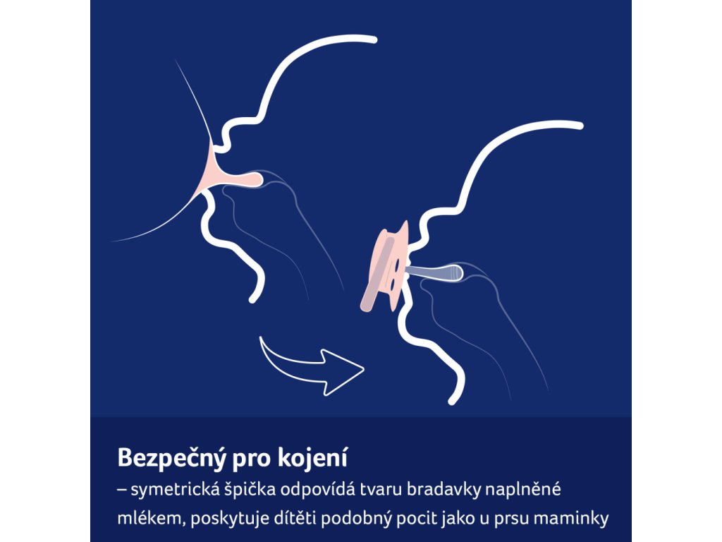 Unikátní symetrická dynamická špička se velmi dobře odvzdušňuje a nedeformuje zubní patro dítěte.
