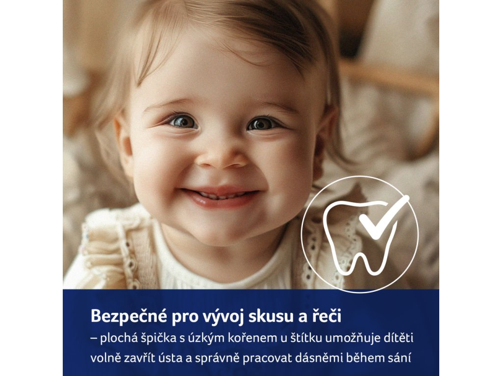 Unikátní symetrická dynamická špička se velmi dobře odvzdušňuje a nedeformuje zubní patro dítěte: