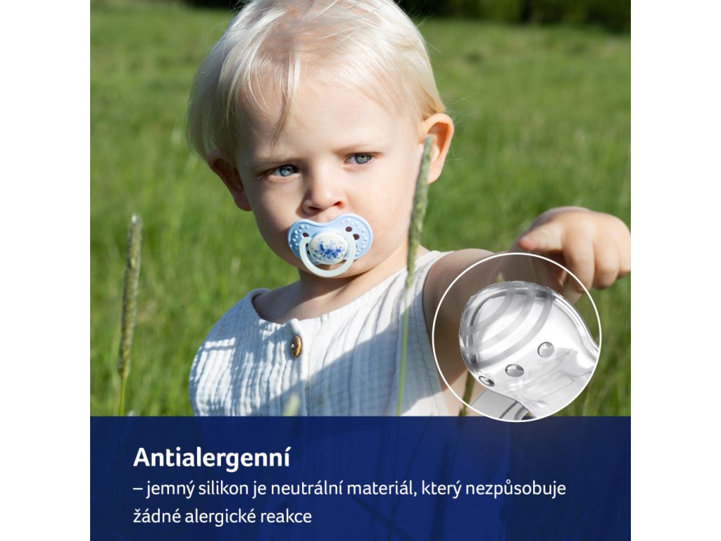 Jemný silikon v dudlíku je pro miminko neutrálním materiálem, nevyvolává alergické reakce, je bez chuti a zápachu, což je obzvláště důležité v této fázi, když je dítě citlivé na vnější podněty.