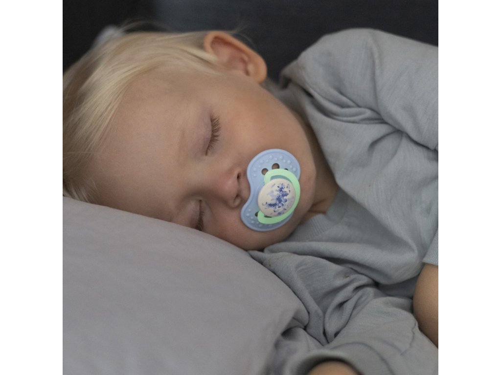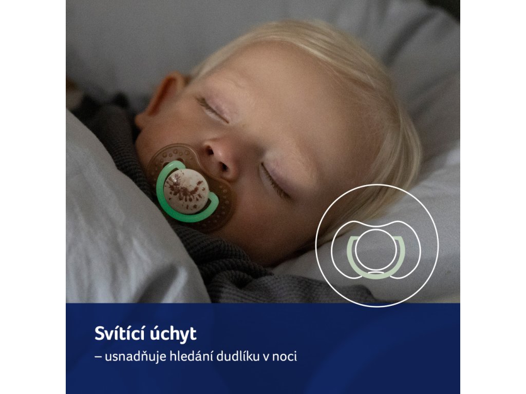 Dudlík má svítící úchyt, který vám umožní jej rychle najít ve tmě.