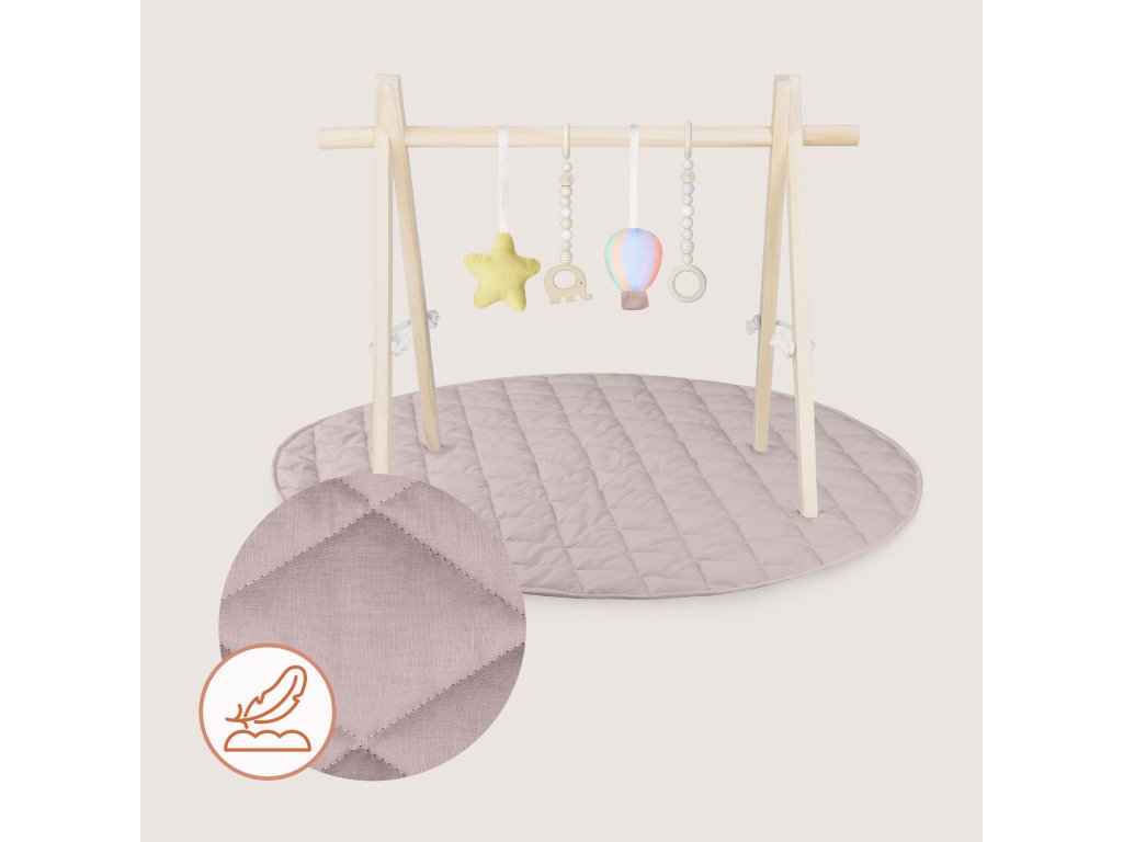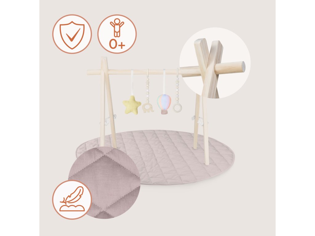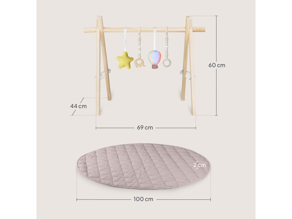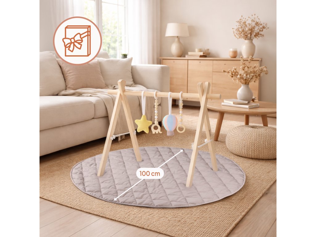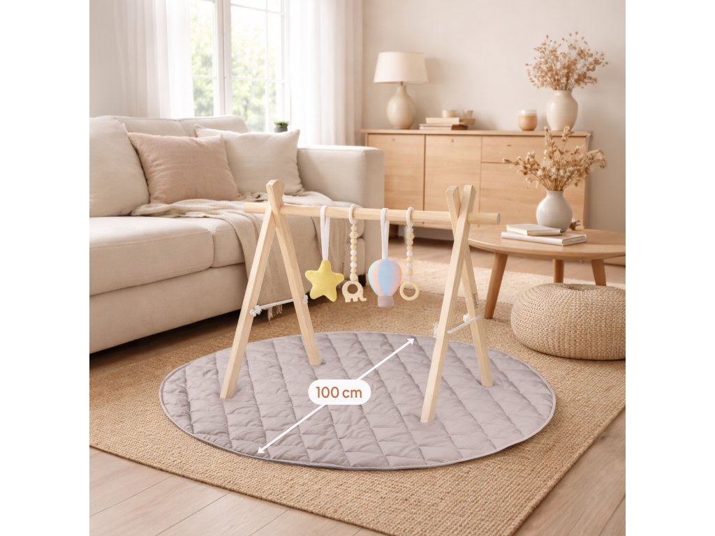 Prostorná podložka o průměru 100 cm zajišťuje pohodlí při hraní i prvních pohybových aktivitách. Skvěle se hodí do dětského pokoje i do obýváku. Minimalistická estetika inspirovaná Montessori a přírodní barvy zaručují, že hrazdička zapadne do každého interiéru a vytvoří pro dítě klidný, harmonický prostor.