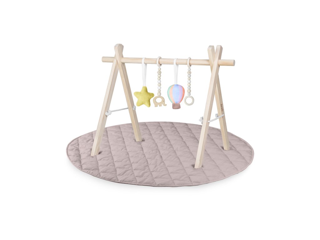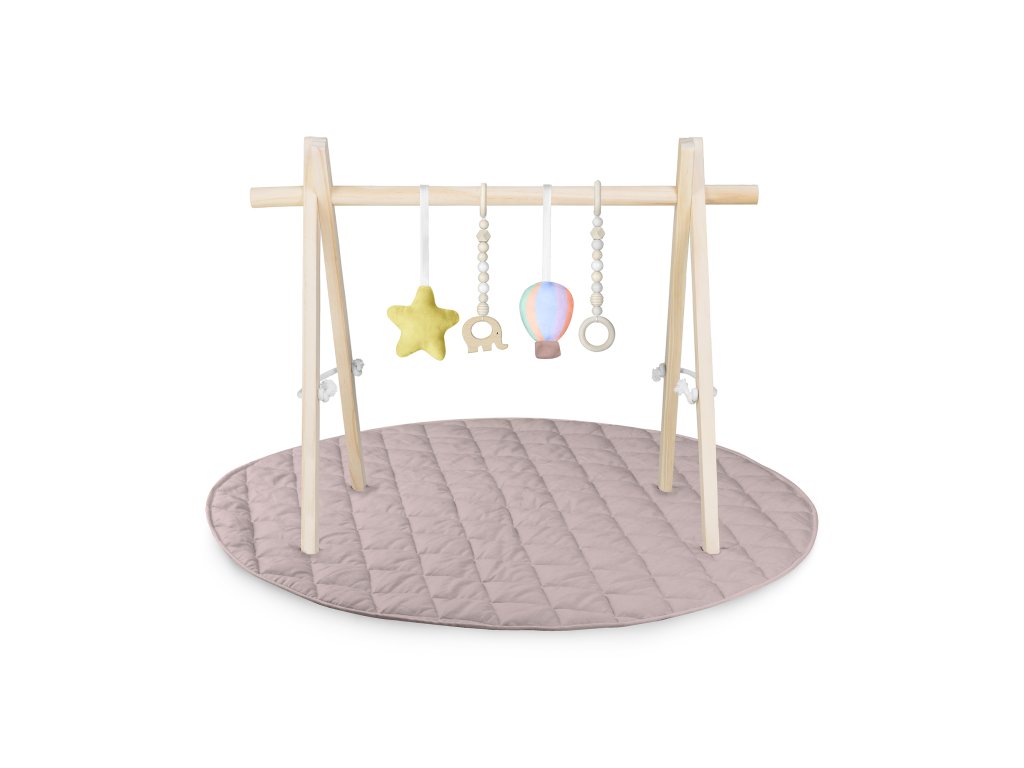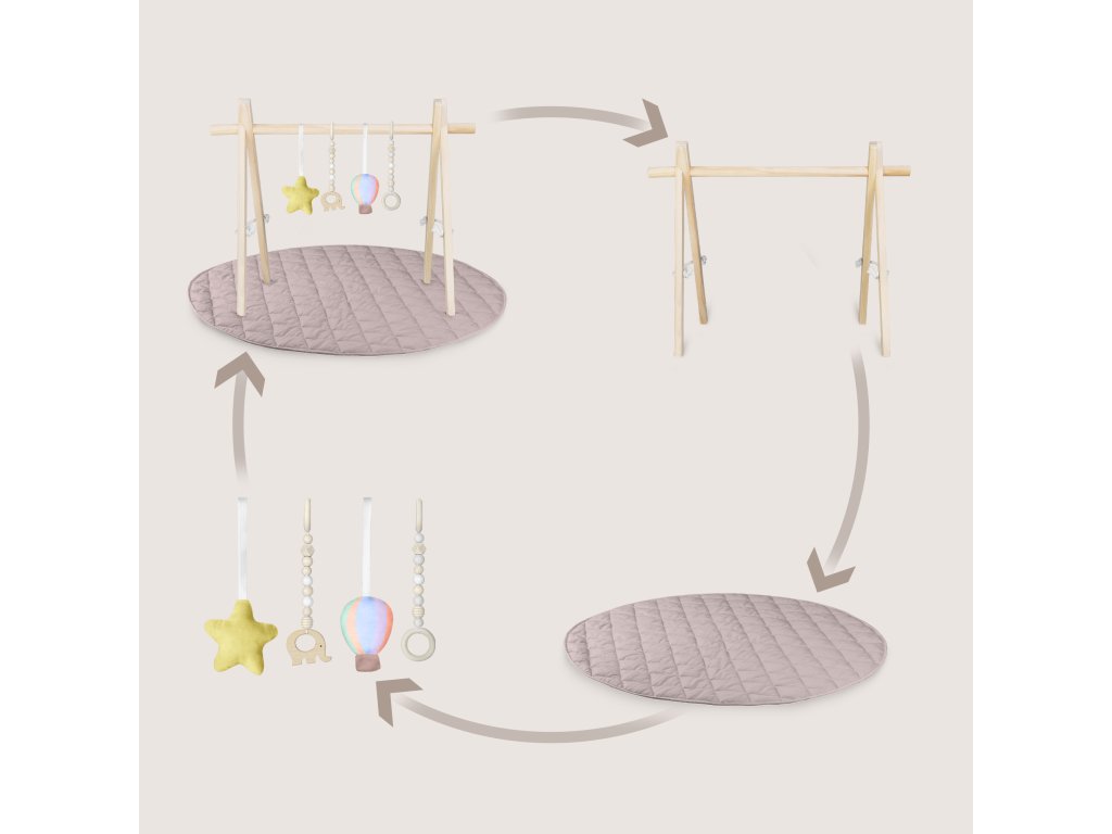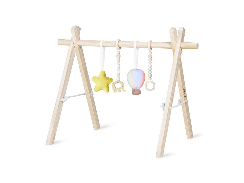 Různorodost struktur a tvarů podporuje vývoj dítěte už od prvních dnů. Čtyři závěsky – dvě měkké plyšové a dvě dřevěné – nabízejí odlišné povrchy, které stimulují smysly. Spojení přírodního dřeva s měkkými materiály a tlumené barvy podporují klidnou, přirozenou hru.