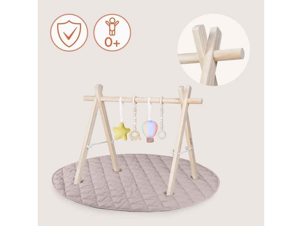 - Přírodní a bezpečné materiály – hrazdička z vysoce kvalitního přírodního dřeva, podložka z prodyšné, měkké bavlny