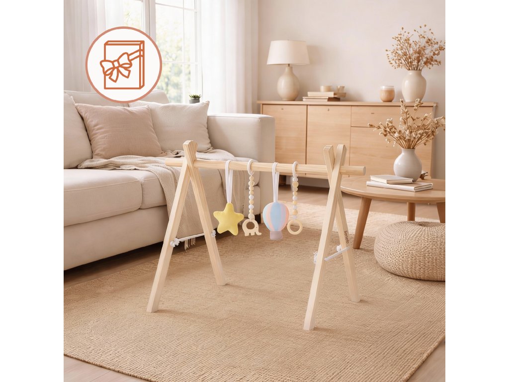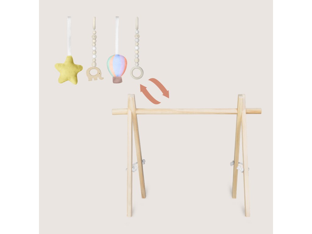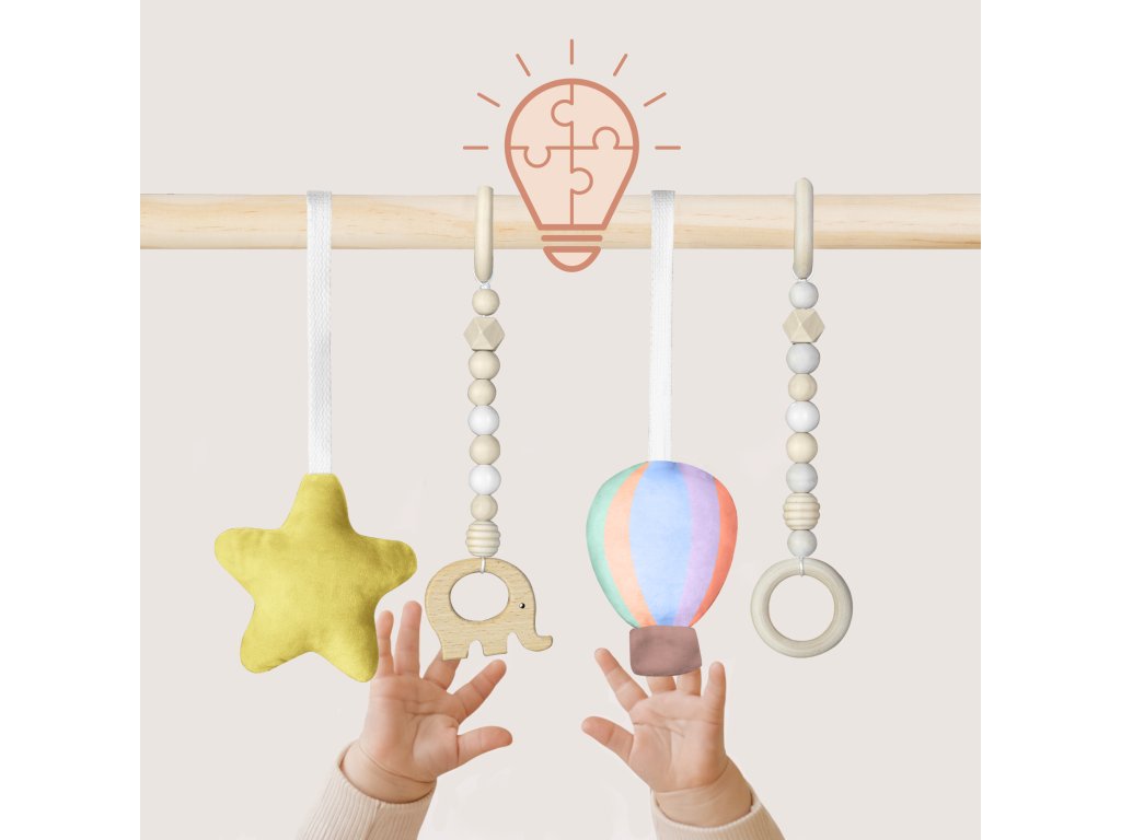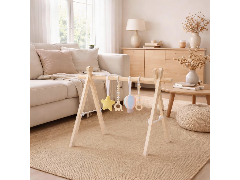 Minimalistická hrazdička inspirovaná Montessori přístupem vnáší do interiéru přirozenou harmonii a klidnou atmosféru. Tlumená paleta barev hraček podporuje soustředěnou, všímavou hru a dítě nezatěžuje přemírou podnětů.