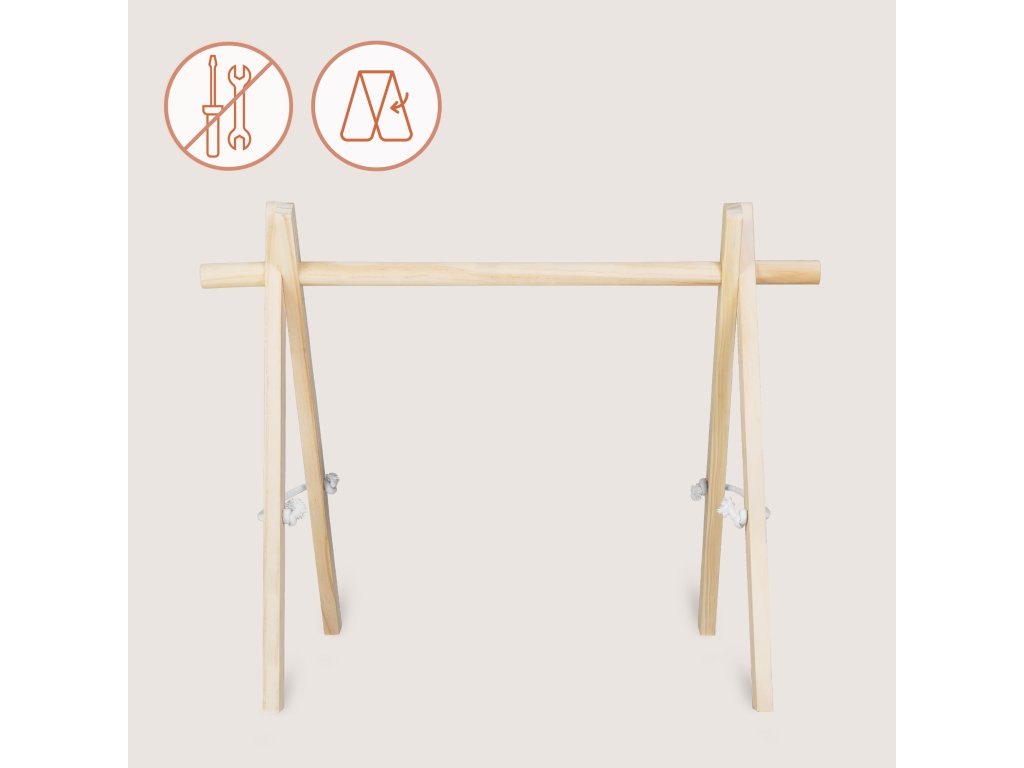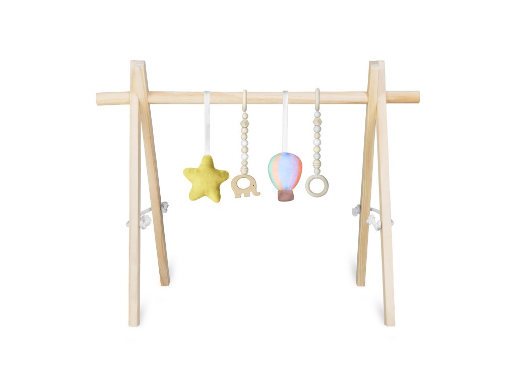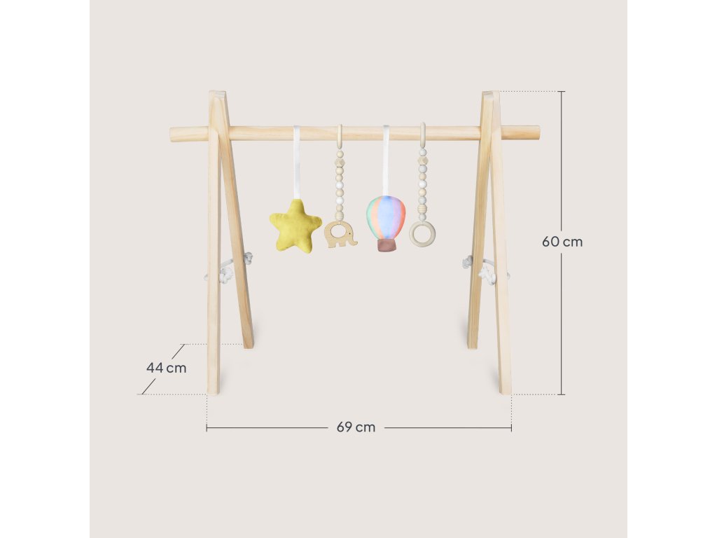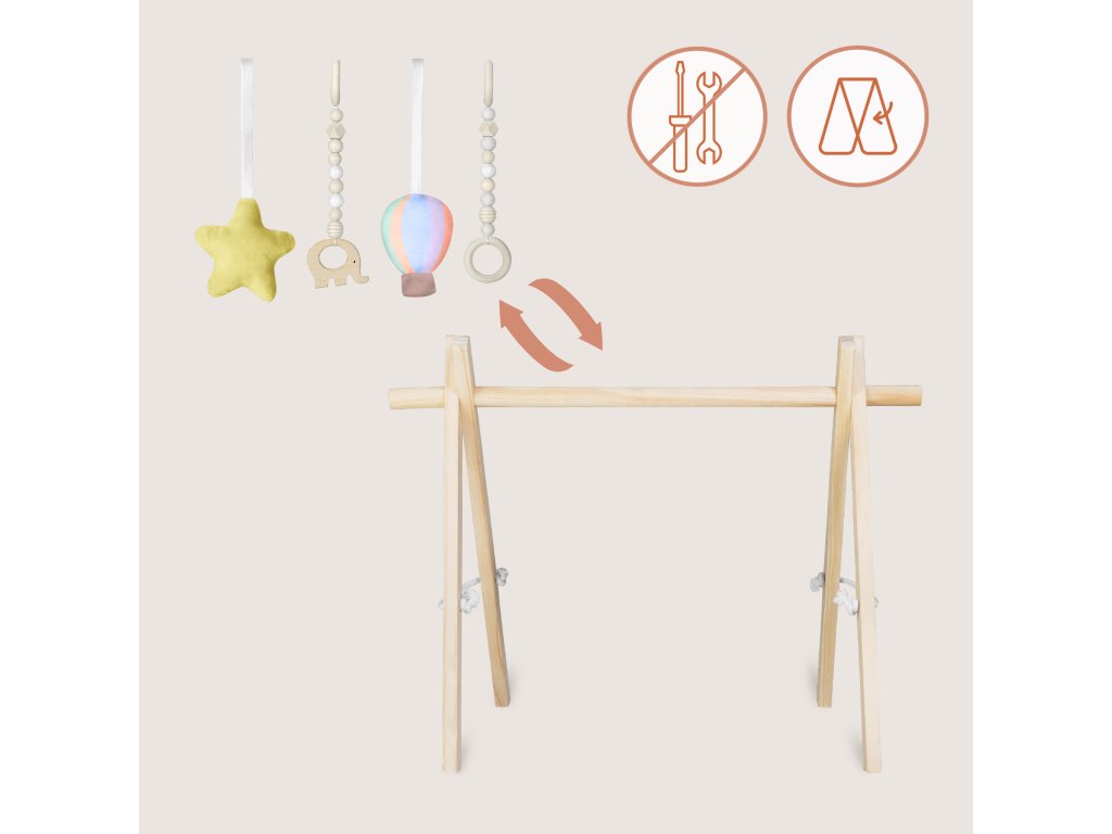 Minimalistická hrazdička inspirovaná Montessori přístupem vnáší do interiéru přirozenou harmonii a klidnou atmosféru. Tlumená paleta barev hraček podporuje soustředěnou, všímavou hru a dítě nezatěžuje přemírou podnětů.