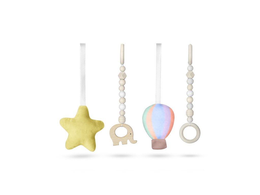 Při procházce můžete závěsky využít několika způsoby: dát je dítěti do ruky nebo je připevnit na madlo kočárku (pokud odpovídá šířka). Dítě tak má své oblíbené hračky i mimo domov. Stojan se závěskami využijete i doma při přebalování na podlaze – pomáhá udržet pozornost dítěte a zrychluje výměnu plenky.