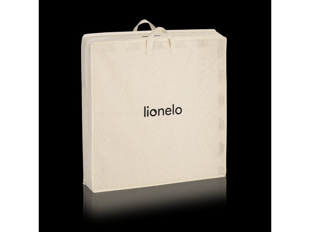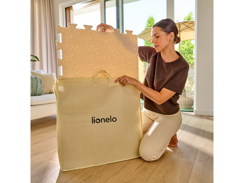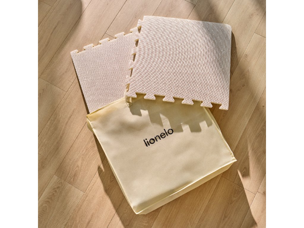 Univerzální design podložky Yoka je navržen tak, aby ladil s různými styly interiéru. V rohu dětské podložky je umístěno decentní logo Lionelo, které zdůrazňuje její jedinečný charakter.