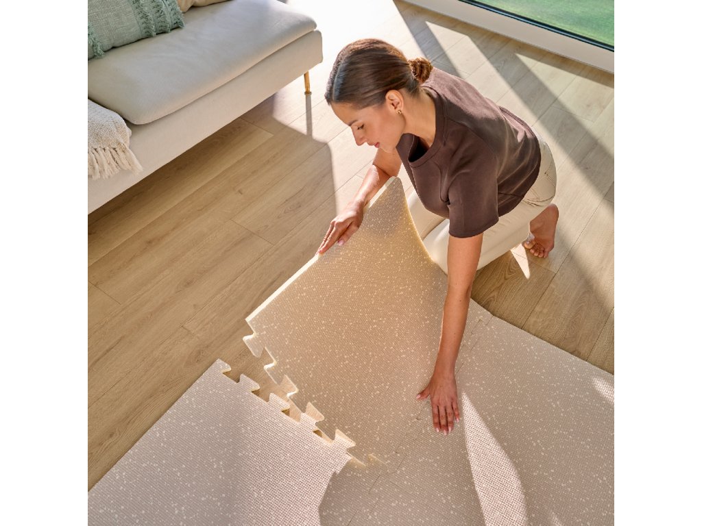Podložku Yoka složíte ze šesti měkkých pěnových dílů a vytvoříte tak pro dítě velkou a bezpečnou plochu 173 × 118 cm. Když potřebujete v bytě více místa nebo chcete podložku přizpůsobit menší místnosti, stačí použít jen čtyři díly – v této konfiguraci má rozměr 116 × 116 cm.