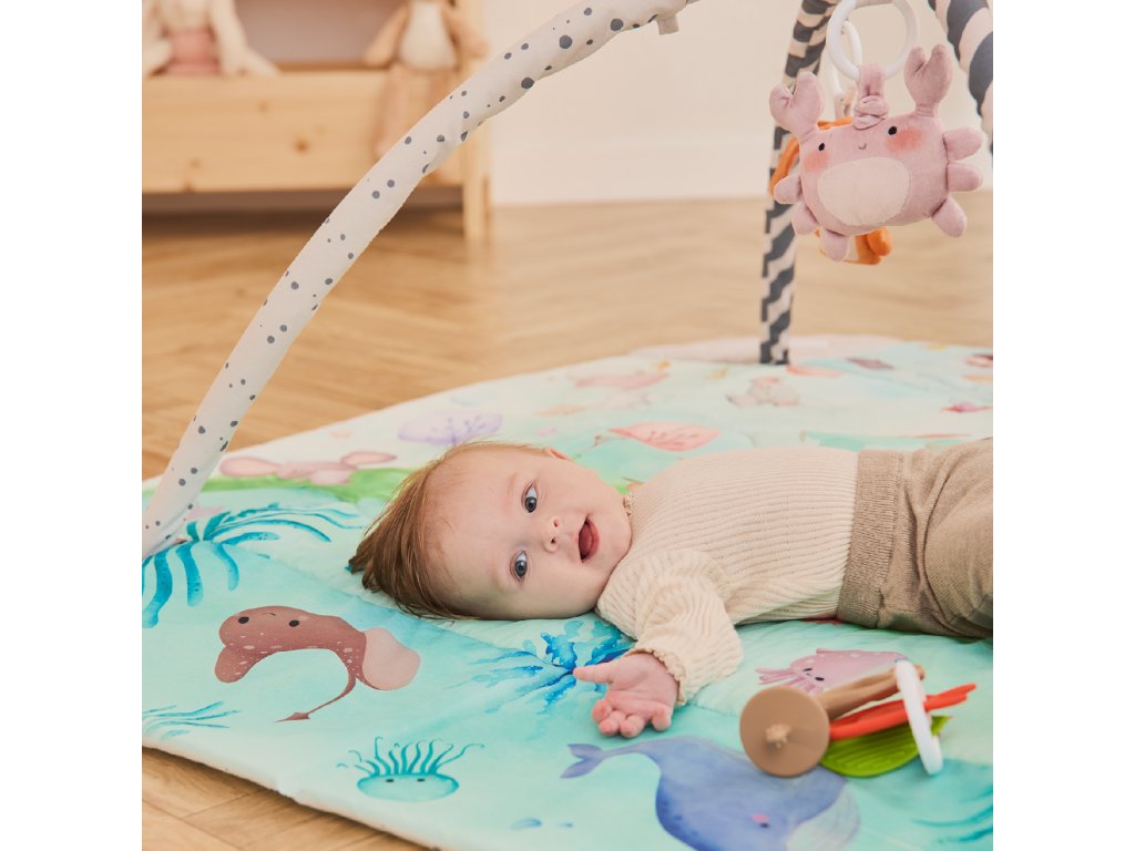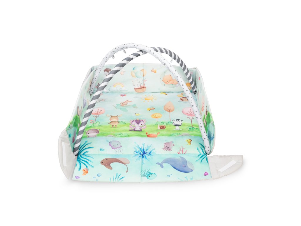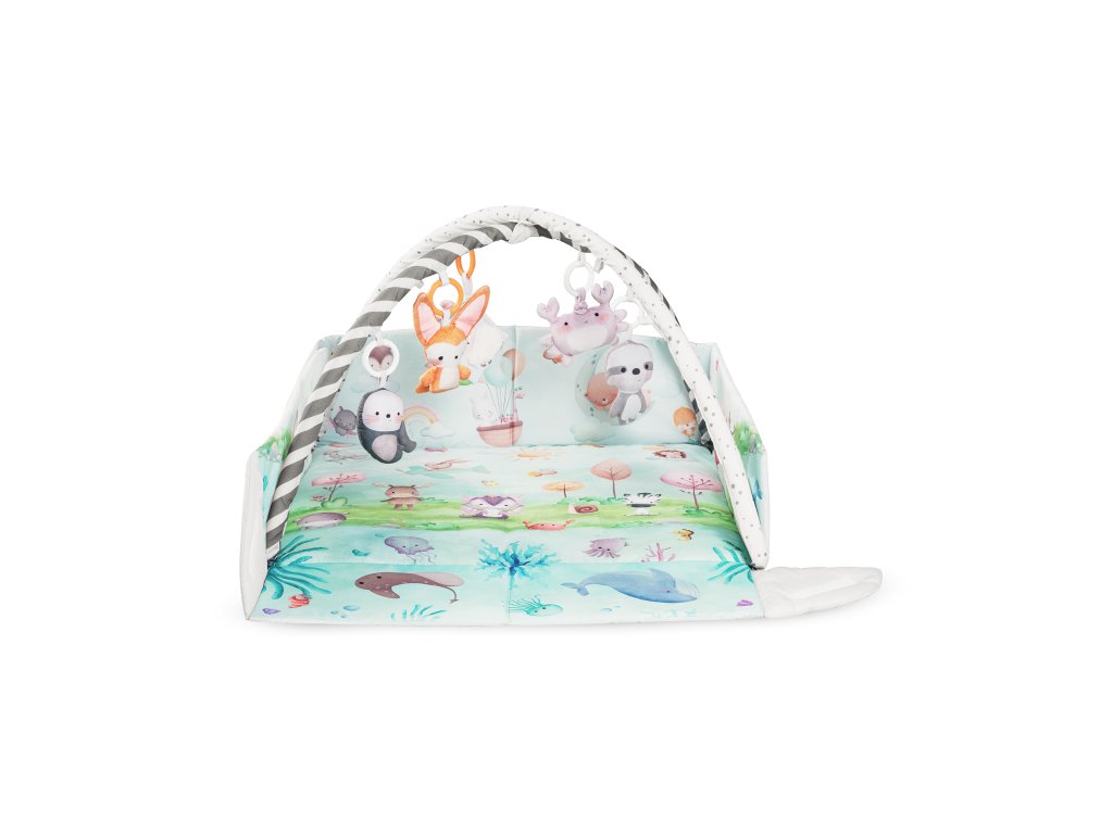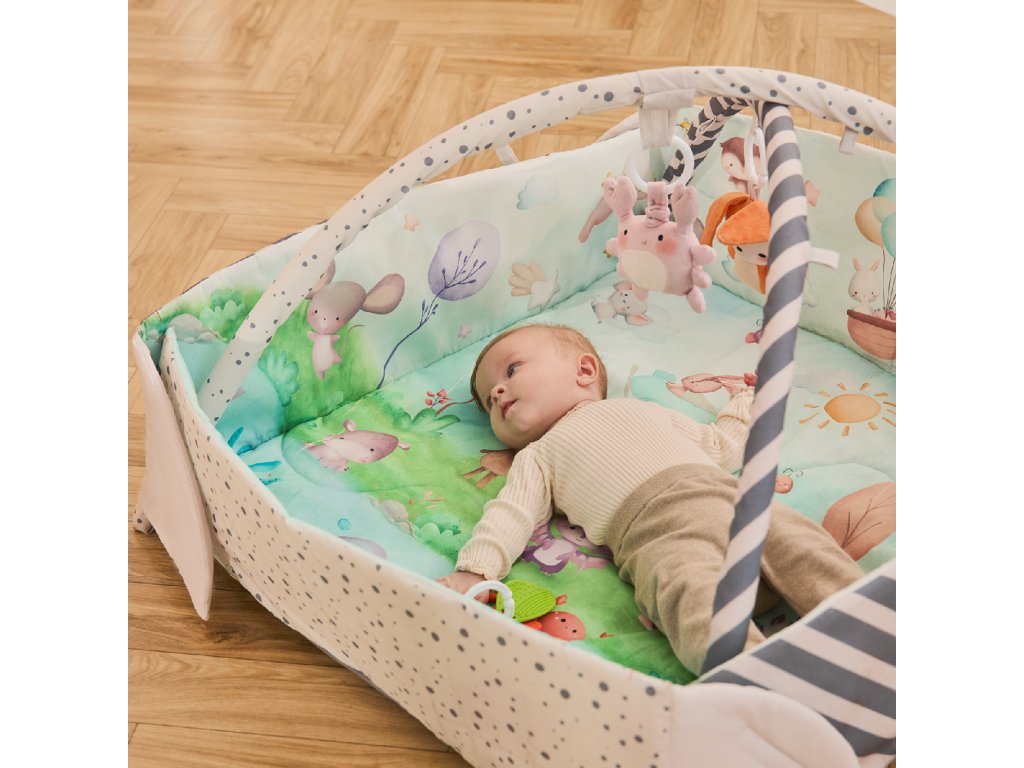 Podložka vytváří bezpečný prostor pro hraní i odpočinek – od prvních dnů života až po období lezení. Když se dítě začne hýbat, můžete bočnice zvednout, aby mělo vlastní místo pro objevování světa. V sadě se nacházejí hračky přizpůsobené jednotlivým etapám vývoje.