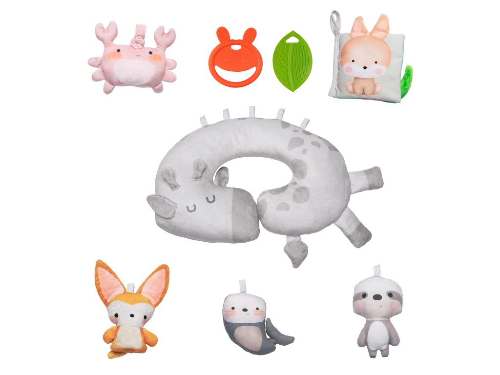 8 pečlivě vybraných hraček rozvíjejících smysly a koordinaci, včetně polštářku, který usnadňuje ležení na bříšku