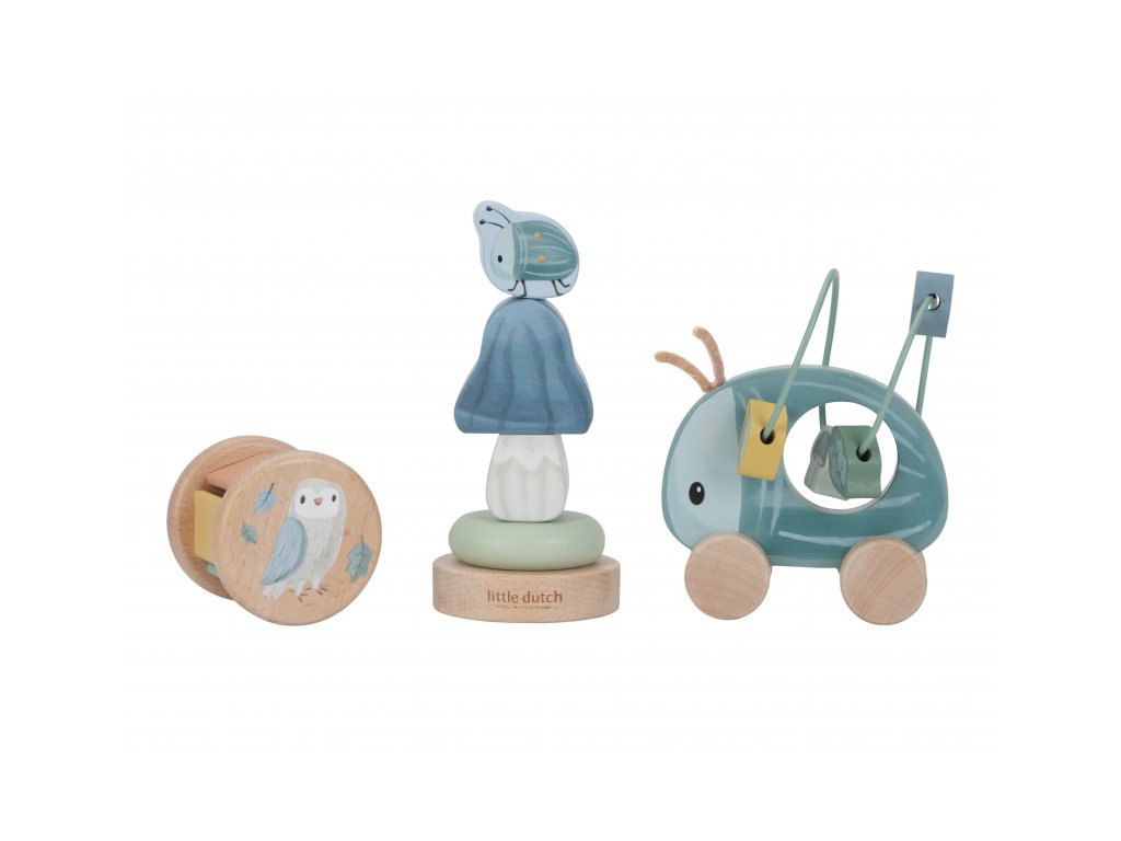 Dárková sada obsahuje tři krásné dřevěné hračky s něžným potiskem motivů ze života v lese. Chrastítko ve tvaru válečku při pohybu jemně cinká, skládací houbička s broučkem vybízí k rozložení a znovu složení. Třetí hračkou je roztomilý brouk na kolečkách se spirálou, na které se pohybují dřevěné korálky v podobě žaludu, listů a houby. Dárkový set je součástí designové kolekce hraček a doplňků Little Dutch Forest Friends inspirované životem v lese. Vyrobeno z dřeva certifikovaného FSC. Rozměry boxu: 21 x 20 x 8,4 cm Vhodné pro děti od 12 měsíců.Doplňkové parametry