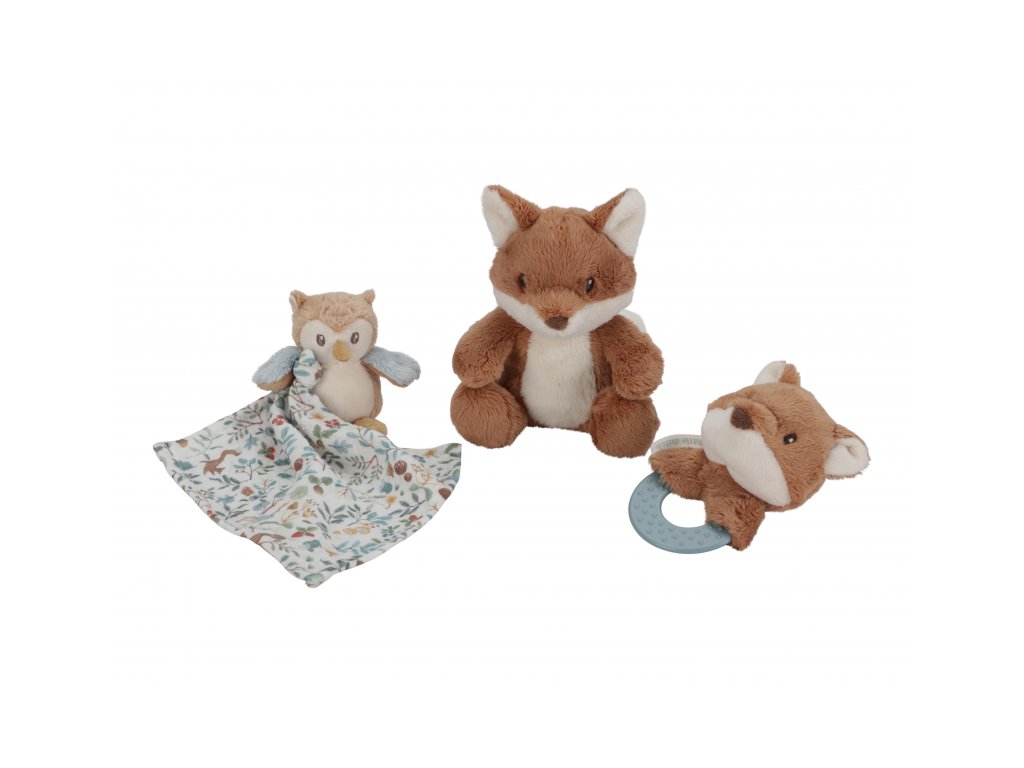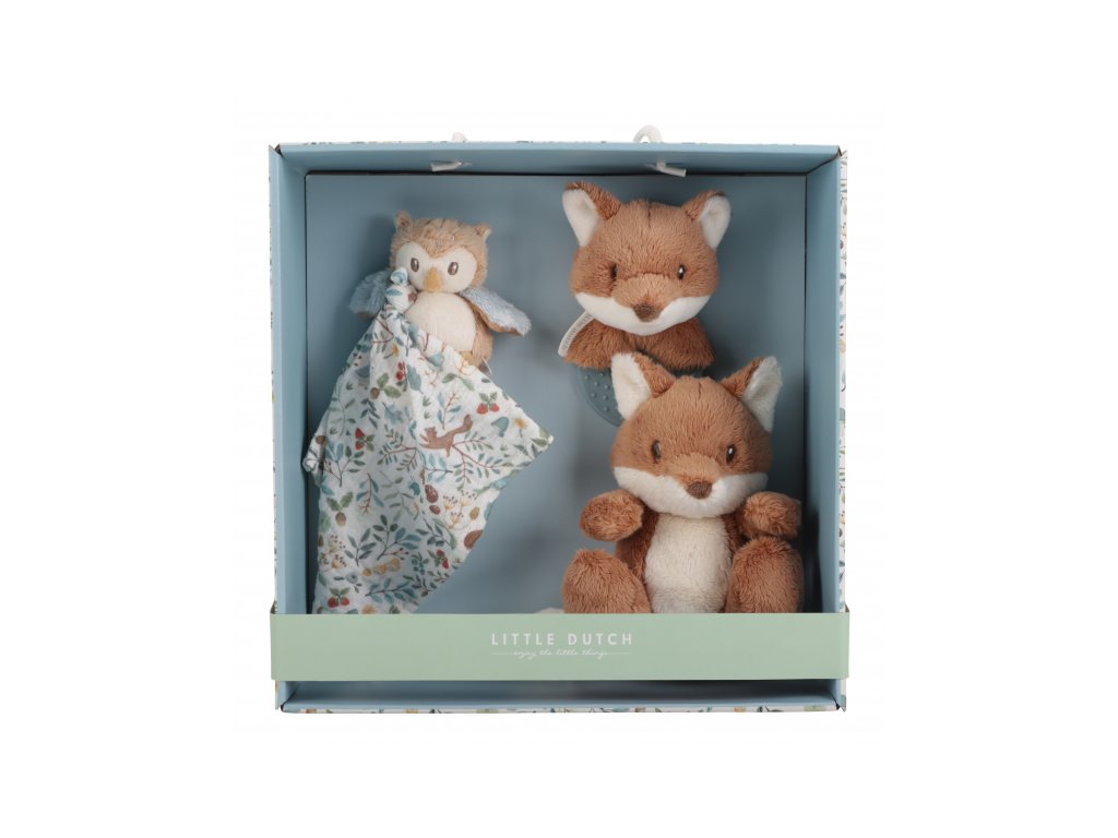 Krásná dárková sada plyšových hraček je ideální jako dárek pro novorozené miminko. Sada obsahuje kousátko s liškou, muchláčka se sovou a plyšovou lišku. Sada je součástí designové kolekce hraček a doplňků Little Dutch Forest Friends inspirované životem v lese. Rozměry krabice: 28 x 28 x 11 cm Vhodné pro děti od narození.Doplňkové parametry