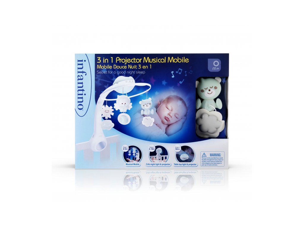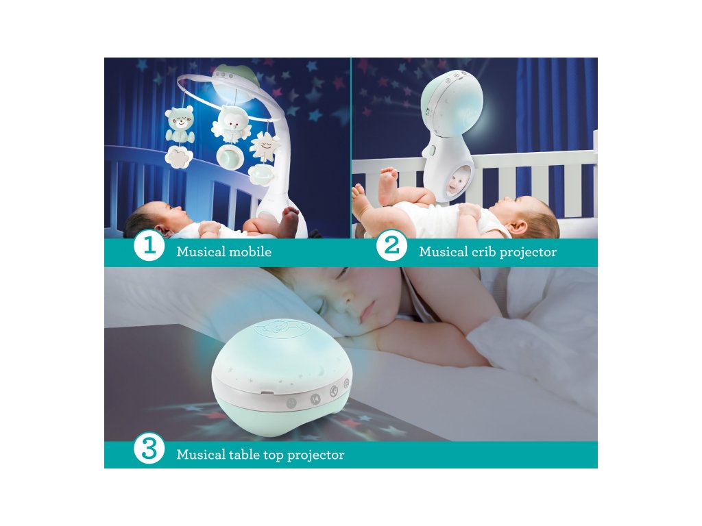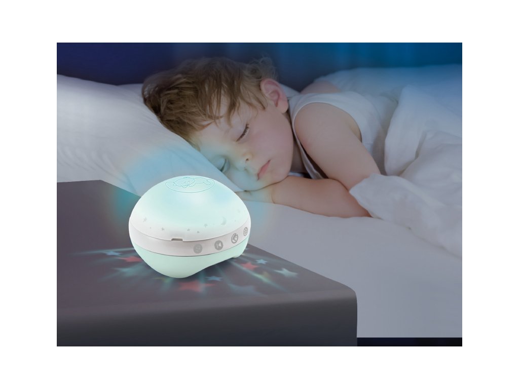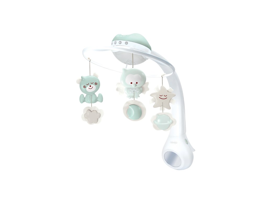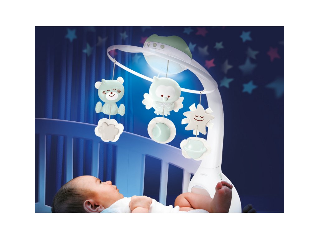 Hudební kolotoč se světelným projektorem pro snadné usínání i zabavení dítěte. Světelný projektor promítá na stěnu či strop hvězdičky a jemně tak osvítí dětský pokoj. Spolu s uklidňující melodií pomůže vašemu dítěti v klidu usínat. Nabízí na výběr z 10 uklidňujících melodií a zvuků přírody. Melodie a přírodní zvuky kolotoč po zapnutí přehrává 20 minut. Kolotoč s projektorem nabízí 3 možnosti použití: hudební kolotoč pro děti od narození do 5 měsíců noční světýlko a projektor do postýlky pro děti od 6 do 18 měsíců noční světýlko a projektor na noční stolek pro děti od 18 měsíců Kolotoč nabízí dva režimy pro uspávání i jemné probouzení dítěte: uspávací - 10 minut hudby, otáčení kolotoče, projekce a noční lampička, poté 10 minut pouze noční lampička probouzecí - 3 minuty pouze noční lampička, 4.-15. minuta noční lampička s hudbou, 16.-20. minuta noční lampička s hudbou, projektor a otáčení kolotoče Baterie 3xAAA baterie nejsou součástí výrobku. Vhodné pro děti od narození.Doplňkové parametry