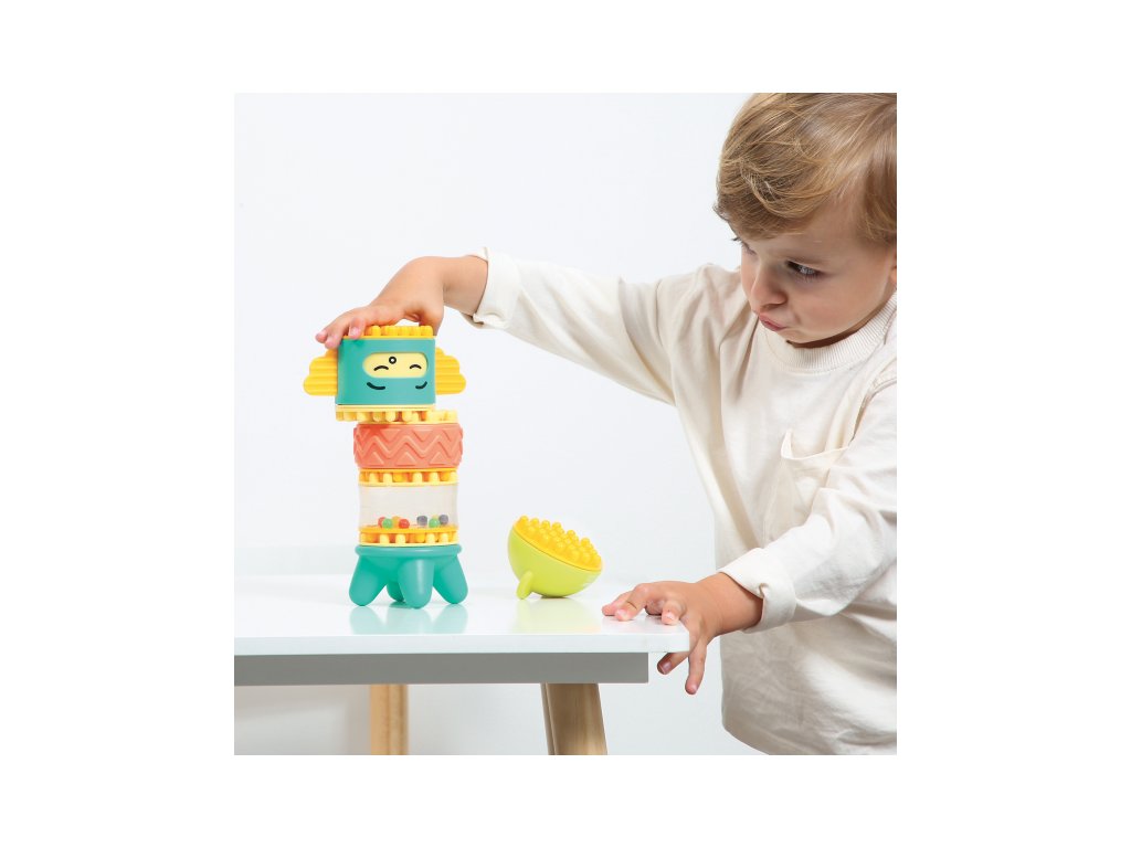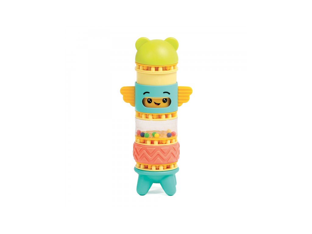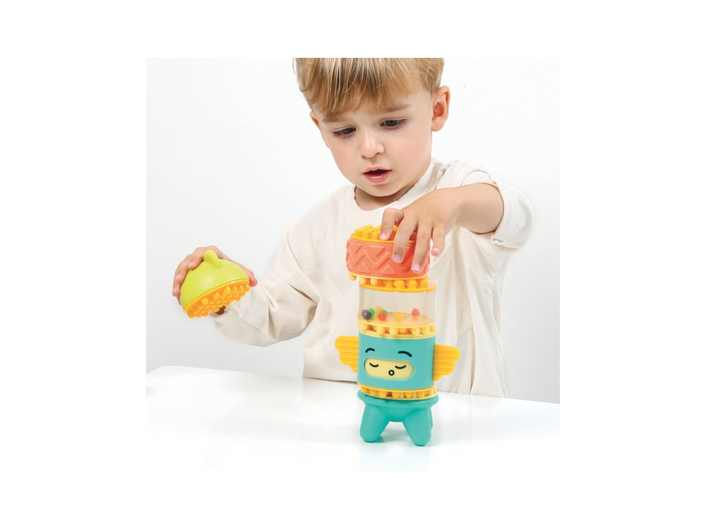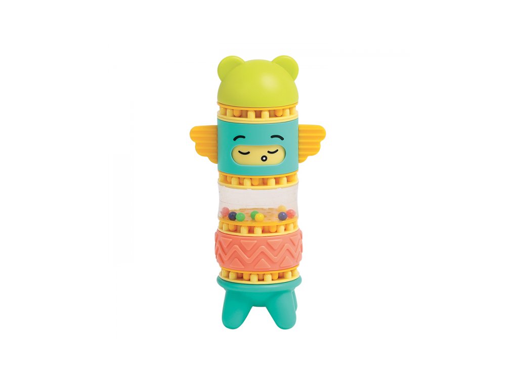 Stavebnice pro nejmenší se skládá se 6 dílů, které dítě skládá na sebe, až vytvoří figurku podobnou totemu. Spící obličejík na jednom z dílů se po zmáčknutí hlavy "probudí" a změní se na obličejík usměvavý. Díly je možné na sebe skládat pokaždé v jiném pořadí a vytvářet tak různé varianty věže. Stavebnice vede děti intuitivně k jednoduchým pohybům, které jsou klíčové pro rozvoj jemné motoriky: skládání, válení, spojování atd. Děti si procvičují úchop, prostorové vnímání, soustředění, a trpělivost při skládání dílků. Stavebnice je vyrobena z materiálu příjemného na dotek. Rozměry: 24 x 12 x 8 cm, Vhodné pro děti od 10 měsíců.