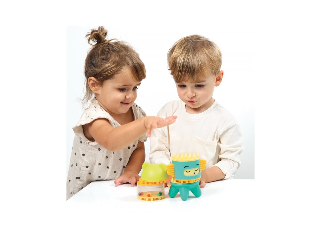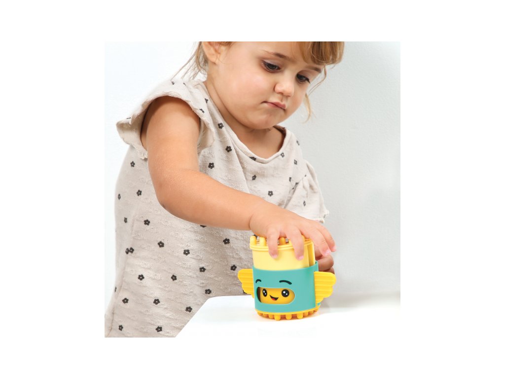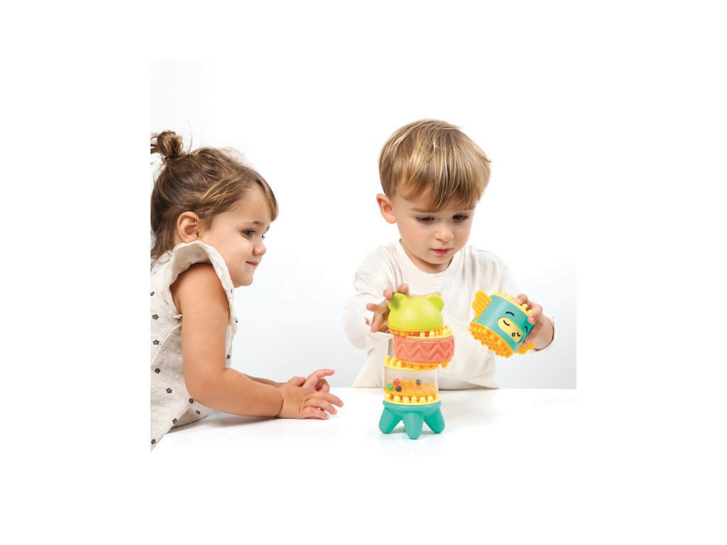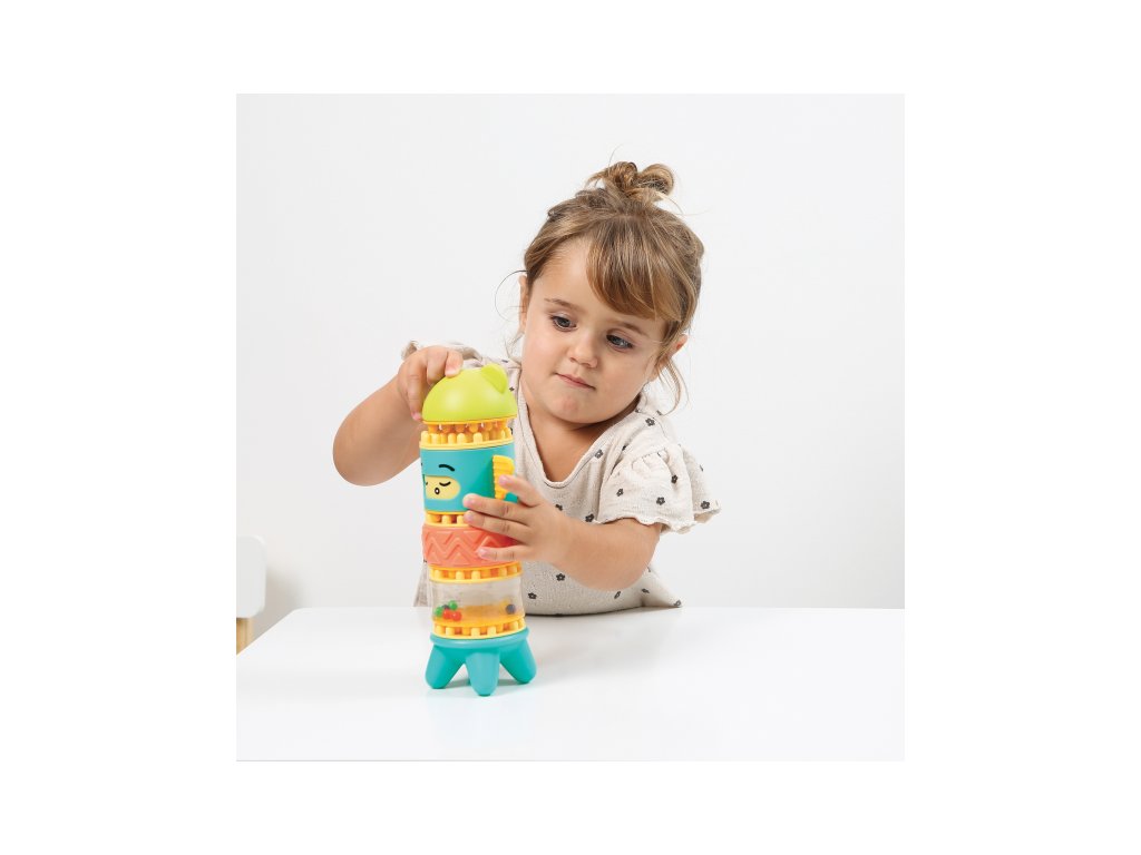 Stavebnice pro nejmenší se skládá se 6 dílů, které dítě skládá na sebe, až vytvoří figurku podobnou totemu. Spící obličejík na jednom z dílů se po zmáčknutí hlavy "probudí" a změní se na obličejík usměvavý. Díly je možné na sebe skládat pokaždé v jiném pořadí a vytvářet tak různé varianty věže. Stavebnice vede děti intuitivně k jednoduchým pohybům, které jsou klíčové pro rozvoj jemné motoriky: skládání, válení, spojování atd. Děti si procvičují úchop, prostorové vnímání, soustředění, a trpělivost při skládání dílků. Stavebnice je vyrobena z materiálu příjemného na dotek. Rozměry: 24 x 12 x 8 cm, Vhodné pro děti od 10 měsíců.