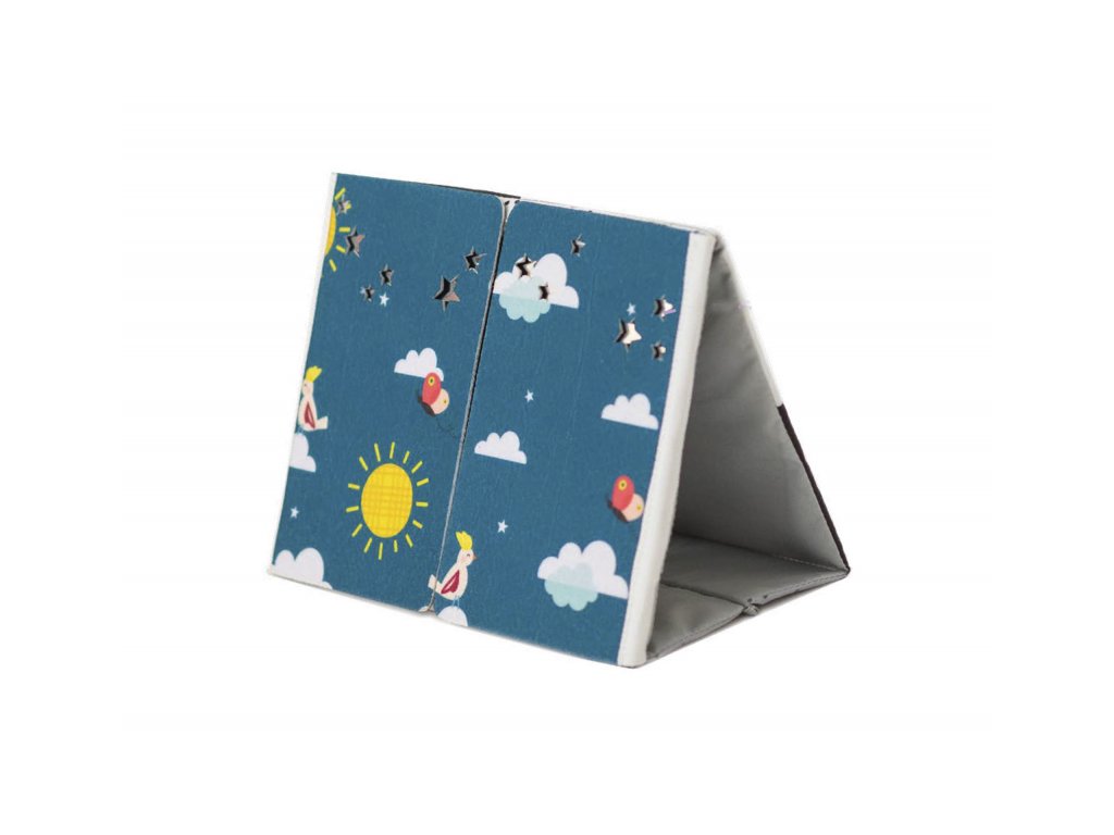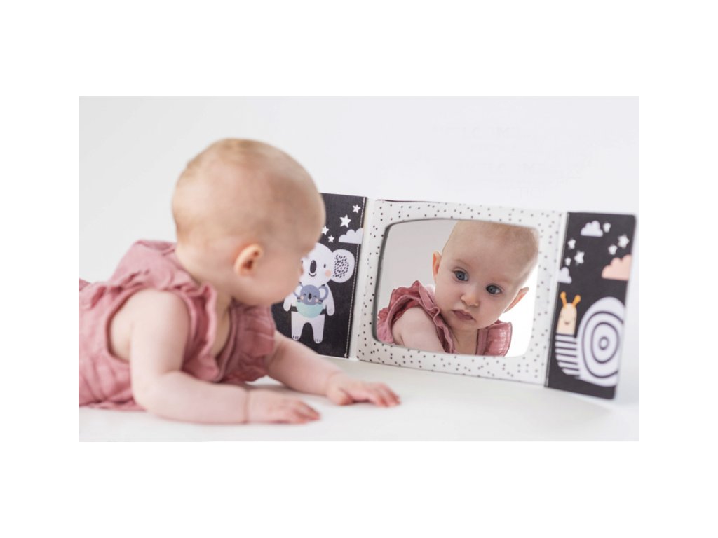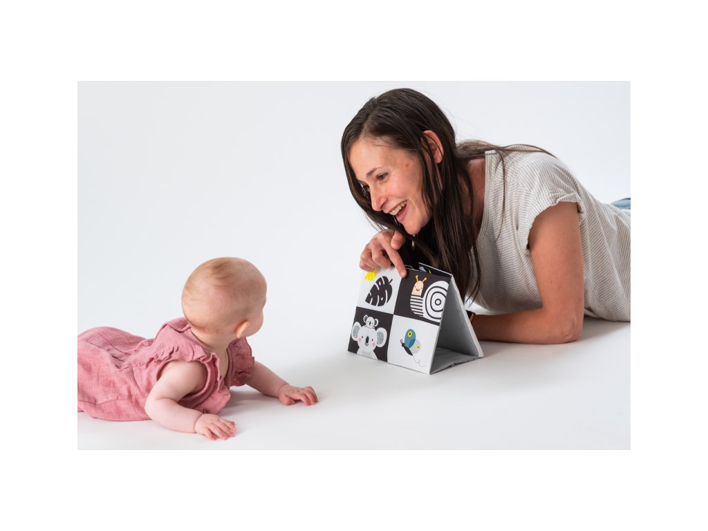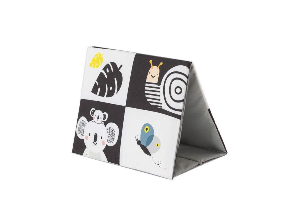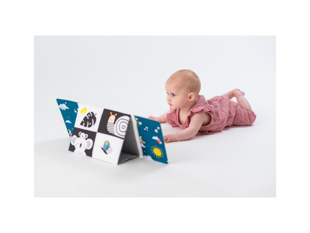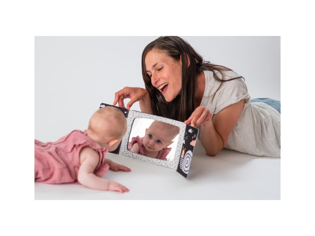 Textilní knížka ve tvaru stolního kalendáře je ideální pro postavení před dítě při hře na bříšku. Neodolatelné vysoce kontrastní obrázky a bezpečné velké zrcátko upoutají pozornost dítěte a pomáhají tak zabavit dítě při hře na bříšku. Zrcátko pomáhá dítěti učit se sebeuvědomění a podněcuje rozvoj jeho zraku a komunikačních dovedností. Zrcátko zakryté chlopněmi knihy lze využít i pro oblíbenou schovávací hru Peek-A-Boo mezi rodičem a dítětem. Knížka nabízí dva typy obrázků pro dvě vývojová stádia dítěte: 0-3 měsíce: bezpečné zrcátko a vysoce kontrastní jednoduché obrázky Od 3 měsíců: výrazné barevné obrázky Rozměry: 18,5 x 13,5 cm Vhodné pro děti od narození.Doplňkové parametry