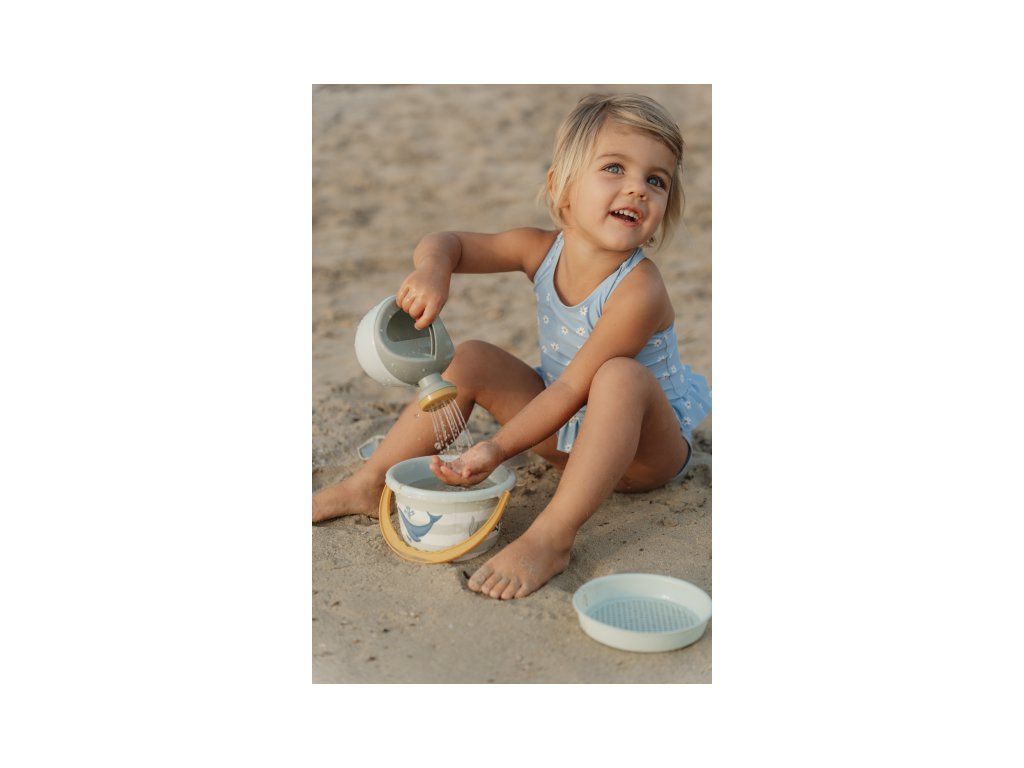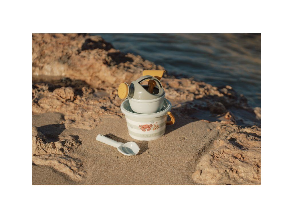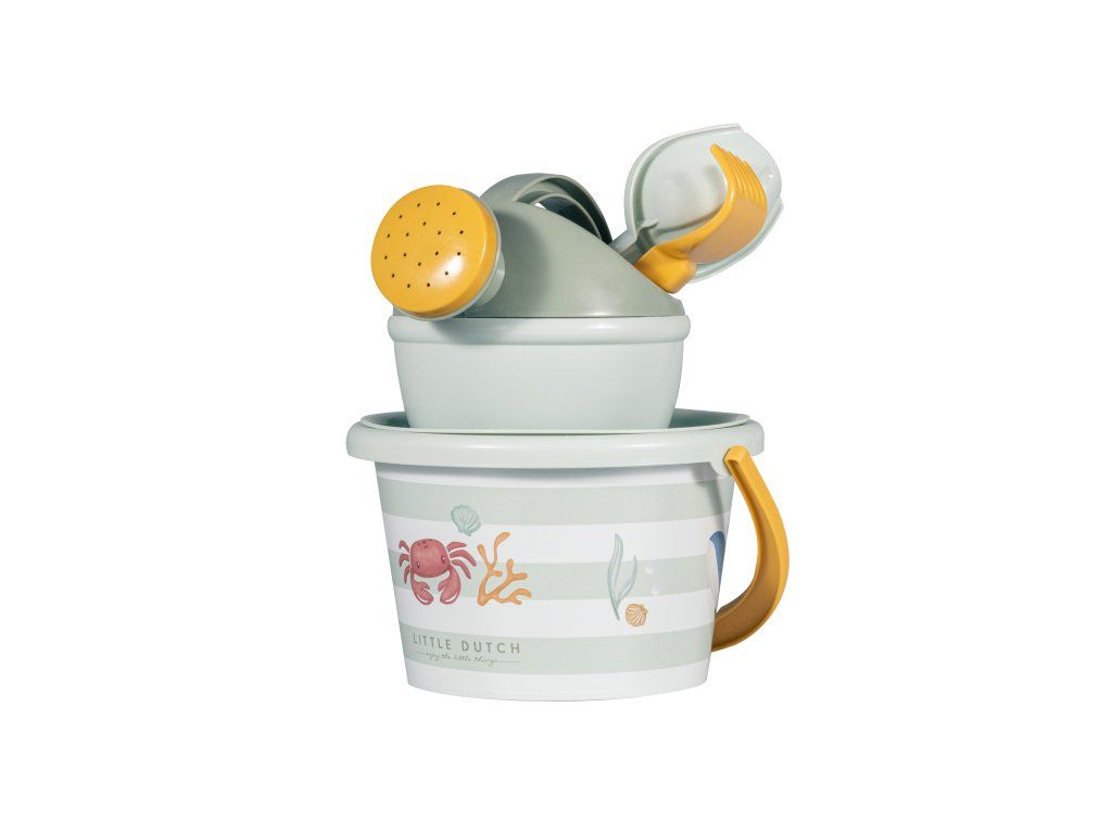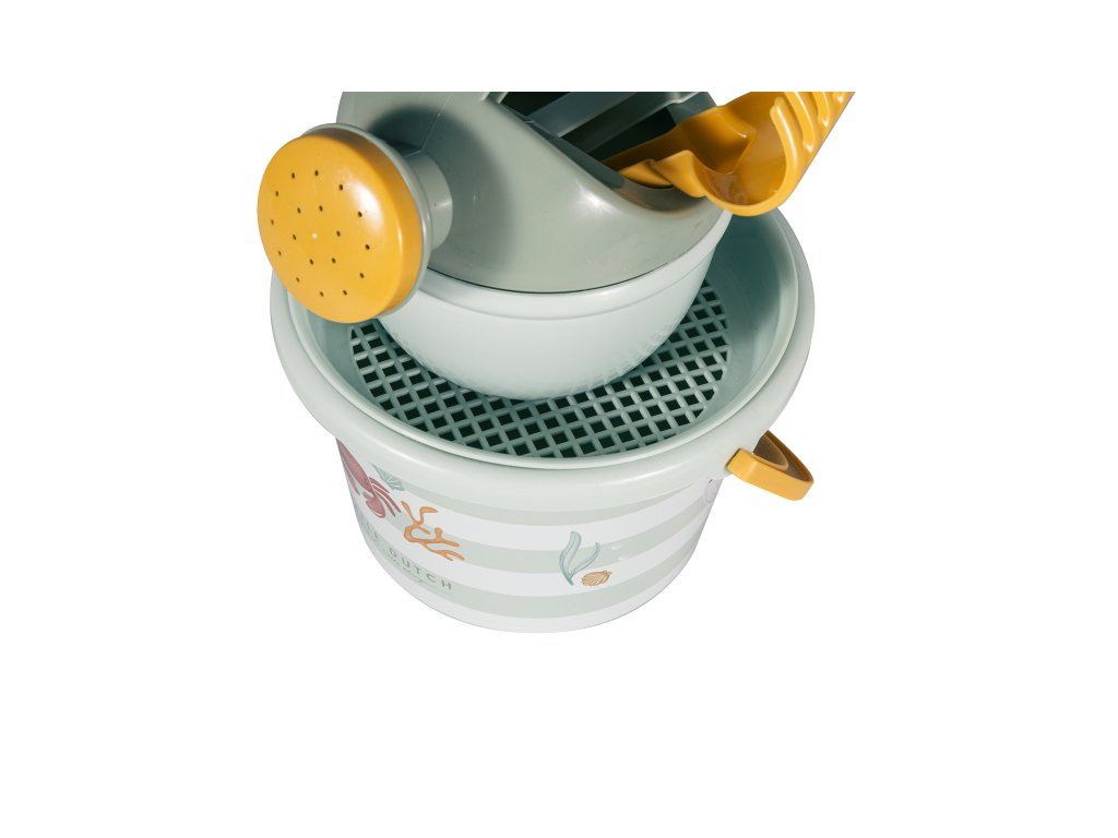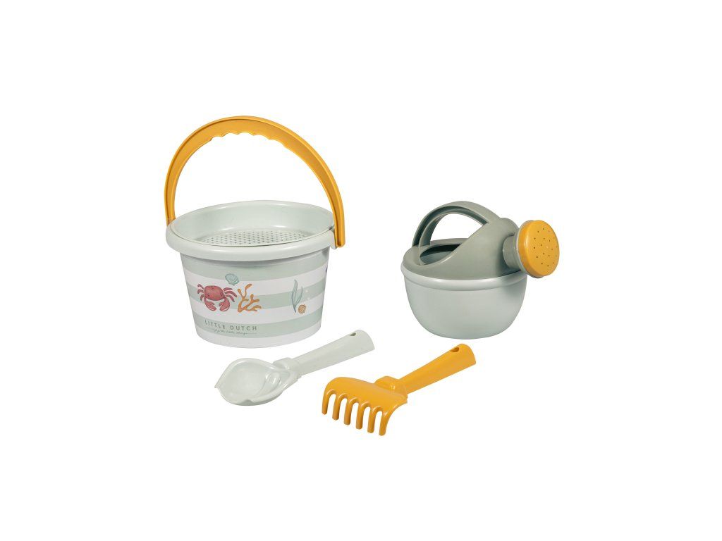 Sada na písek s krásným potiskem motivů ze života pod mořskou hladinou se bude dětem hodit doma na zahradě i u moře na pláži. Sadu tvoří kyblík, konvička, hrabičky, lopatka a sítko v kvalitním provedení z pevného plastu. Sada je součástí designové kolekce Little Dutch Fresh Green. Vhodné pro děti od 18 měsíců.Doplňkové parametry