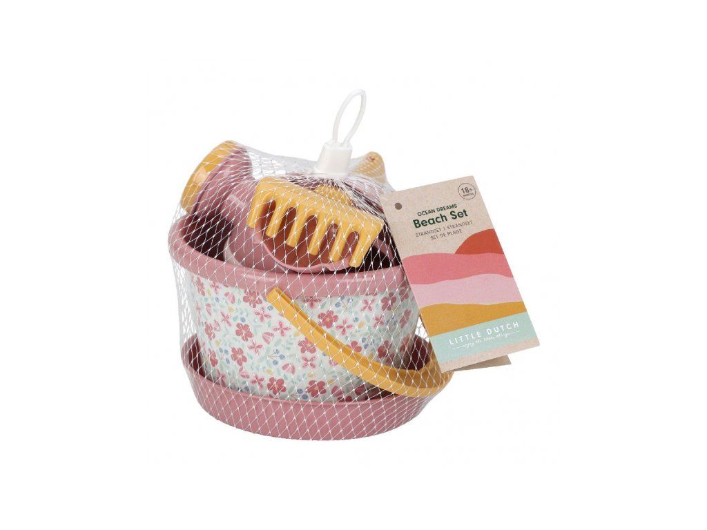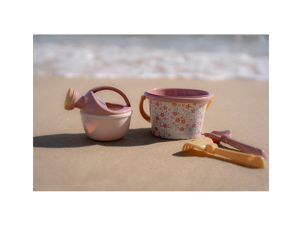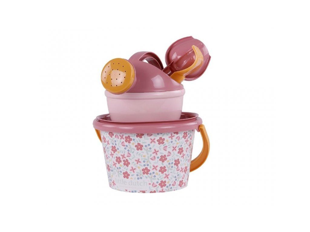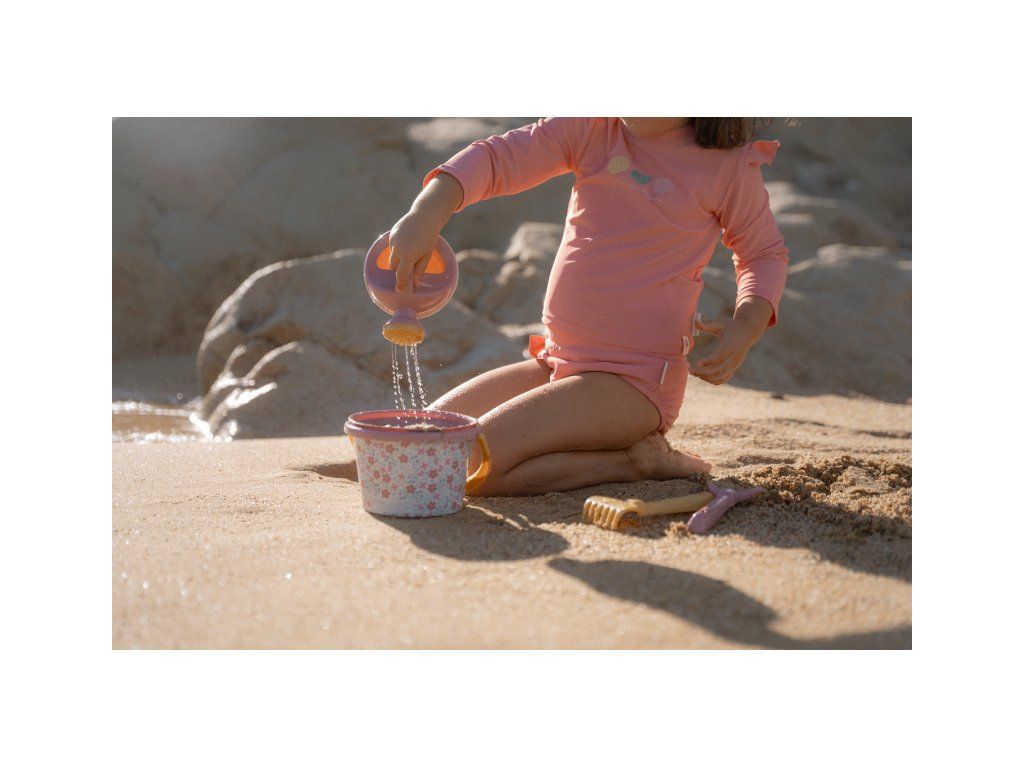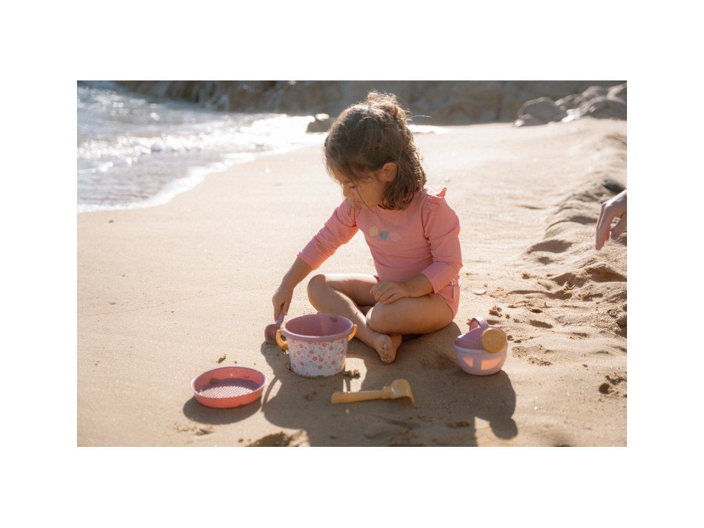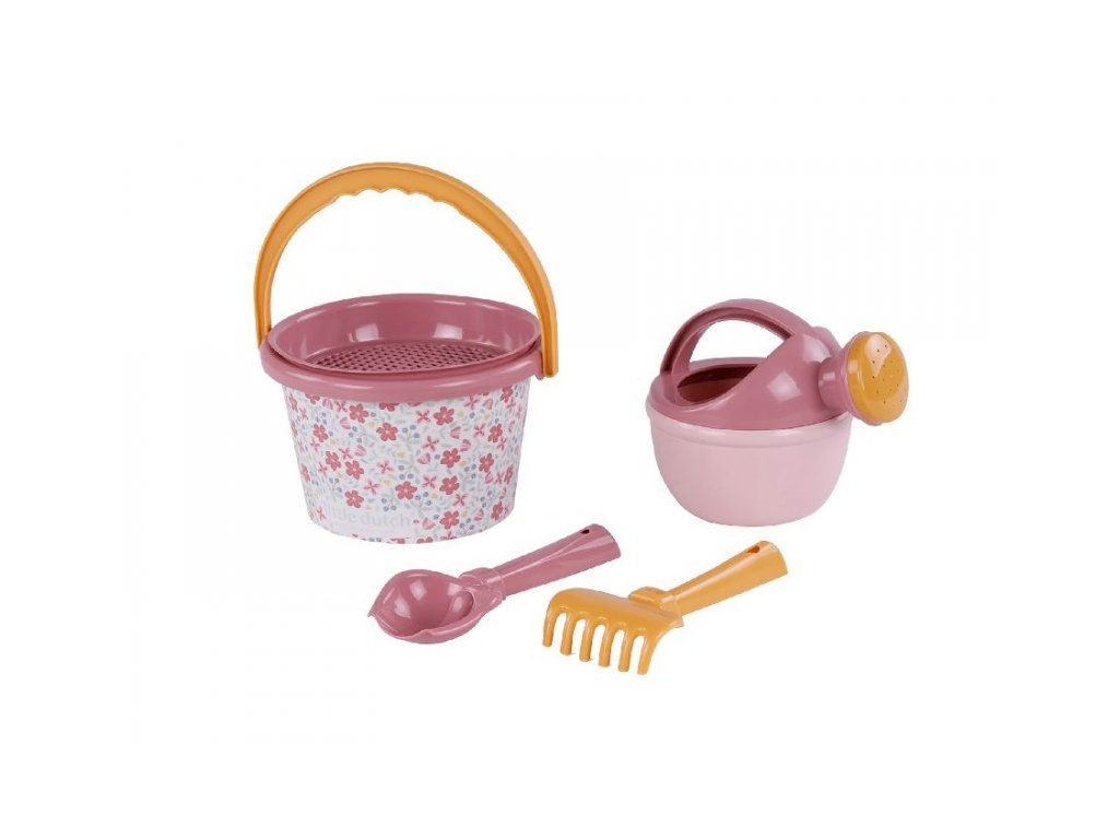 Sada na písek s krásným květinovým potiskem se bude dětem hodit doma na zahradě i u moře na pláži. Sadu tvoří kyblík, konvička, hrabičky, lopatka a sítko v kvalitním provedení z pevného plastu. Vhodné pro děti od 18 měsíců.Doplňkové parametry