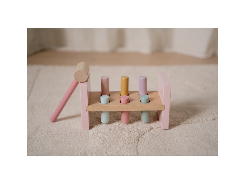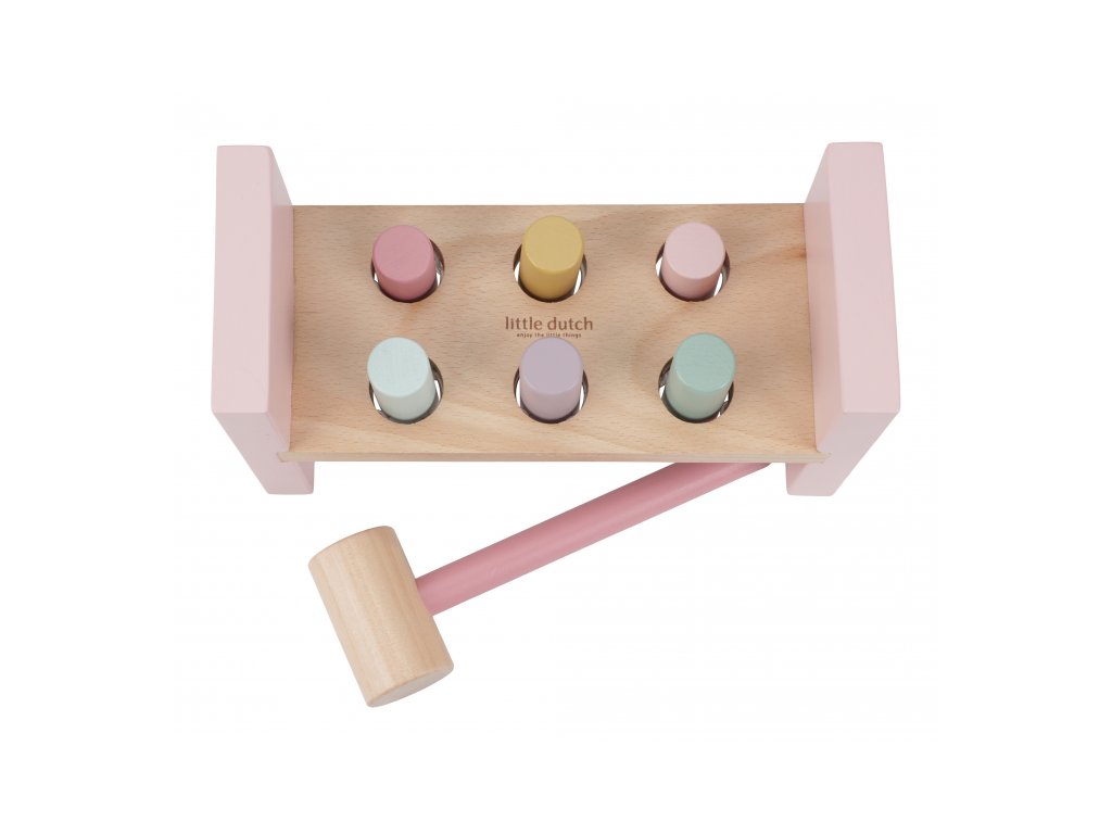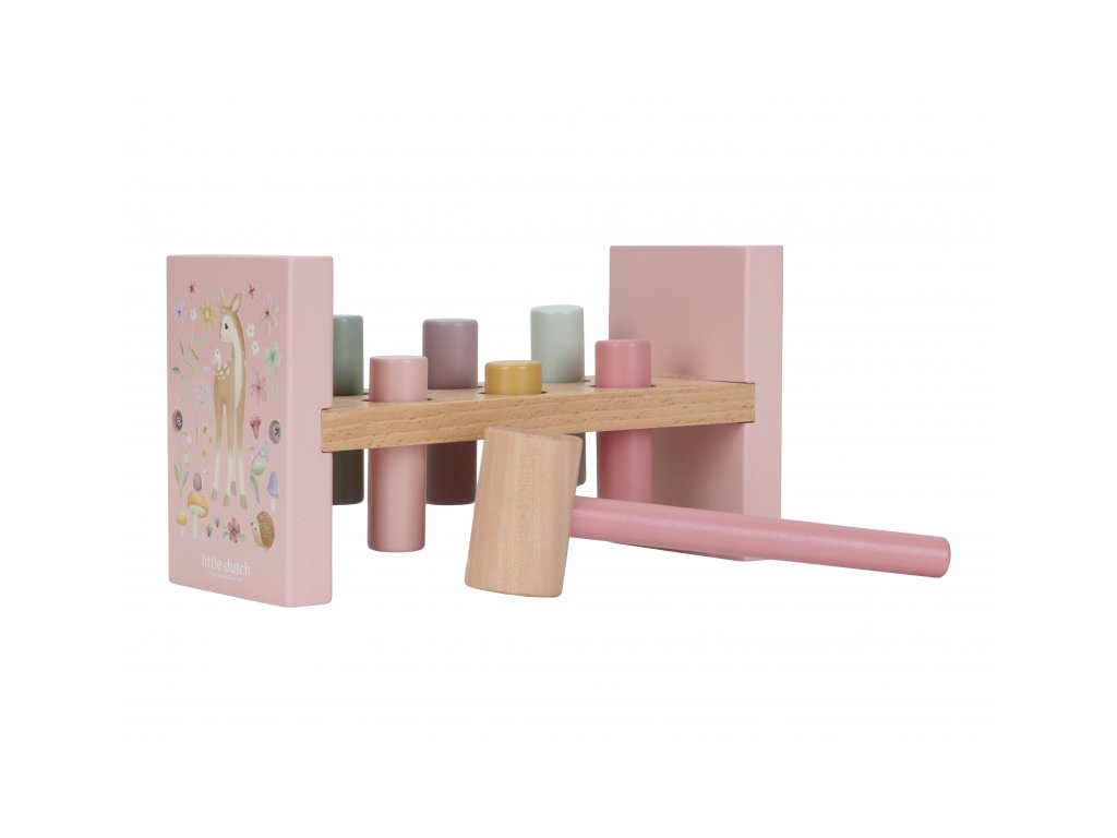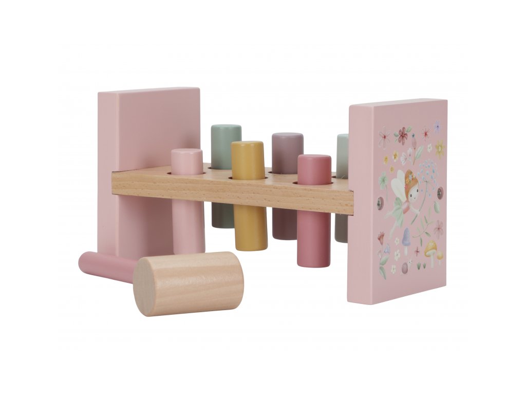 Klep sem, klep tam! Trefí vaše dítě všechny kolíčky? Pomocí kladiva je potřeba zatlouct 6 barevných kolíků do dřevěného stojanu. Až se to podaří, stačí stojan otočit a začít znovu! Můžete zatloukat pořád dokola! Hračka pomáhá rozvíjet jemnou motoriku vašeho dítěte. Zatloukačka je součástí designové kolekce hraček a doplňků Little Dutch Fairy Garden inspirované životem na zahradě. Vyrobeno z dřeva certifikovaného FSC. Rozměry: 23 x 16 x 11,5 cm Vhodné pro děti od 12 měsíců.Doplňkové parametry
