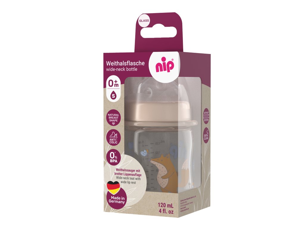 NIP Láhev sklo, široká, silikonLáhve se širokým hrdlem - pro šťastné bříško Láhve se širokým hrdlem jsou vyrobeny ze skla nebo plastu se speciálně vyvinutým systémem ACTIFLEX® a antikolikovým ventilkem. Měkký širokohrdlý dudlík dokonale vyhovuje patru dítěte a je přizpůsoben přirozenému sání dítěte. Široká opora rtů vytváří přirozený pocit, jako při sání z matčina prsu. Láhev se širokým hrdlem, SKLENĚNÁ › anatomicky ortodontický širokohrdlý dudlík vyrobený ze silikonu › umožňuje krmení bez nutnosti častých přestávek › systém ACTIFLEX® brání uzavírání dudlíku a zajišťuje tak nepřetržitý průtok › antikolikový odvzdušňovací ventilek zabraňuje polykání vzduchu, čímž se snižuje riziko dětské koliky › univerzální velikost 0m+ se širokou oporou pro dětské rty pro přirozený pocit při pití › lláhev vybavena dudlíkem velikosti S› láhev je vyrobena z tepelně odolného skla, neporézní a hladká › zakřivený tvar usnadňuje držení láhve › easy2clean - snadné plnění / snadné čištění › šroubovací kroužek s praktickým pomocníkem pro otevírání a zavírání › kryt chrání dudlík před kapáním i nečistotami › objem: 120 ml a 240 ml › bez BPA › vyrobeno v NěmeckuDoplňkové parametry