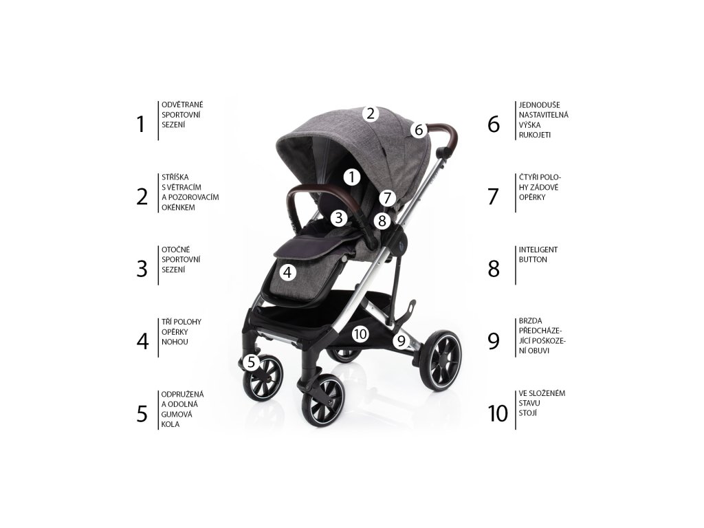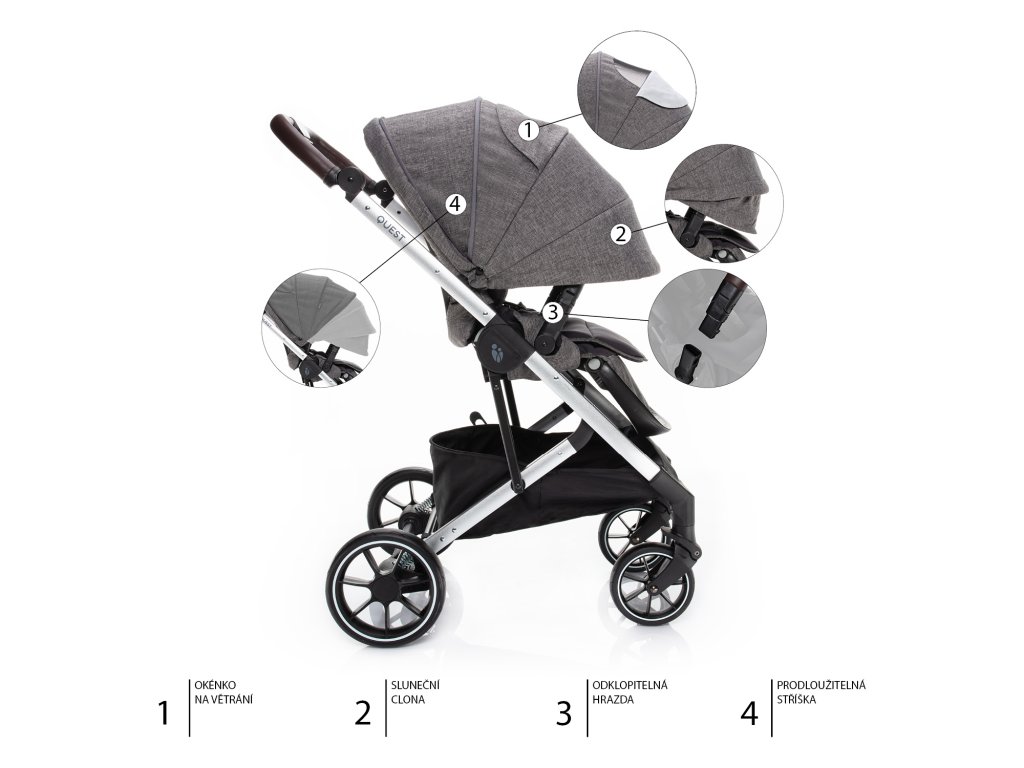 Od narození do 22 KgKomfort po celý rok Set kočárku Zopa Quest a hluboké korby se postará o pohodlnou jízdu od narození až do 22 Kg. Dítě má díky množství praktických vychytávek zajištěný maximální komfort v jakémkoliv ročním období. Součástí setu je podvozek se sportovním sezením, hluboká korba a adaptéry. Sporťák Kočárek QUEST je kromě prodloužitelné stříšky s větracím oknem vybaven také novým All Season Seat. Celá zádová opěrka je tvořena pevnou větrací síťkou, která je v chladných měsících uzavřena vložkou sportovního sezení. Tu můžete v letních měsících snadno sundat a vašemu malému pasažérovi tak vytvořit jedinečné, plně odvětrané sezení. Sedačku můžete nastavit do 4 poloh a k tomu upravit i 3polohovou opěrku pro nožičky. O bezpečí vašeho dítka se pak postarají 5bodové bezpečnostní pásy, které jsou výškově nastavitelné. Otočné sportovní sezení je důležité pro udržení kontaktu mezi rodičem a menším dítětem. Kočárek lze skládat s nasazeným sportovním sezením, a to ve směru i v proti směru jízdy. Podvozek a kolaPohodlná jízda u kočárku QUEST je zajištěna nejen kvalitním odpružením, ale i dostatečnou velikostí kol. Přední kola mají průměr 7 palců a zadní dokonce 9.Brzdový pedál je navržen tak, ať si nepoškodíte svou obuv, sešlapává se shora.Ve složeném stavu kočárek sám stojí. Nechtěnému rozložení brání pojistka umístěná po straně kočárku. Díky madlu se kočárek snadno přenáší. Novinkou je systém pojistek Intelligent buttons pro hladkou manipulaci a snadnější sundání sportovního sezení z podvozku. Hluboká korbaKorba kočárku Quest se pyšní velkým prostorem a měkkým polstrováním. Hlavovou část lze nastavit do 4 pozic, což je ideální kvůli případnému refluxu dítěte. Až se dítě převalí na bříško a bude chtít objevovat okolí, potěší ho, že celou přední část korby tvoří větrací okénko, ze kterého uvidí ven. Větrání se dá snadno uzavřít. Hlubokou korbu můžete po sejmutí z podvozku využít jako kolébku. Je známo, že všechny hluboké korby jsou poměrně náročné na prostor, což zvláště při převážení autem může znamenat problém. Proto přišla Zopa s inovativním řešením Easy folding. Pomocí pojistky na spodní straně dna korbu jednoduchým způsobem složíte naplacato. Rozložení je stejně snadné. Přednosti kočárku v kostce• Od narození (po dokoupení korby) až do 22 kg váhy dítěte• Hlubokou korbu lze složit a polohovat hlavovou část• Větrací okénko v přední části korby pro výhled z kočárku• Otočné sportovní sezení• Výškově nastavitelná rukojeť• Zádová opěrka s možností 3 poloh, nožní opěrka s možností 3 poloh• Odvětrávané sportovní sezení All seasons seat• Výškově nastavitelné 5bodové polstrované bezpečnostní pásy• Prodloužitelná stříška s větracím a pozorovacím okénkem• Nožní brzda předcházející poškození obuvi• Odklápěcí hrazda pro snadnější vkládání a vytahování dítěte• Měkké odpružení všech 4 kol• Kvalitní gumová kola odolná proti propíchnutí• Automatická aretace předních kol• Snadné skládání se sportovním sezením (pro oba směry)• Madlo na přenášení složeného kočárku• Inteligent buttons pro jednoduché sundání sportovního sezení z podvozku• Ve složeném stavu kočárek sám stojí a disponuje madlem na přenášení• Pojistka proti nechtěnému rozložení kočárku• Prostorný košík s nosností až 5 kg• Splňuje požadavky EN 1888:2018 Hmotnost a rozměry• Sporťák rozložený (D × Š × V): 92 × 55,5 × 110 cm• Sporťák složený (D × Š × V): 81 × 45,5 × 55,5 cm• Hmotnost sporťáku: 11 kg• Hluboká korba (D × Š × V): 84 × 43 × 67 cm• Hmotnost korby: 5,3 kg• Podvozek Quest vč. kol a madla: 8 kg • Sportovní sezení: 3,3 kg V ceně setu• Podvozek se sportovním sezením a stříškou• Nánožník• Pláštěnka• Hluboká korba• Adaptéry na autosedačkuDoplňkové parametry