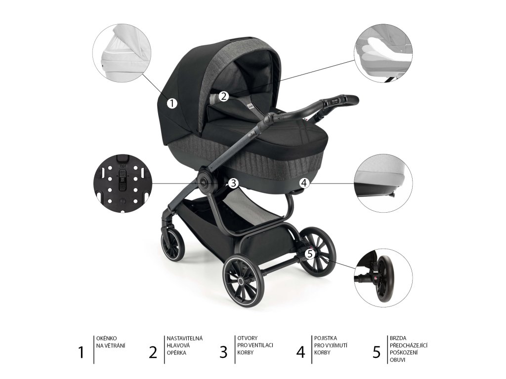Podvozek TECHNO + barevný komplet CAM LEVANTE Praktičnost, která jde ruku v ruce s minimalistickým designem pro moderní rodiče – to je unikátní barevný komplet LEVANTE na podvozky TECHNO. Zamilujete si ho nejenom pro jeho chytré a praktické funkce, které vám usnadní život, ale také díky rafinované černošedé barevné kombinaci. Díky bohatému polstrování se bude vaše dítě v hluboké korbě cítit komfortně a v bezpečí. V letních měsících oceníte propracovaný systém odvětrávání, který zaručí, že uvnitř korby bude i ve velkém teplu stálá přijatelná teplota. Houpací základna v kombinaci s měkkou matrací napomáhá vašemu dítěti k rychlému usnutí. Podvozek Techno má odpruženou konstrukci a praktické nástavby, které se snadno dají nasadit v obou směrech. Pro vaši komfortní jízdu jsou velká zadní a přední kola s aretací odpružená. Navíc, všechna mají odlehčené provedení – jsou vyrobena z materiálu EVA. Jejich velkou výhodou je, že se nedají propíchnout. Na cestách se proto můžete na ně stoprocentně spolehnout. Výškově nastavitelná rukojeť s ručním prošíváním z eko-kůže vám tento stylový a praktický kočárek krásně doladí. Na svých vyjížďkách či výletech určitě oceníte prostorný nákupní košík, kam můžete umístit nákup či všechny potřebné nezbytnosti. Navíc, podvozek kočárku se snadno skládá. Ve složeném stavu je velmi kompaktní, sám stojí a díky hmotnosti pouhých 7 kg vám usnadní manipulaci.Hluboká korba • Nastavitelná hlavová opěrka do 4 poloh • Integrovaná rukojeť se systémem Push open• Široká stříška s průhledem a moskytiérou• Měkké polstrování• Zábrana proti větru• Houpací základna• Prostorná taška na kočárek s přebalovací podložkou Sportovní sezení • Velká stříška s možností prodloužení• Nastavitelná zádová opěrka do 4 poloh• Nastavitelná opěrka nohou• 5 bodový bezpečnostní pás• Prostorný nánožník• Možnost nasazení po i proti směru jízdy Podvozek • Hliníkový rám• Výškově nastavitelná rukojeť• Přední otočná kola s aretací• Odpružení• Synchronizovaná brzda• Váha 7 kg• Volně stojící ve složeném stavu Součástí kompletu: Hluboká korba, sportovní sezení, podvozek, přebalovací taška, přebalovací podložka, nánožník, stříška pro autosedačku a polstrování ramenních pásů autosedačky.Doplňkové parametry