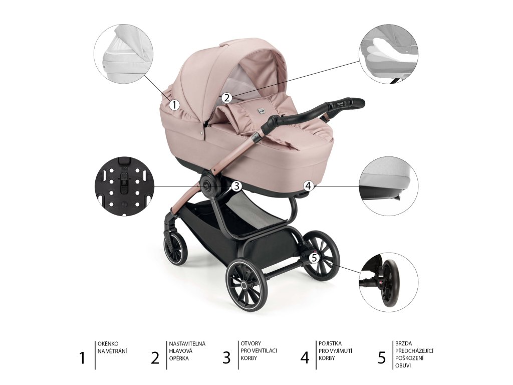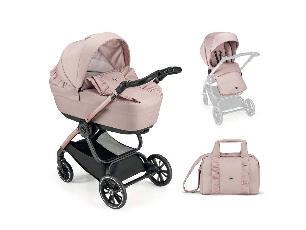 Podvozek TECHNO + barevný komplet CAM LOVING C527 Funkčnost a pohodlí zabalené do romantického designu z italské dílny CAM – to je komplet LOVING s podvozkem Techno. Vyměňte dvěma jednoduchými pohyby korbu pro miminko za sportovní kočárek, který hravě zvládne všechny nástrahy. Komplet LOVING v jemné starorůžové barvě si zamilujete pro mašle a volánky, do kterých je sladěná korbička, sportovní sezení i velká přebalovací taška. Měkké polstrování zajistí, že se bude vaše dítě v hluboké korbě cítit komfortně a v bezpečí. V letních měsících oceníte propracovaný systém odvětrávání, který zaručí, že uvnitř korby bude i ve velkém teplu stálá přijatelná teplota. Houpací základna v kombinaci s měkkou matrací napomáhá vašemu dítěti k rychlému usnutí. Podvozek Techno má odpruženou konstrukci a praktické nástavby, které se snadno dají nasadit v obou směrech. Pro vaši komfortní jízdu jsou velká zadní a přední kola s aretací odpružená. Navíc, všechna mají odlehčené provedení – jsou vyrobena z materiálu EVA. Jejich velkou výhodou je, že se nedají propíchnout. Na cestách se proto můžete na ně stoprocentně spolehnout. Výškově nastavitelná rukojeť s ručním prošíváním z eko-kůže vám tento stylový a praktický kočárek krásně doladí. Na svých vyjížďkách či výletech určitě oceníte prostorný nákupní košík, kam můžete umístit nákup či všechny potřebné nezbytnosti. Navíc, podvozek kočárku se snadno skládá. Ve složeném stavu je velmi kompaktní, sám stojí a díky hmotnosti pouhých 7 kg vám usnadní manipulaci. Hluboká korba • Nastavitelná hlavová opěrka do 4 poloh • Integrovaná rukojeť se systémem Push open• Široká stříška s průhledem a moskytiérou• Měkké polstrování• Zábrana proti větru• Houpací základna• Prostorná taška na kočárek s přebalovací podložkou Sportovní sezení • Velká stříška s možností prodloužení• Nastavitelná zádová opěrka do 4 poloh• Nastavitelná opěrka nohou• 5 bodový bezpečnostní pás• Prostorný nánožník• Možnost nasazení po i proti směru jízdy Podvozek • Hliníkový rám• Výškově nastavitelná rukojeť• Přední otočná kola s aretací• Odpružení• Synchronizovaná brzda• Váha 7 kg• Volně stojící ve složeném stavu Součástí kompletu:Hluboká korba, sportovní sezení, podvozek, přebalovací taška, přebalovací podložka, nánožník, stříška pro autosedačku a polstrování ramenních pásů autosedačky.Doplňkové parametry