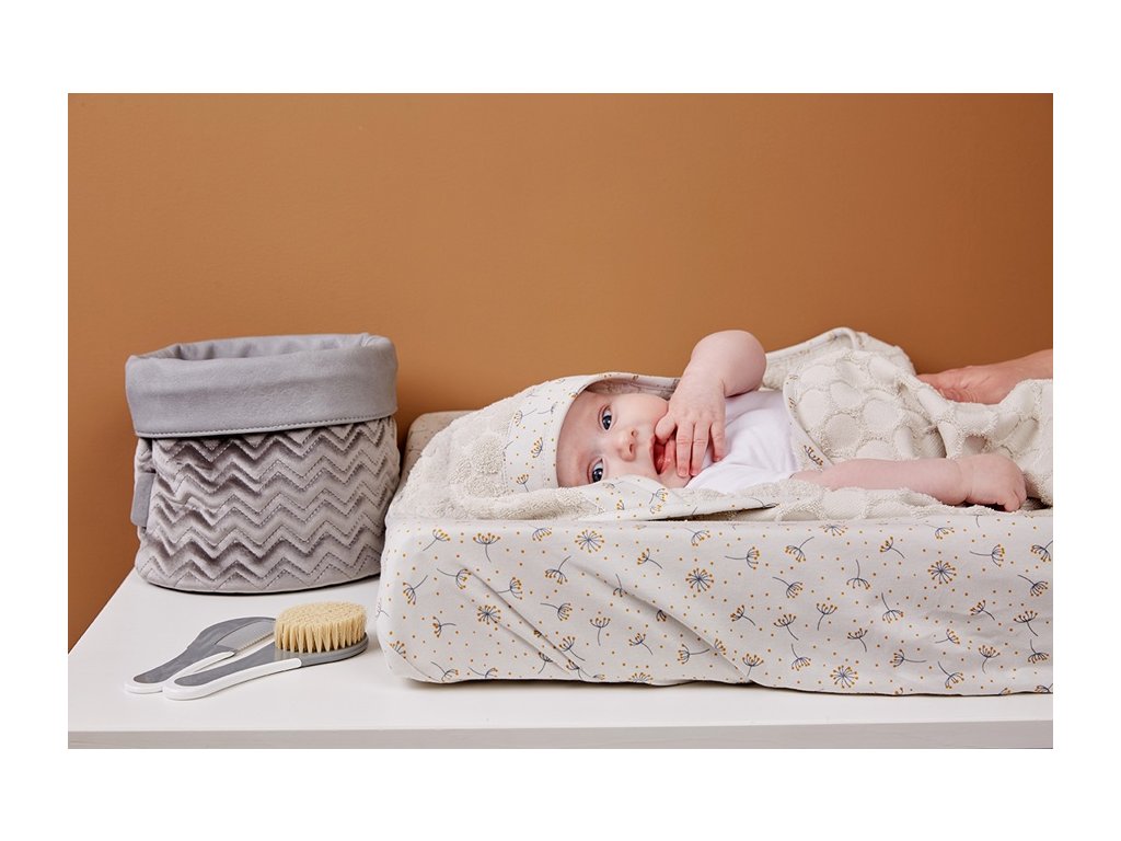 Máte dostatek místa na přebalování? Pak si zvolte velkou neutrální světle šedo-krémovou antialergickou komfortní omyvatelnou přebalovací podložku se zvýšenými okraji pro maximální bezpečnost.Přebalovací podložka vám usnadní přebalování vašeho maličkého i další péči o jeho pokožku. Je omyvatelná a tím i antialergická (již žádný prach), měkoučká a tepelně izolační. Její tvar se zvýšenými okraji stabilizuje miminko uprostřed a brání tak v prvních měsících jeho překulení a následnému pádu. Později, až je dítě větší, může mít dostatek energie tuto překážku překonat. Proto nikdy ( ani po narození) nenechávejte dítě na přebalovací podložce bez dozoru. Pokud je umístěna na komodě či stole, hrozí nebezpečí pádu. Potah je tvořen nepromokavou látkou PUL, vnitřní vrstva je 100% polyester, vnější potištěná vrstva je ze 100% polyuretanu. Vyperete jej v pračce na 30°C. Látka i pěna jsou prodyšné a jsou vyrobeny z ekologicky šetrných materiálů a jsou bez škodlivých látek, což potvrzuje certifikát ÖKO TEX 100. luxusní dostatek místa pro všechny úkony spojené s péčí o Vaše miminko komfortní potah podložky, potištěný jemným vzorem, je velmi příjemný na dotek materiál potahu je omyvatelný a prací na 30°C zvýšené okraje pro maximální bezpečnost Hmotnost: 0,991 kg. Rozměry: 77 x 74 x 9 cm.Doplňkové parametry