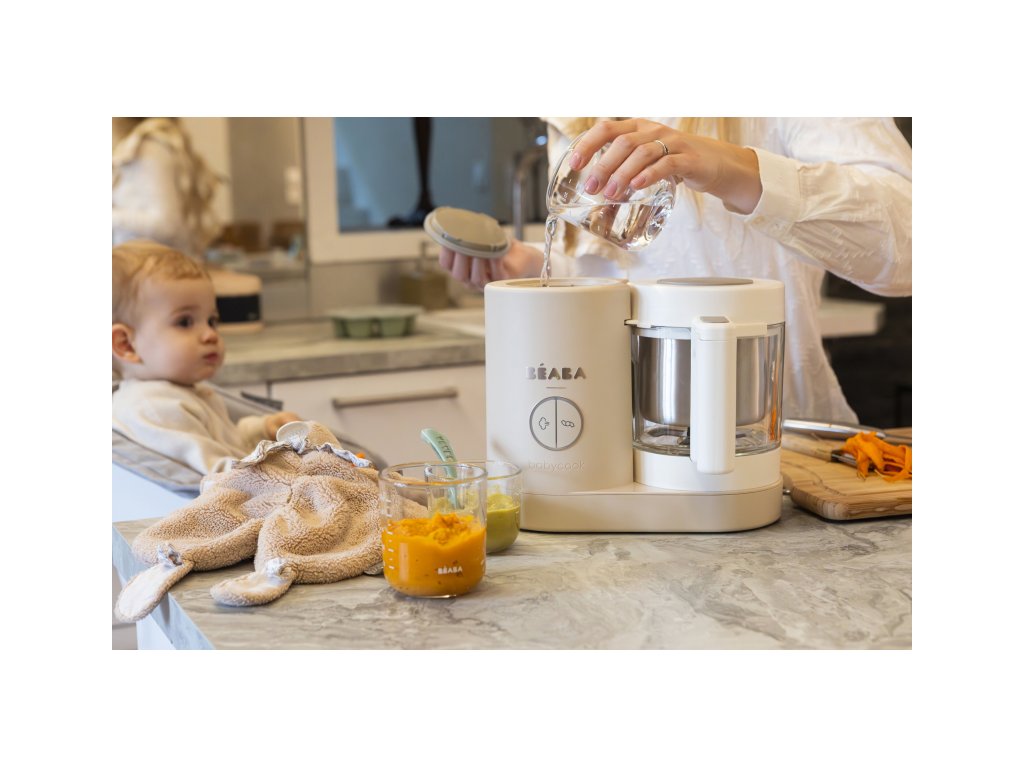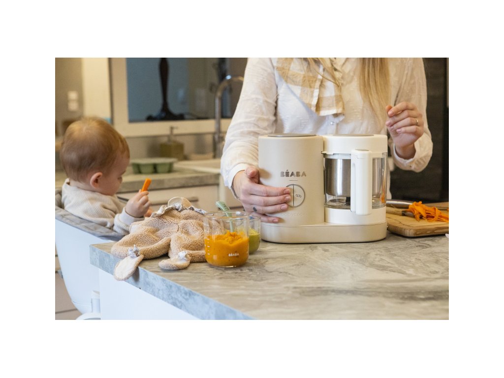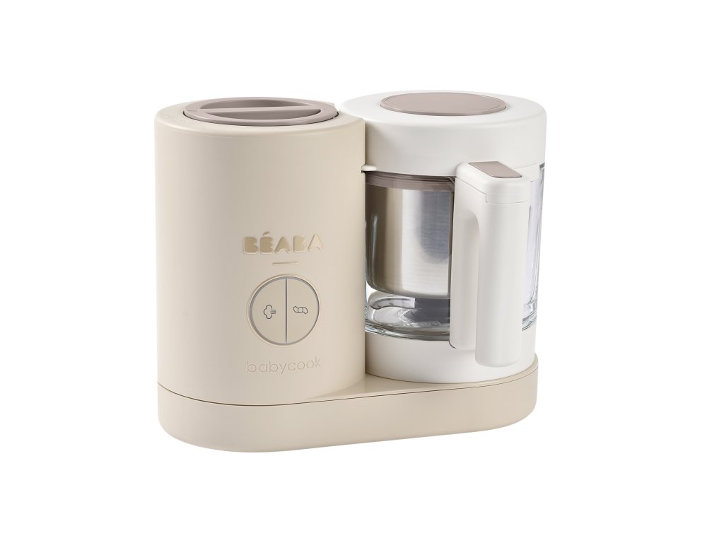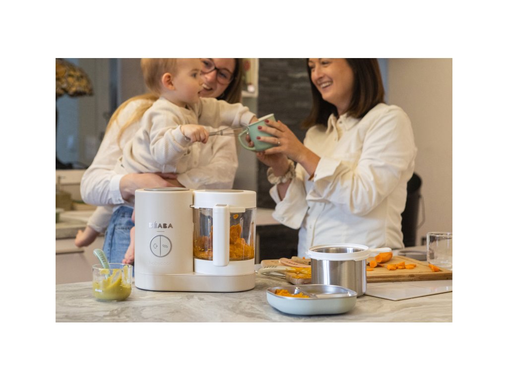 Skvělou pomoc při přípravě pokrmů pro děti představuje parní hrnec a mixér v jednom Babycook® Beaba. Babycook® umožňuje zdravě uvařit pokrm v páře a následně ho ve stejné nádobě rozmixovat. Zcela nový model Babycook® NEO má skleněnou nádobu s objemem 1250 ml a nerezový vkládací košík s objemem 1000 ml. Nerezový zásobník na vodu s vnitřní ryskou a se širokým vstupním otvorem usnadňuje plnění vodou i čištění zásobníku. Příprava jídla v Babycooku je velmi snadná – pouze do něj nalijete vodu, do vkládacího košíku vložíte na kousky nakrájené suroviny (zeleninu, maso atd.) a přístroj zapnete. Po skončení vaření (trvá nejdéle 15 min) se Babycook sám vypne. Chcete-li následně pokrm rozmixovat, pouze vysypete uvařené suroviny z vkládacího košíku do průhledné hlavní nádoby a rozmixujete (podle věku dítěte na jemnou hladkou kaši, nebo na hrubší strukturu s kousky). Když se dítě naučí dobře kousat, dá se Babycook® dále používat pro zdravé vaření v páře i bez mixování. Přístroj je možné použít i pro rozmrazování a ohřívání dětské stravy. Příkon: 400 WDoplňkové parametry