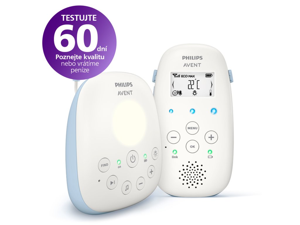 S novou řadou monitorů DECT Philips AVENT můžete v klidu odpočívat s vědomím, že je vaše dítě spokojené, i když s ním nejste v místnosti. Vlastnosti: - snímače teploty - digitální displej - možnost komunikace s dítětem Nová řada monitorů DECT poskytuje množství neocenitelných vlastností. Digitální technologie vás upozorní i na nejtišší šepot a umožní vám uklidnit vaše dítě díky spojení s garancí nulového rušení v domě a v jeho okolí. Funkce: - 100% spolehlivé spojení s dítětem - Kontrolky LED indikují, zda je jednotka připojena a zda je v dosahu - Kontrolky aktivované zvukem indikují, zda miminko vydává nějaké zvuky - Nabíjecí rodičovská jednotka s dobou provozu až 24 hodin Co je na tomto monitoru zajímavého? - Režim Smart ECO zajišťuje efektivní využívaní energie - Snímač teploty s nastavitelnými výstrahami - Příjemné noční světlo a ukolébavky uklidní vaše ratolesti - Obousměrná komunikace - miminko vás může slyšet - Dosah ve volném prostoru až 330 m - o 33 % delší výdrž baterie než Philips Avent SCD711/SCD713 Získejte výhodu 60 denní záruky vrácení peněz Zjistit více informací zde: www.philips.cz/mbg-avent Nebezpečí -Nikdy neponořujte elektronickou chůvičku ani její součásti do vody nebo jiné kapaliny. Přístroj nepokládejte na místo, kde na něj může kapat nebo stříkat voda či jiná kapalina. Nikdy nepoužívejte elektronickou chůvičku na vlhkých místech nebo blízko vody. -Nepokládejte na ni žádné předměty a nezakrývejte ji. Nezakrývejte ventilační otvory. Instalujte podle pokynů výrobce. Varování -Dlouhý kabel. Riziko uškrcení! -Než přístroj připojíte k síti, zkontrolujte, zda napětí uvedené na adaptéru souhlasí s napětím v místní elektrické síti. -Používejte pouze dodaný síťový adaptér. -Model: S005Bxy0600050 -Vlastnosti: Vstup: 100–240 V~, 50/60 Hz, 0,15 A Výstup: 6,0 V 0,5 A, 3 W -xy=NV (zástrčka EU) nebo xy=NB (zástrčka VB) -Průměrná aktivní účinnost: 74,38 % -Spotřeba energie bez zátěže (W): 0,1 W, TŘÍDA ÚČINNOSTI VI -Žádnou část adaptéru ani šňůry neupravujte ani nezkracujte. Mohlo by to vést k nebezpečné situaci. -Pokud dojde k poškození adaptéru, musíte jej vždy nahradit adaptérem původního typu, abyste předešli možnému nebezpečí. -Děti od 8 let věku a osoby s omezenými fyzickými, smyslovými nebo duševními schopnostmi nebo nedostatkem zkušeností a znalostí mohou tento přístroj používat v případě, že jsou pod dohledem nebo byly poučeny o bezpečném používání přístroje a chápou rizika, která mohou hrozit. Děti si s přístrojem nesmí hrát. Čištění a uživatelskou údržbu nesmí provádět děti bez dozoru. -Napájecí kabel chraňte před pošlapáním nebo přiskřípnutím, zejména v oblasti zástrček a místa, kde z přístroje vychází kabel. -Elektronickou chůvičku je nutné umístit tak, aby kabel nepřekážel ve dveřích nebo v chodbě. Pokud elektronickou chůvu umístíte na stůl nebo nízkou skříňku, nenechávejte napájecí kabel viset přes okraj stolu nebo skříňky. Kabel nesmí ležet na zemi, kde o něj lze zakopnout. -Balicí materiály (plastové sáčky, kartonové výztuže apod.) uložte mimo dosah dětí. Nejedná se o hračky. -Aby nedošlo k úrazu elektrickým proudem, neotvírejte kryt dětské ani rodičovské jednotky. Bezpečnostní pokyny k bateriím -Výrobek používejte pouze k zamýšlenému účelu. Před použitím přístroje, baterií a příslušenství si pečlivě přečtěte tyto informace a uschovejte je pro budoucí použití. Nevhodné použití s sebou může nést rizika a závažné zranění. Dodané příslušenství se může u různých produktů lišit. -Výrobek nabíjejte, uchovávejte a používejte při teplotě od 0 °C do 40 °C. -V jednotce SCD710/SCD711/ SCD713/SCD720/SCD721/SCD723/SCD730/SCD731 používejte výhradně tyto baterie: -Rodičovská jednotka: používejte sadu baterií (Philips 130AAHC 1,2 V, 1300 mAh). -Dětská jednotka: používejte certifikované baterie (alkalické baterie 1,5V AA R6 bez možnosti nabíjení nebo nabíjecí akumulátory 1,2V AA HR6 Ni-HM type 1300 mAh (maximálně)). -V jednotce SCD715/SCD725/SCD733/SCD734/SCD735 používejte výhradně tyto baterie: -Rodičovská jednotka: používejte sadu baterií (GP 180AAHC 1,2 V, 1800 mAh). -Dětská jednotka: používejte certifikované baterie (alkalické baterie 1,5V AA R6 bez možnosti nabíjení nebo nabíjecí akumulátory 1,2V AA HR6 Ni-HM type 1800 mAh (maximálně)). -V rodičovské jednotce používejte výhradně nabíjecí akumulátory dodávané s rodičovskou jednotkou. V rodičovské jednotce nenabíjejte baterie, které nejsou určeny k dobíjení. -Nabíjecí akumulátory do dětské jednotky nabíjejte v samostatné nabíječce baterií. -Výrobek a baterie udržujte mimo dosah ohně a nevystavujte přímému slunečnímu světu ani vysokým teplotám. -Knoflíkové baterie vždy uchovávejte mimo dosah dětí. Spolknutí takové baterie může způsobit vážné poranění nebo smrt. -Pokud se výrobek nenormálně zahřeje, vydává zápach, změní barvu nebo pokud nabíjení trvá mnohem déle než obvykle, přestaňte výrobek používat a nabíjet a obraťte se na společnost Philips. -Výrobky ani baterie nedávejte do mikrovlnné trouby ani na indukční sporáky. -Výrobek ani baterie neotevírejte, neupravujte, nepropichujte, nepoškozujte ani nerozebírejte, aby nedošlo k přehřívání baterií nebo uvolnění jedovatých či nebezpečných látek. Zabraňte zkratování, přebíjení nebo záměně pólů baterií. -Pokud jsou baterie poškozené nebo z nich uniká tekutina, zamezte kontaktu s kůží nebo očima. Pokud by k něčemu takovému došlo, příslušné místo oplachujte vodou a vyhledejte lékařskou pomoc. -Při manipulaci s baterie