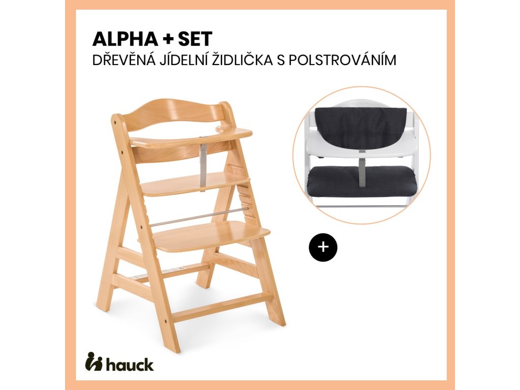 Alpha+ SET> Vysoce kvalitní jídelní židle ze dřeva s prémiovým nátěrem s pohodlným polstrováním> Mezi-nožní pás v koženém vzhledu> Vysoce kvalitní lazurování> Povrchově ušlechtilé kovové prvky> Rostoucí od 6 měsíců - na celý život> Obzvláště stabilní, odolná proti převrhnutí, zátěž do 90 kg> Přírodní produkt z evropského bukového dřeva> Výškově nastavitelné sedadlo a opěrka nohou> 2 bezpečnostní pásy pro ještě větší bezpečnost> Včetně ALPHA+ ochranného obloukuPolstrování Deluxe k židli Alpha+ > Dvoudílný potah na jídelní židličku> Na Alpha+ a podobné modely> Měkké polstrování> Jednoduše odnímatelný a omyvatelný VIDEO : https://www.youtube.com/watch?v=FzGDsYMojhYhttps://www.youtube.com/c/hauckde/videoshttps://www.youtube.com/watch?v=bB9jxtqy6Bshttps://www.youtube.com/watch?v=YuUvfvwMa5Ehttps://www.youtube.com/watch?v=Rh4dXYGjIdwhttps://www.youtube.com/watch?v=SjHejDVg_JMhttps://www.youtube.com/watch?v=QyqcbAIkPkM Udržitelný životní styl // Naše židlička ALPHA+ je pravý přírodní produkt z dorůstajícího evropského bukového dřeva. Hauck tak přispívá k ochraně životního prostředí a již dnes pomýšlí na příští generaci rodičů.Mimořádně kvalitní // Mezi-nožní pás ve vzhledu kůže, lazurované bukové dřevo a povrchově zušlechtěné kovové prvky tvoří prémiový vzhled židličky ALPHA+, židlička bude ozdobou vašeho pokoje.Roste s Vámi celý život // Židlička ALPHA+ je vhodná od cca. 6 měsíců a díky nastavitelnému sedadlu a opěrce nohou roste spolu s dítětem po celý život. Je robustní, její nosnost činí až 90 kg a konstrukčně poskytne maximální stabilitu. Převrhnutí se rozhodně bát nemusíte. Bezpečnostní příslušenství // Kromě ochranného oblouku a mezi-nožního pásu je součástí balení ALPHA+ také 5bodový systém pásů, který miminku v raném období poskytne ještě více bezpečí.Vysoký komfort při sezení // Dvoudílný potah poskytne vašemu maličkému maximální komfort během každého jídla díky měkkému polstrování.Snadné připevnění //Potah lze zcela jednoduše připevnit pomocí suchého zipu na dřevěnou jídelní židličku ALPHA+ nebo na konstrukčně podobné modely, případně se rychle odejme pro vyprání. Alpha+ JÍDELNÍ ŽIDLEMimořádně kvalitně zpracovaný produkt ALPHA+ s prémiovou povrchovou úpravou je jedním z našich špičkových produktů řady ALPHA+. Mezi-nožní pás s koženým vzhledem dokonale ladí s lazurovaným bukovým dřevem vysoké židličky a elegantní celek dotvářejí kovové prvky s povrchovou úpravou. ALPHA+ je ideální volbou pro moderní rodiče, kteří hledají kvalitní dřevěnou vysokou židličku, která roste s jejich dítětem a díky svému elegantnímu vzhledu snadno zapadne do osobního designu bydlení.V ALPHA+ může váš malý miláček sedět u stolu společně s vámi přibližně od 6 měsíců. Naše židlička ALPHA+ je skutečně přírodní produkt vyrobený z obnovitelných zdrojů evropského bukového dřeva. Je nejen mimořádně stabilní a odolný proti převržení, ale také mimořádně pevný z vysokou nosností.Výškově a hloubkově nastavitelný sedák a podnožka umožňují vysokou židličku kdykoli flexibilně přizpůsobit výšce dítěte a zajistit ergonomicky správnou a pohodlnou polohu při sezení.Kromě ochranného oblouku ALPHA+ a mezi-nožního pásu je součástí židličky také pětibodový systém bezpečnostních popruhů, který vašemu miláčkovi poskytne při prvním období ve vysoké židličce ještě větší bezpečí.ALPHA+ je ideální pro děti do přibližně 12 let, ale nabízí pohodlné sezení také pro dospělé do 90 kg, takže je praktickým společníkem na celý život. Polstrování Deluxe k židli Alpha+Tento dvoudílný potah slouží jako měkké polstrování nebo ke zmenšení sedadla a představuje tak ideální doplněk k hauck jídelním židlím Alpha+ nebo konstrukčně podobným modelům.Polstrování sedadla a zad je vybaveno vysoce kvalitní výplní, čímž zaručí optimální komfort. Sedí zcela přesně a upevní se na dětské jídelní židličce pomocí suchých zipů, případně se stejně jednoduše odejme pro potřeby vyprání.Polstrování je dostupné v mnoha různých provedeních. V balení:> 5-ti bodový pás, > vysoká židlička, > ochranný oblouk, > bezpečnostní popruh+ polstrování sedátkaV souladu s normami: EN 14988:2017+A1:2020 (dětské vysoké židle), UPOZORNĚNÍ: Nikdy nenechávejte dítě bez dozoru. Výrobek je určen pro děti, které umí sedět samy bez pomoci a nejvýše do 3 let věku nebo maximální hmotnosti 15 kg.EN 12520:2016 (s křesílkem – požadavky na bytový sedací nábytek), EN 17191:2021 (dětská židle – požadavky na sedací nábytek pro děti), UPOZORNĚNÍ: Nikdy nenechávejte dítě bez dozoru. Výrobek je určen pro děti, které umí sedět samy bez pomoci a nejvýše do 3 let věku nebo maximální hmotnosti 15 kg.Pozn. V případě, že bude výrobek používán jako dětská vysoká židlička s horizontálním dílem (pultík/stolek), je nutné, aby s mezinožním popruhem, který musí být při prvním sestavení výrobku trvale upevněn mezi sedák a stolek, byl používat i dodaný 5ti bodový pás. Pouze při současném použití mezinožního popruhu (pasivní zádržný systém) a 5ti bodového pásu (aktivní zádržný systém) je možno garantovat bezpečnost výrobku, respektive zamezit možnosti vypadnutí z vysoké židličky.CZ) DŮLEŽITÉ: PŘED POUŽITÍM SI POZORNĚ PŘEČTĚTE PŘILOŽENÉ INFORMACE K POUŽITÍ, ABYSTE SE VYHNULI MOŽNÝM NEBEZPEČÍM PŘI POUŽÍVÁNÍ VÝROBKU A USCHOVEJTE JE PRO PŘÍPADNÉ DALŠÍ POUŽITÍ.Distributor pro CZ&SK / Distribútor pre CZ&SK: Bohemia Baby s.r.o., Lidická 481, 273 51 Unhošť, email: sales@bohemiababy.cz / www.bohemiab