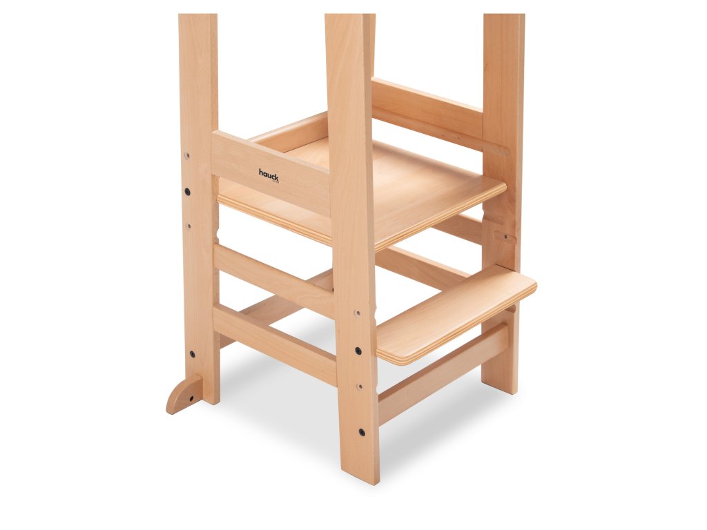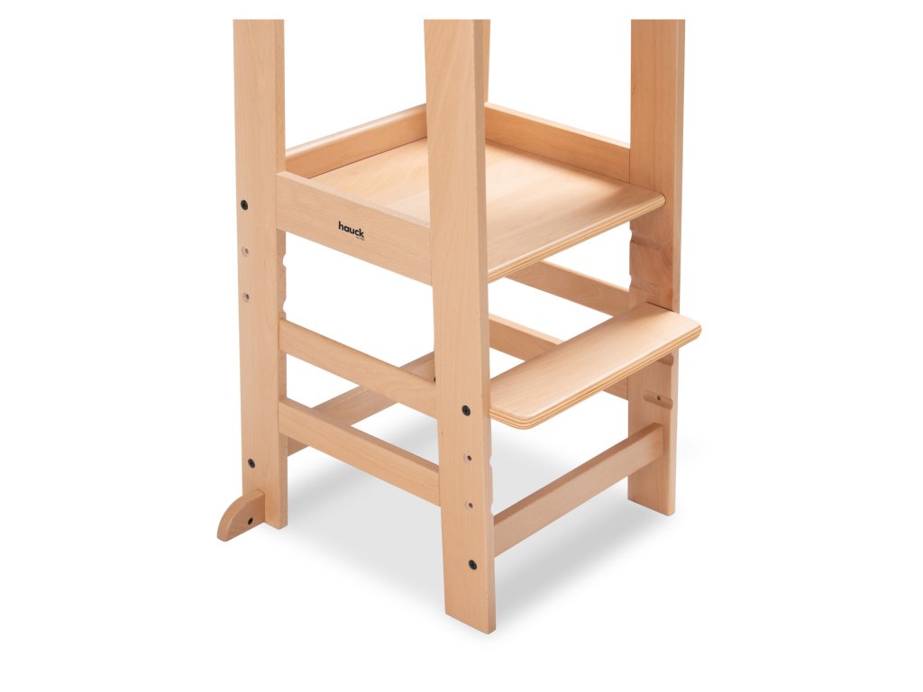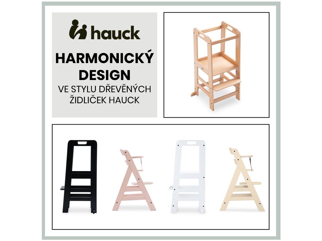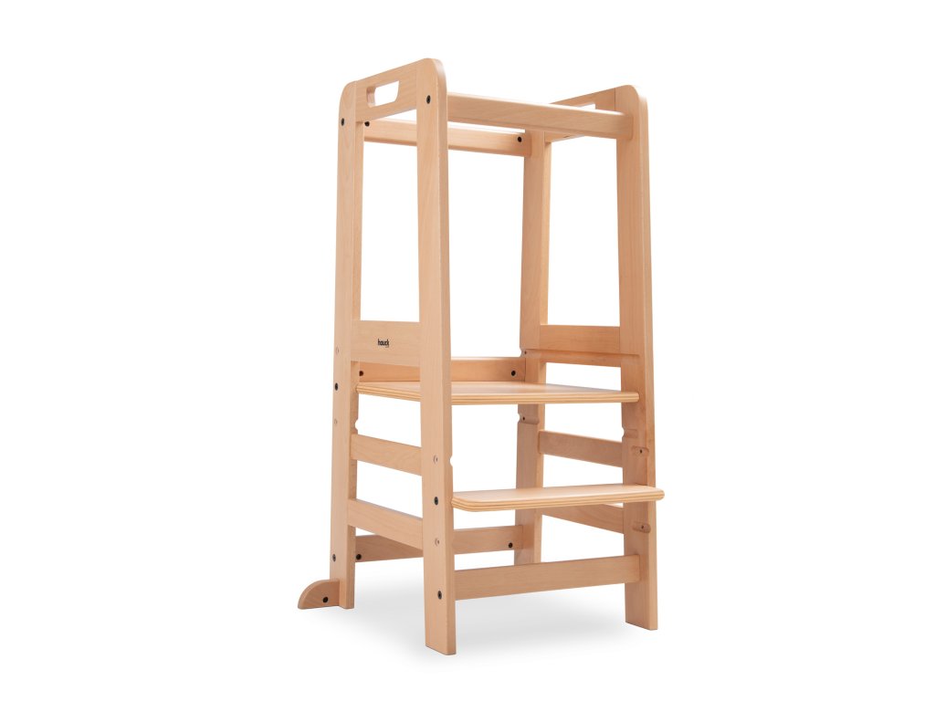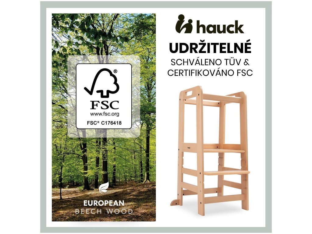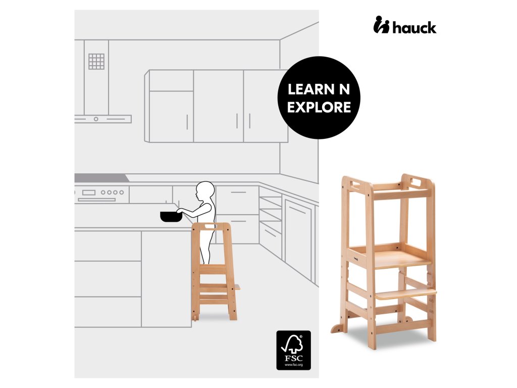 Učící věž Learn N Explore PARAMETRY: Hmotnost produktu: 7,85 kgHmotnost produktu s balením: 8,90 kgRozměry balení: 92,0 x 43,3 x 6,5 cmRozměry po sestavení: d. 54 x š. 46 x v. 90,5 cm Maximální nosnost: 40 kgVhodná pro děti: 1-6 let Nejdůležitější informace o produktu > Udržitelná Montessori učící věž; > Vaše dítě může být součástí rodinných aktivit; > Udržitelnost, schválení TÜV a certifikát FSC®; > Posiluje samostatnost vašeho dítěte; > Možnost růstu díky nastavitelné opěrce pod nohy; > Společník s dlouhodobou životností a stabilní konstrukcí; > Univerzální použití; > Snadná montáž, možnost nastavení výšky; > Design pro váš harmonický interiér; > Rostoucí, stabilní a universální; > Snadná a praktická manipulace v každodenním životě. Learn N Explore – Učící věž pro samostatné objevování Montessori učící věž - Udržitelná, certifikovaná FSC® Díky vyvýšené poloze stupínku se může vaše dítě zapojit do běžných rodinných aktivit a pomáhat vám, bezpečně ve výšce očí. V duchu Montessori "Pomoz mi, abych to dokázal sám" se vaše dítě od útlého věku zapojuje formou hry, např. do vaření nebo pečení, a posiluje tak svou samostatnost, jazykový a sociální rozvoj i sebevědomí. Učící Věž pro batolata hauck má certifikát FSC®, což znamená, že bukové dřevo pochází z lesů s certifikátem FSC a šetrným lesním hospodářstvím. Rostoucí, stabilní a univerzální věž V závislosti na velikosti vašeho dítěte můžete nastavit nožní desku kuchyňského pomocníka do tří různých výšek. Robustní a stabilní konstrukce umožňuje vašemu dítěti používat Montessori věž až do hmotnosti 40 kg, ať už v kuchyni, u jídelního stolu nebo u umyvadla v koupelně. Jednoduchá, praktická a bezpečná manipulace Šrouby a nářadí jsou součástí balení. Plošinu pro nohy lze snadno nastavit pomocí dvou šroubů. Tvar a design dřevěných schůdků je proveden ve stejném vzhledu jako dřevěné židličky hauck, pro váš harmonický interiér. PÉČE & ÚDRŽBA : Čistěte pomocí vlhčeného hadříku Materiál: bukové dřevo: 74 %, železo (šrouby a matice): 3 %, překližka: 23 %Doplňkové parametry