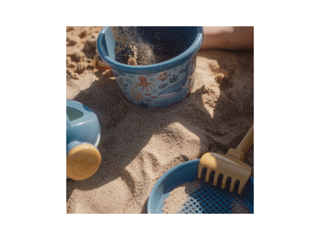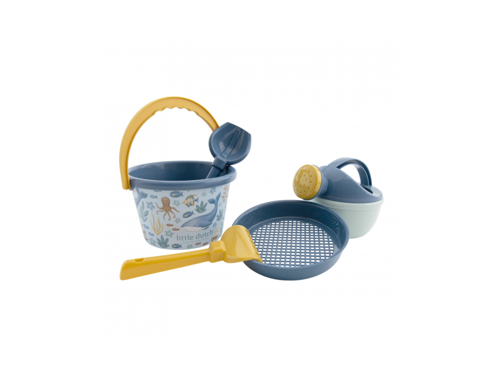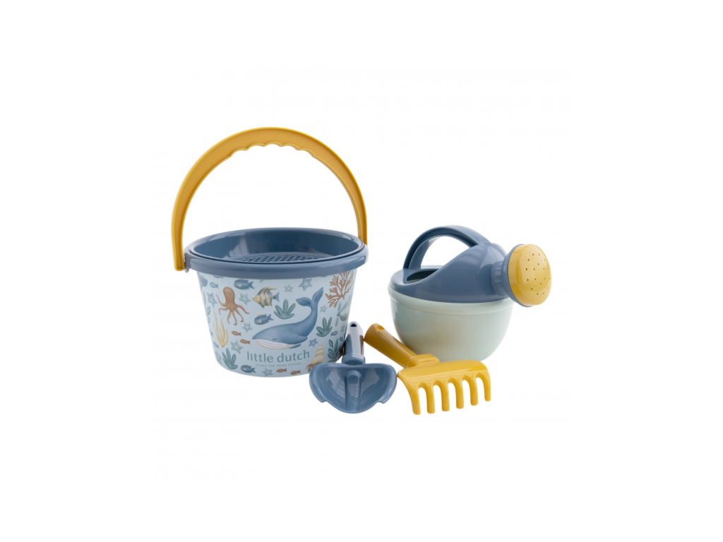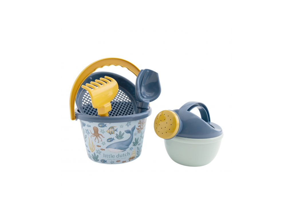 Sada na písek s krásným potiskem motivů ze života pod mořskou hladinou se bude dětem hodit doma na zahradě i u moře na pláži. Sadu tvoří kyblík, konvička, hrabičky, lopatka a sítko v kvalitním provedení z pevného plastu. Sada je součástí designové kolekce Little Dutch Ocean World. Vhodné pro děti od 18 měsíců.Doplňkové parametry