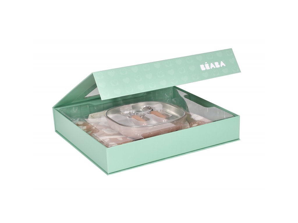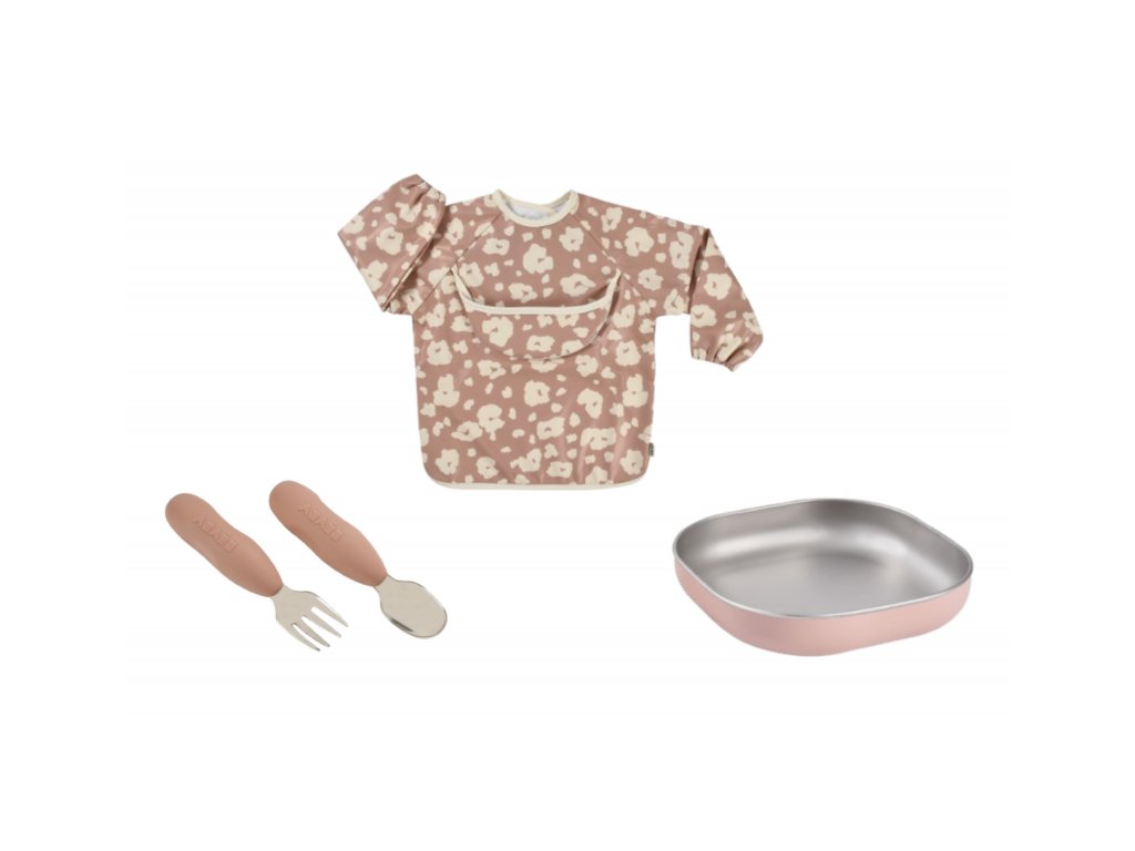 Jídelní sadu pro nejmenší tvoří nerezový talíř se silikonovou povrchovou vrstvou, ergonomická tréninková lžička a vidlička a bryndák s odepínacími rukávy a kapsou na drobky. Krásnou krabičku, ve které je sada zabalená můžete používat i jako krabičku na drobnosti. Ergonomický tvar talíře s vysokými stranami a zaoblenými rohy je ideální pro učení dětí samostatnému stolování. Silikonový povrch nádobí pomáhá, aby nádobí neklouzalo na stole ani v ruce. Nerezová ocel je odolný materiál bez chemikálií, který neovlivňuje chuť ani vůni pokrmu. Lžička a vidlička byly vyvinuty ve spolupráci se specialistou na dětské krmení. Krátká, zaoblená rukojeť sedí do malých ruček, mělká lžička pomáhá nabírat přiměřené množství a vidlička se zaoblenými hroty je zcela bezpečná. Kombinace silikonu a nerezu dělá z příboru dlouhodobého pomocníka pro rozvoj samostatnosti. Bryndák s odnímatelnými dlouhými rukávy chrání oblečení nejen při jídle, ale i při tvoření. Je nastavitelný (3 úrovně patentek), má elastické manžety a díky odepínacím rukávům ho snadno proměníte na variantu s krátkými rukávy. Nechybí skládací kapsa na zachytávání drobků a spadlého jídla. Omyvatelný lehký myteriál se snadno čistí. Talíř je vhodný do mikrovlnné trouby, talíř i příbory jsou vhodné do myčky. Vhodné pro děti od 4 měsíců.Doplňkové parametry