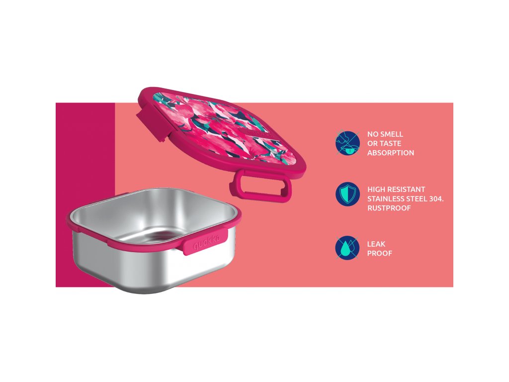 Box na jídlo Quokka Kai z vysoce kvalitní nerezové oceli s plastovým víkem je vhodný pro bezpečné přenášení svačiny či oběda do školy, do práce i na výlety. Spolehlivé, 100% těsnicí víko s klipovým zapínáním chrání obsah boxu před vylitím či vysypáním. Nerezový materiál neabsorbuje pachy a je tak vhodný pro jakékoli jídlo. Objem: 1 l Rozměry: 180 x 165 x 68,5 mm Složení: nerezová ocel, PP Neobsahuje BPA. Box není vhodný do myčky ani mikrovlnné trouby.
