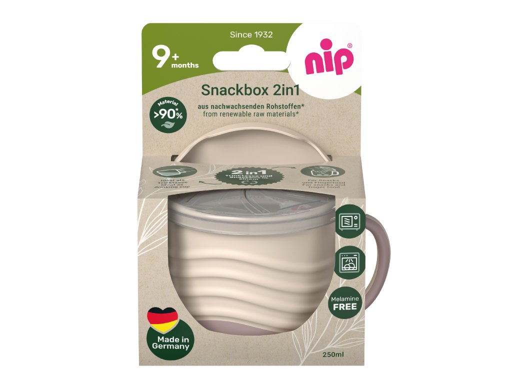 NIP GREEN line snackbox 2v1, 1ks2v1: Svačinková krabička a hrneček v jednom. Praktické pro skladování a přepravu malých svačinek. Lehké, odolné a nerozbitné, vhodné pro použití doma i na cestách.Přirozeně v zájmu životního prostředí – jen to nejlepší pro dětiZ pocitu odpovědnosti vůči budoucím generacím se zavazujeme zacházet s přírodou a jejími zdroji šetrně. Jsme přesvědčeni, že udržitelné výrobky pro děti mohou být praktické i krásné. Proto je vyrábíme v co největší míře z přírodních nebo obnovitelných surovin. Použité materiály jsou vědomě přizpůsobeny různým vlastnostem produktů. Série NATURE line od značky nip® se skládá z kombinace biokruhových a fosilních složek.SnackBox 2v1Svačinová krabička a nápojový pohárek v jednom.NOVINKA – Jemné barvy, decentní a trendyVzdělávací hodnota: Rozvíjí motorické dovednosti a schopnost uchopení2 v 1: Svačinková krabička a hrneček v jednomPraktické: Skladování a přeprava malých svačinek / „finger food“Všestranné: - Lehké, odolné a nerozbitné, vhodné pro použití doma i na cestách- Flexibilní a měkké silikonové víčko umožňuje snadné vyjímání svačinek po jednotlivých kusech, např. v autě nebo kočárku, a udržuje zbývající obsah ve svačinové krabičce- Extra víčko pro hygienické skladování + přepravu bez drobkůPro praktické skladování drobného občerstvení a svačinek.Podporuje samostatnost v papání.Přidaná hodnota: Lze později použít jako nápojový pohárek. S protiskluzovou rukojetí a protiskluzovou základnou.Vhodné pro děti od 9 měsíců.250 ml - perfektní objem pro děti.0% BPA.Bez obsahu PVC.Vhodné do mikrovlnné trouby i do myčky.Vyrobeno v Německu.Kolekce jídelní řady / vyrobeno z bioplastu s >90 % obnovitelných surovin (uhlovodíky a rostlinné oleje (bez palmového oleje))Obaly vyrobené z papíru s obsahem recyklovaného materiálu >85 %*Obsah uhlíku z biologických zdrojů podle normy ASTM D6866Doplňkové parametry