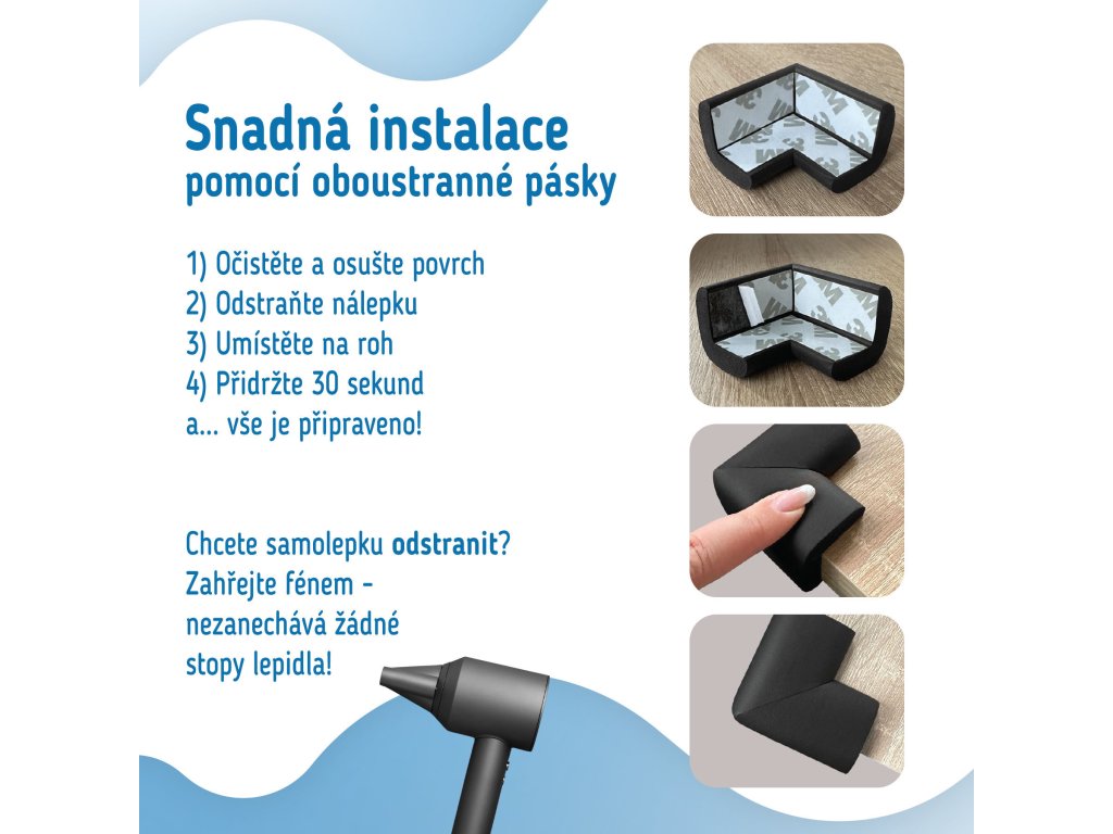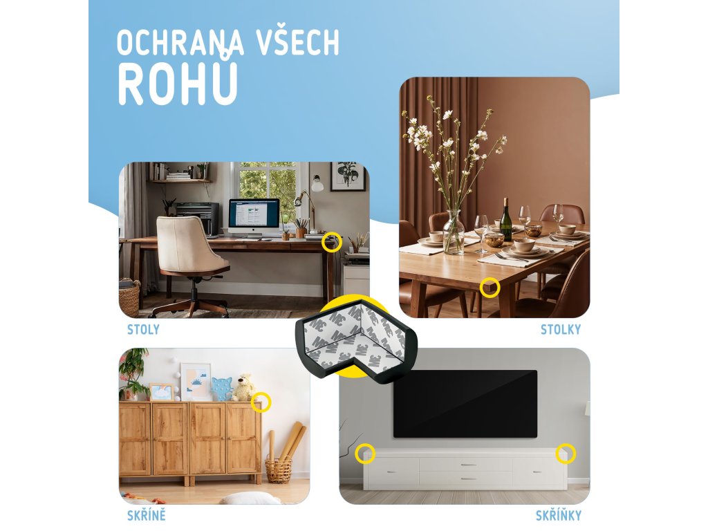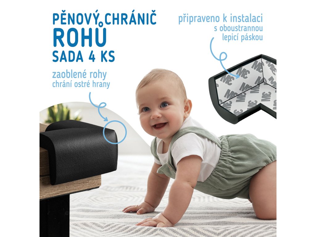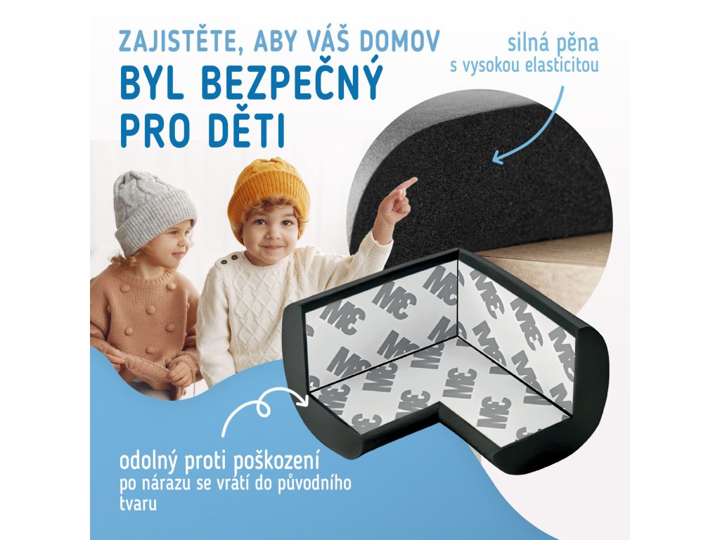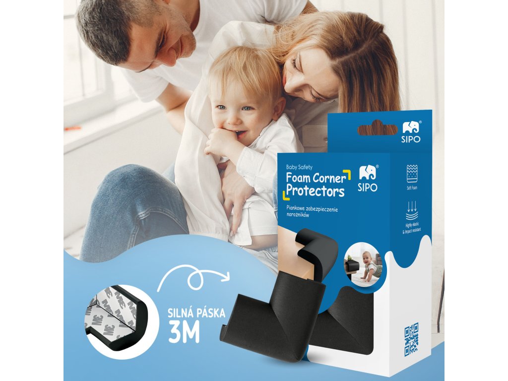 Sipo Sada 4ks měkká ochrana rohů a hranSipo sada 4ks pěnové ochrany rohů a hran pro bezpečnost vašich dětí. Pěnové chrániče rohů nábytku chrání děti před nárazy do ostrých rohů a hran. Jsou vyrobeny z měkké, pružné pěny, která absorbuje sílu nárazu, čímž snižuje riziko zranění.Ideální pro rodiče jejichž děti se teprve učí chodit, než děťátko získá dostatečnou stabilitu ve svých prvních krůčkách je velice náchylné k náhodnému pádu, a tudíž možnému středu s nábytkem, který může způsobit odřeniny nebo zranění.Pěnové rohy se velmi snadno používají. Chrániče jsou dodávány s páskou, díky níž je lze snadno připevnit na rohy nábytku, jako jsou stoly, židle, psací stoly, skříně apod. V závislosti na modelu mohou mít chrániče různé délky a tvary, aby vyhovovaly různým typům nábytku.Pěnové chrániče rohů nábytku jsou bezpečné pro děti a po použití se snadno odstraňují. Jsou k dispozici v různých barvách, což vám umožňuje sladit ochranu s vaším typem nábytku a výzdobou interiéru.BALENÍ OBSAHUJE:4ks ochrany rohů, uživatelská příručkaRozměr balení: 15x7.5x5 [CM]Hmotnost balení: 41 gPOPIS VÝROBKUOchranné rohy jsou široce používaný bezpečnostní prvek díky použitému materiálu a měkkosti. Lze je použít k ochraně desek stolů, skříní, schodů a všech dalších prvků, které mají ostré hrany a rohy a mohly by tak představovat bezpečnostní riziko pro vaše děti.POUŽITÍ1. Připravte si povrch, na který chcete zámek nalepit – před instalací se ujistěte, že je povrch čistý a suchý.2. Odlepte ochrannou pásku a nalepte pomůcku na předem označené místo. Pevně přitlačte, aby páska dobře přilnula k povrchu.3. Před užitím nechte pásku dobře přilnout k povrchu nábytku - přibližně 24 hodin.4. Užívejte si bezpečí svého dítěte!DŮLEŽITÉ: Výrobek není hračka, může obsahovat malé části. Udržujte mimo dosah dětí mladších 3 let. Bezpečnost vašeho dítěte je nejdůležitější, proto byste měli děti vždy chránit před nebezpečím. Zajistěte místa, která mohou dítě vystavit nebezpečí nebo způsobit zbytečná zranění.DOPLŇUJÍCÍ INFORMACE: Vždy postupujte podle přiložených pokynů. Pomůcka je určena pro domácí použití. Nepoužívejte výrobek jiným způsobem, než pro jaký byl určen a jaký je popsán v přiložených pokynech. Výrobce neodpovídá za škody vzniklé v důsledku použití výrobku v rozporu s jeho určením. Upozorňujeme, že některé děti mohou ochranu odstranit. Z tohoto důvodu doporučujeme pravidelně kontrolovat stav bezpečnostní pomůcky.MATERIÁL: NBR* PĚNA (PRYŽ)Co znamená NBRNBR = butadien-akrilonitrilový kaučuk, synteticky vyrobený, alternativa přírodního kaučuku. Vulkanizací kaučuku vzniká pryž.Typické vlastnosti NBR+ vysoká odolnost vůči olejům, tukům, nepolárním* kapalinám (benzín, nafta, letecká paliva), derivátům minerálních olejů+ vysoká pevnost v tahu+ nízké bobtnání+ vysoká odolnost vůči opotřebení a trvalé deformaci+ použití od – 10 °C až do + 100 °C (vyšší odolnost vůči horku než SBR**); pryž odolná transformátorovému oleji vydrží až + 120 °C+ odolnost vůči přirozenému a tepelnému stárnutíCZ) DŮLEŽITÉ: PŘED POUŽITÍM SI POZORNĚ PŘEČTĚTE PŘILOŽENÉ INFORMACE K POUŽITÍ, ABYSTE SE VYHNULI MOŽNÝM NEBEZPEČÍM PŘI POUŽÍVÁNÍ VÝROBKU A USCHOVEJTE JE PRO PŘÍPADNÉ DALŠÍ POUŽITÍ.UPOZORNĚNÍ: PŘED POUŽITÍM ODSTRAŇTE A ZLIKVIDUJTE PŘÍPADNÉ PLASTOVÉ SÁČKY A VŠECHNY ČÁSTI OBALU TOHOTO VÝROBKU NEBO JE ALESPOŇ UCHOVEJTE MIMO DOSAH DĚTÍ. DOPORUČUJEME TYTO ČÁSTI VYHODIT DO TŘÍDĚNÉHO ODPADU V SOULADU S PLATNÝMI VYHLÁŠKAMI A NAŘÍZENÍMI.VÝROBCE: SIPO Sp. z o.o., ul. Gen. Mariana Langiewicza 18, 35-021 Rzeszów, POLAND, www.sipo.com.pl, t. +48 791 494 260, e. sipo@sipo.com.plDistributor pro CZ&SK / Distribútor pre CZ&SK: Bohemia Baby s.r.o., Lidická 481, 273 51 Unhošť, email: sales@bohemiababy.cz / www.bohemiababy.cz / www.b2b.bohemiababy.cz / www.bohemiababyshop.czDoplňkové parametry